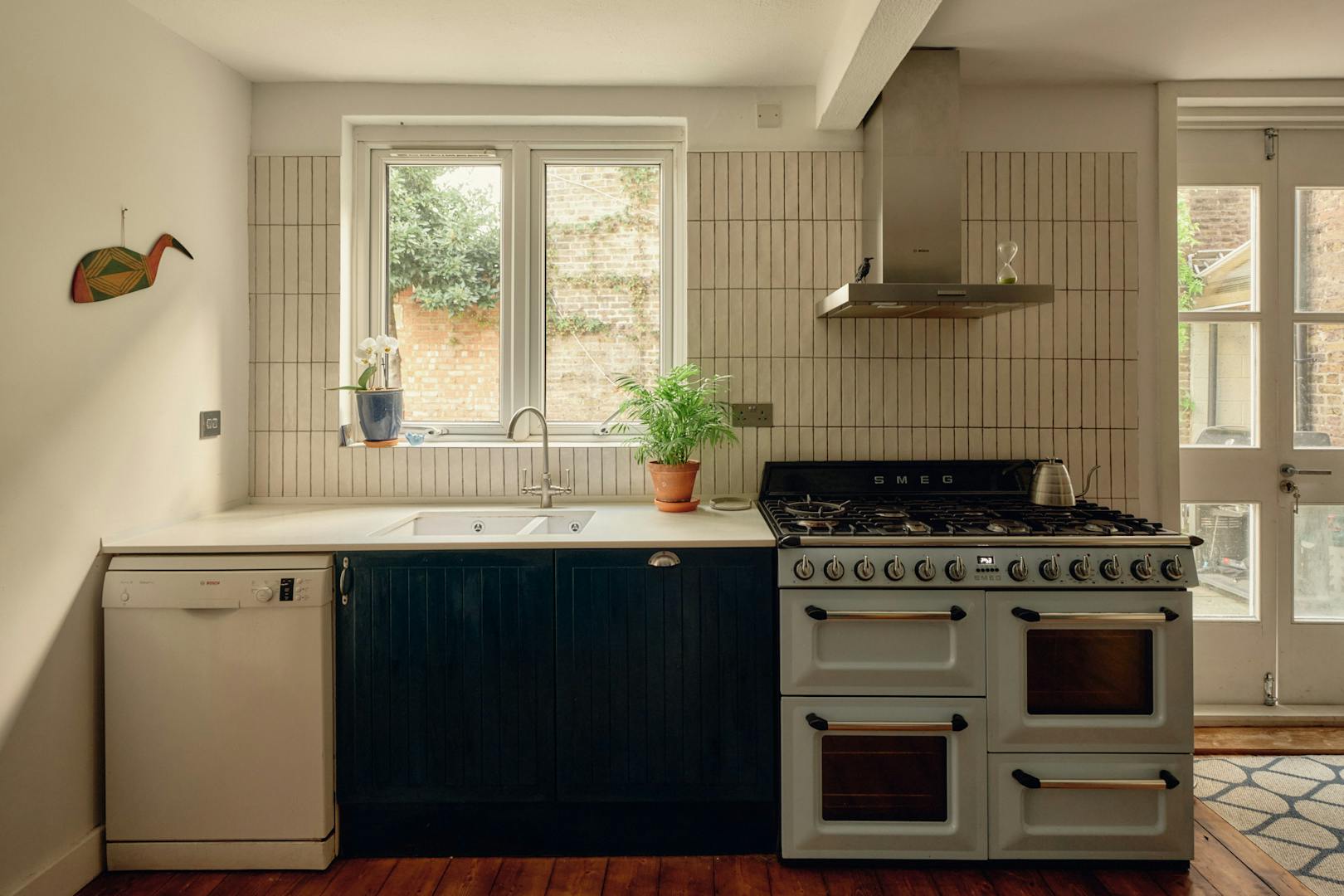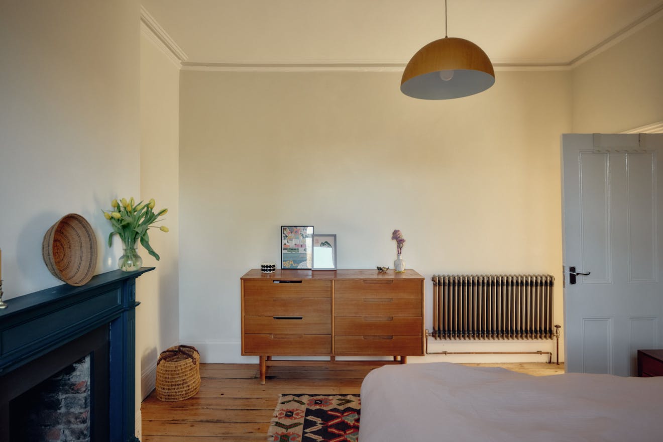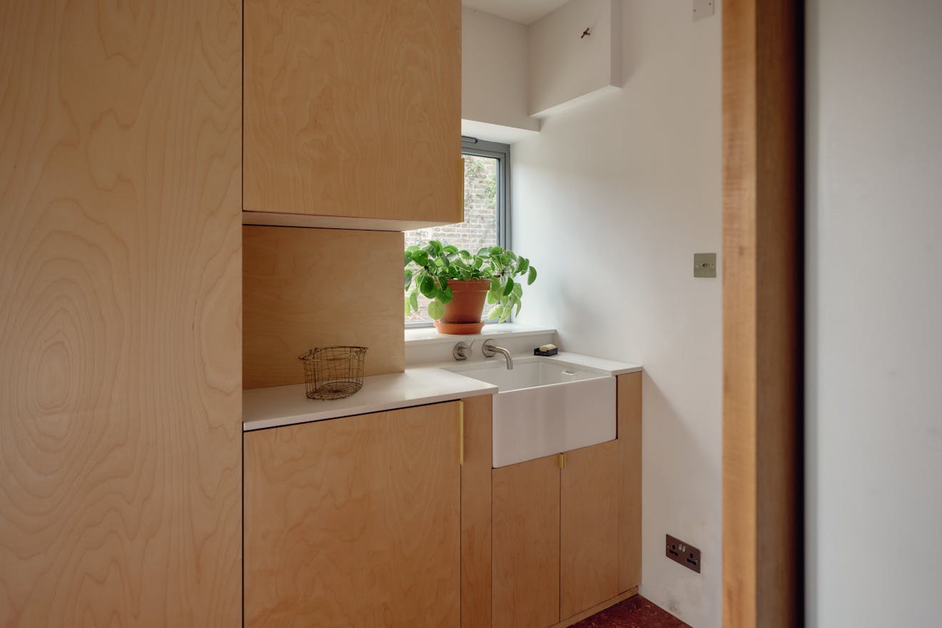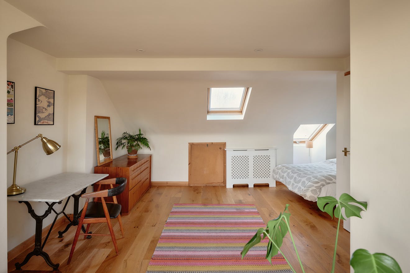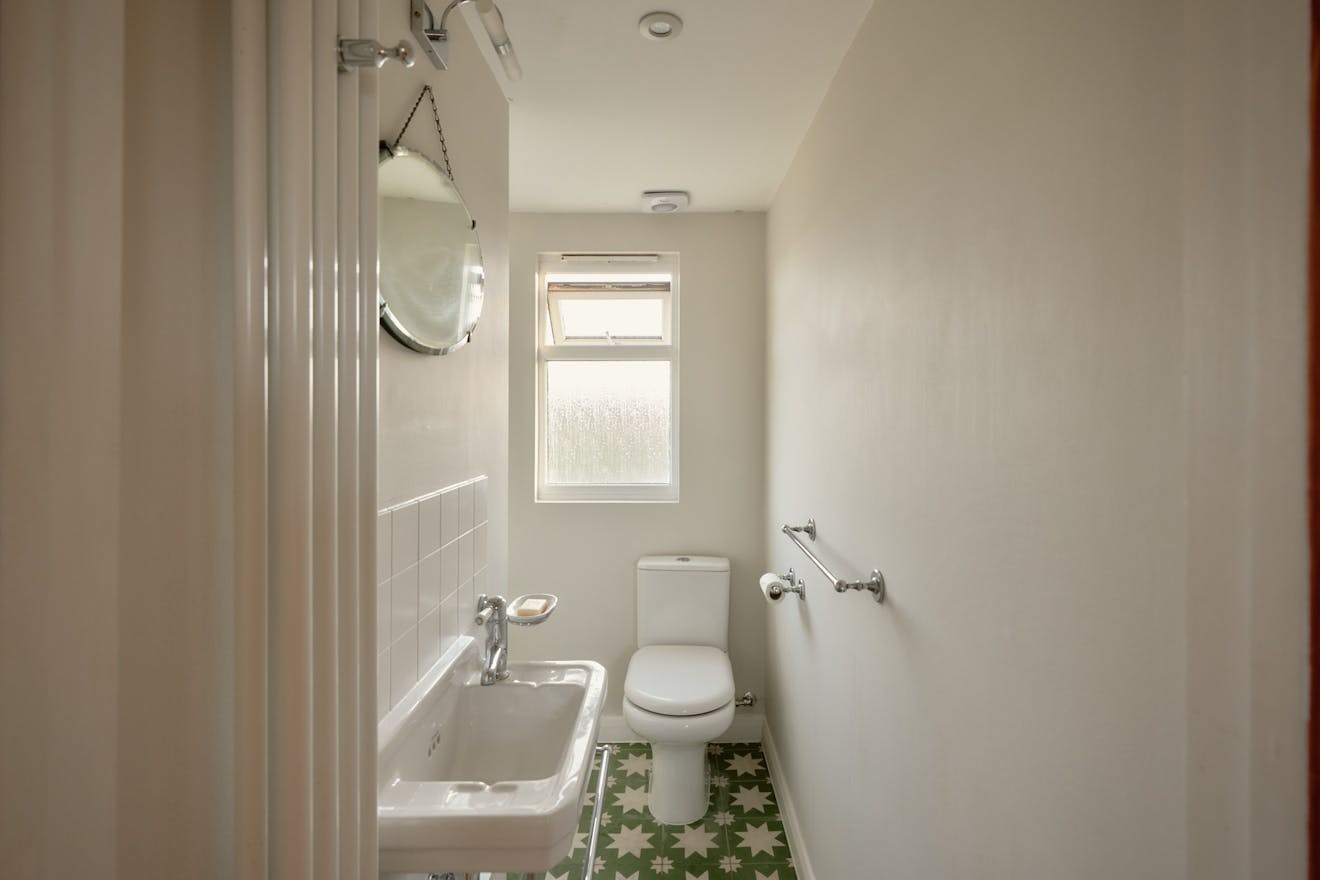 Elsewhere, original features are thoughtfully balanced with contemporary interventions. A navy Shaker-style kitchen, complete with a SMEG range cooker, leads through to a light-filled extension, where custom-made birch plywood joinery in the utility room provides generous storage alongside a butler sink and terrazzo tiling. From here, sliding doors open directly onto the garden, with an additional shower room neatly tucked to the side.