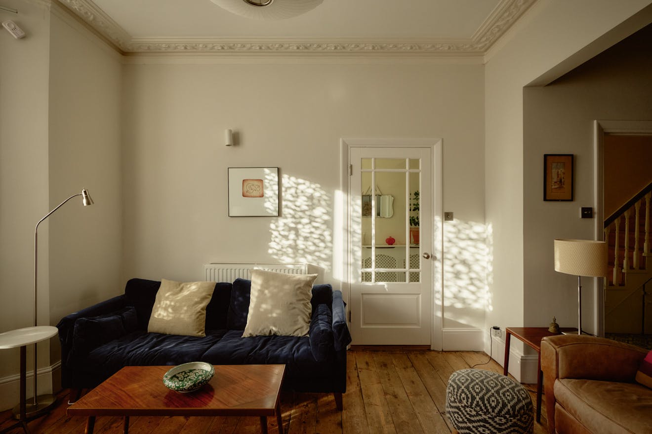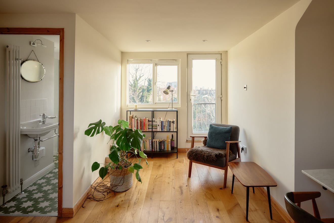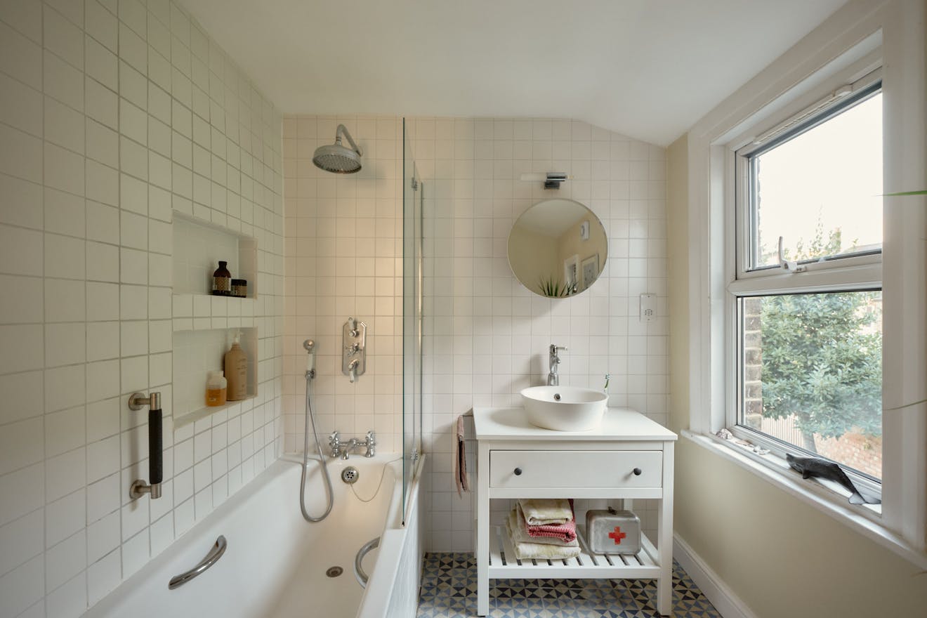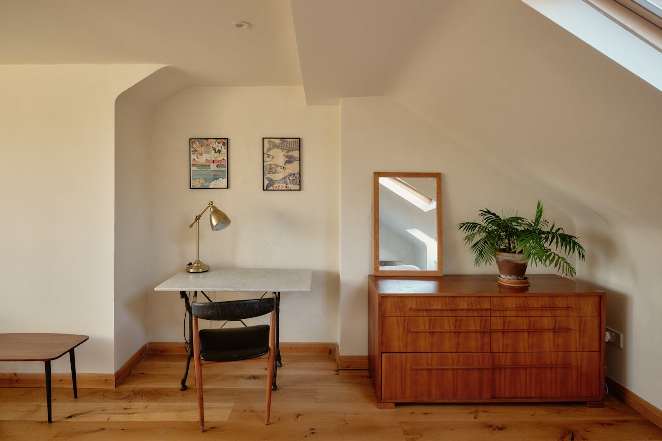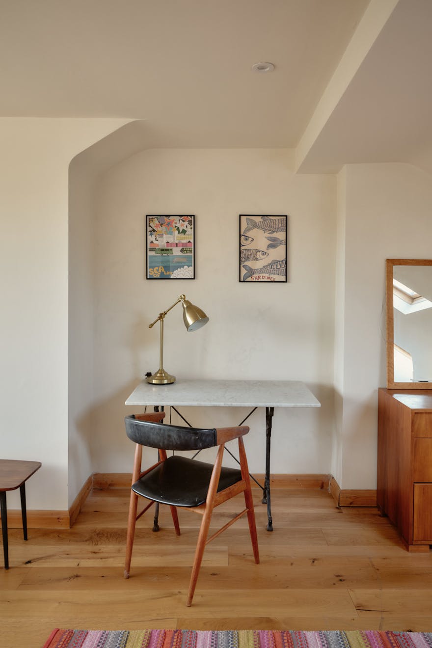 Elsewhere, original features are thoughtfully balanced with contemporary interventions. A navy Shaker-style kitchen, complete with a SMEG range cooker, leads through to a light-filled extension, where custom-made birch plywood joinery in the utility room provides generous storage alongside a butler sink and terrazzo tiling. From here, sliding doors open directly onto the garden, with an additional shower room neatly tucked to the side.