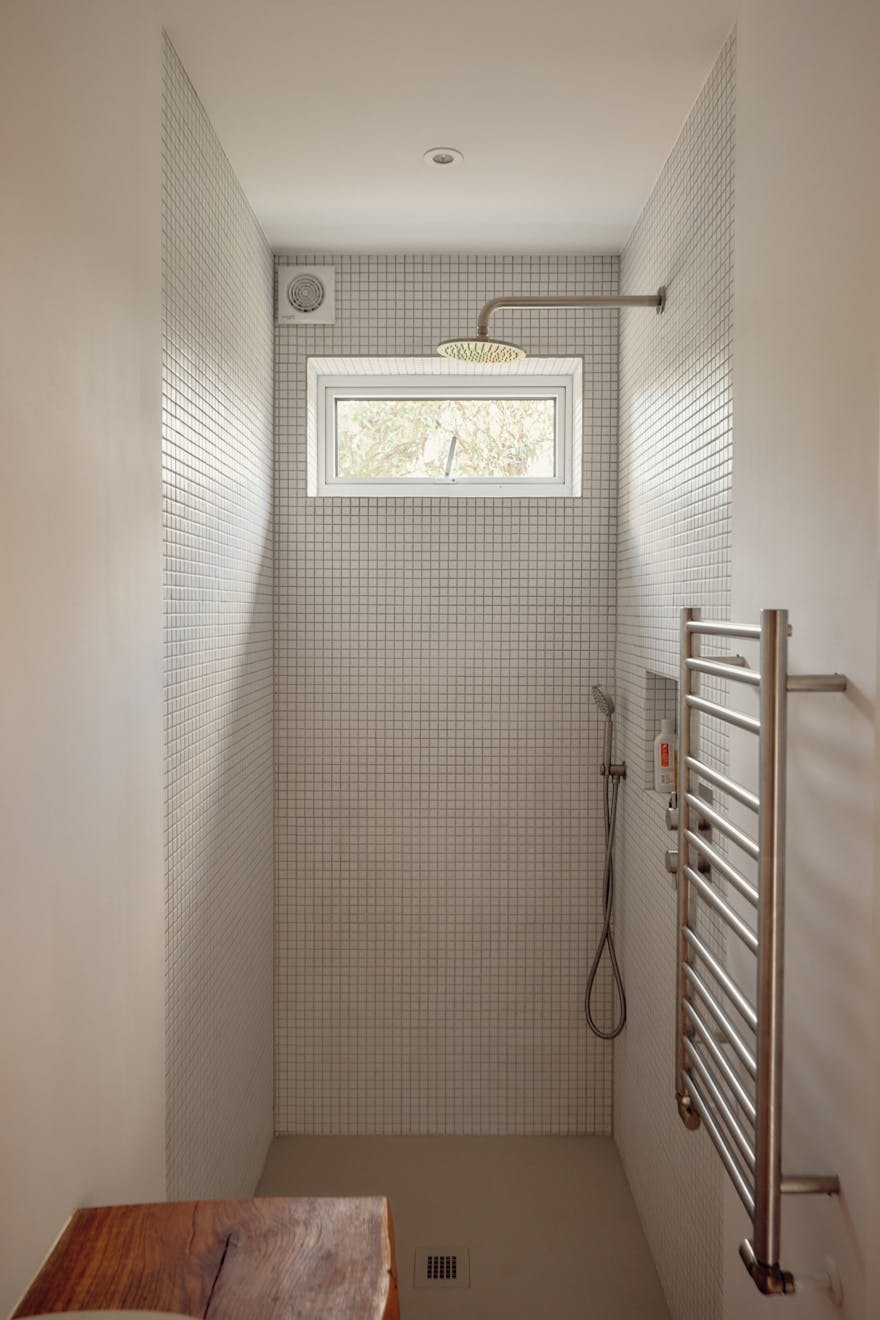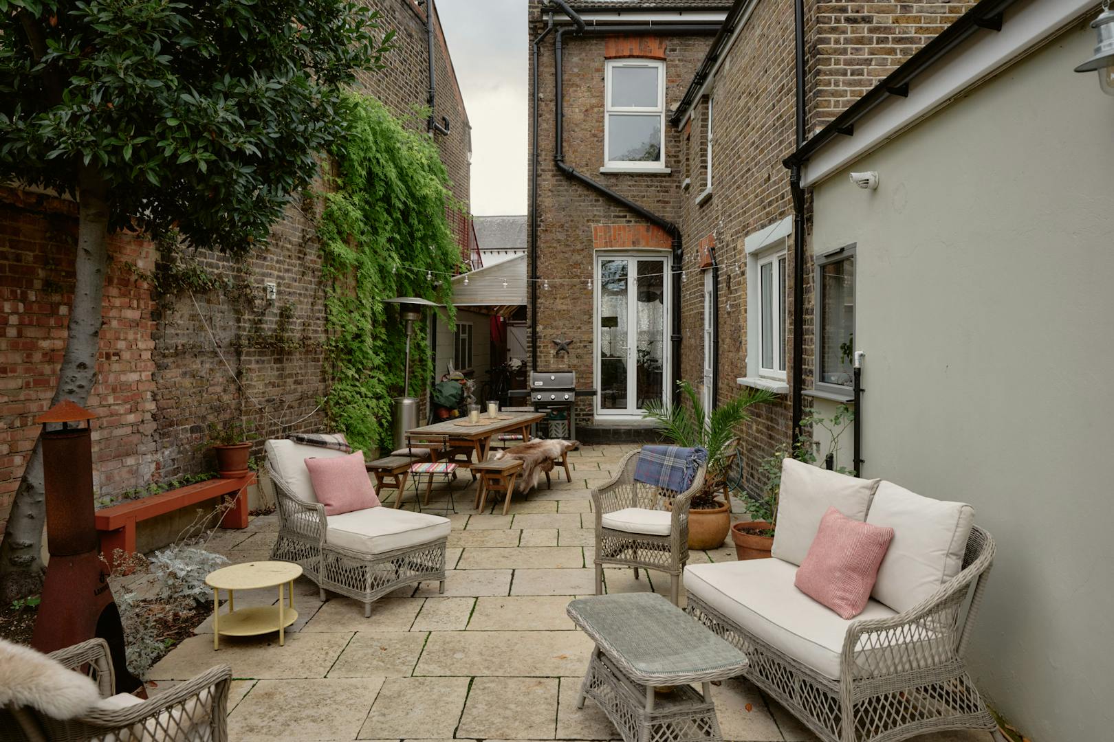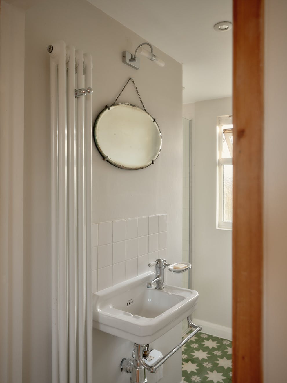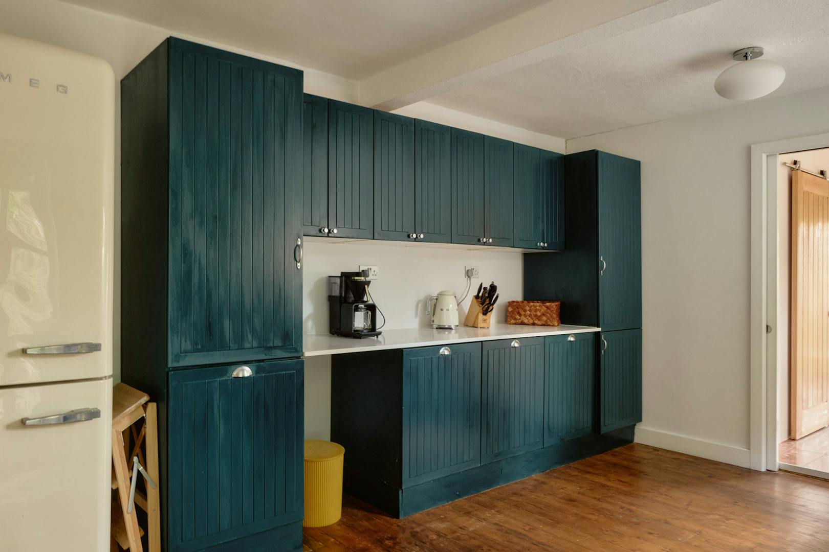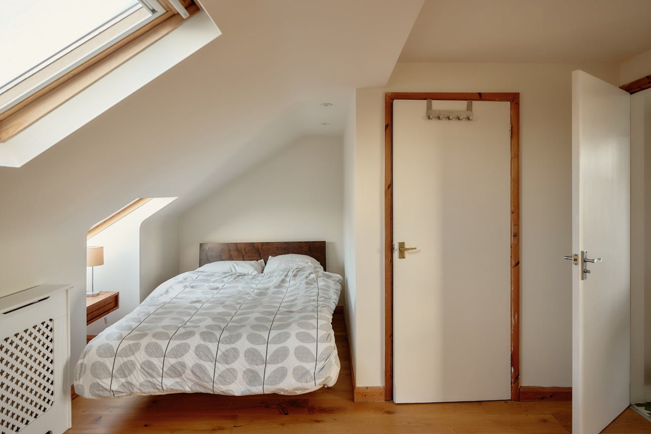Elsewhere, original features are thoughtfully balanced with contemporary interventions. A navy Shaker-style kitchen, complete with a SMEG range cooker, leads through to a light-filled extension, where custom-made birch plywood joinery in the utility room provides generous storage alongside a butler sink and terrazzo tiling. From here, sliding doors open directly onto the garden, with an additional shower room neatly tucked to the side.