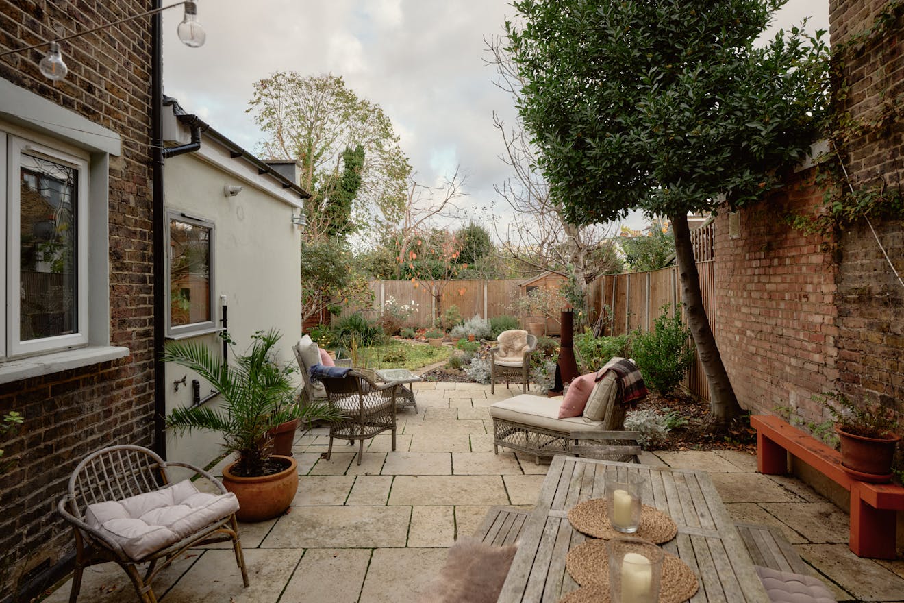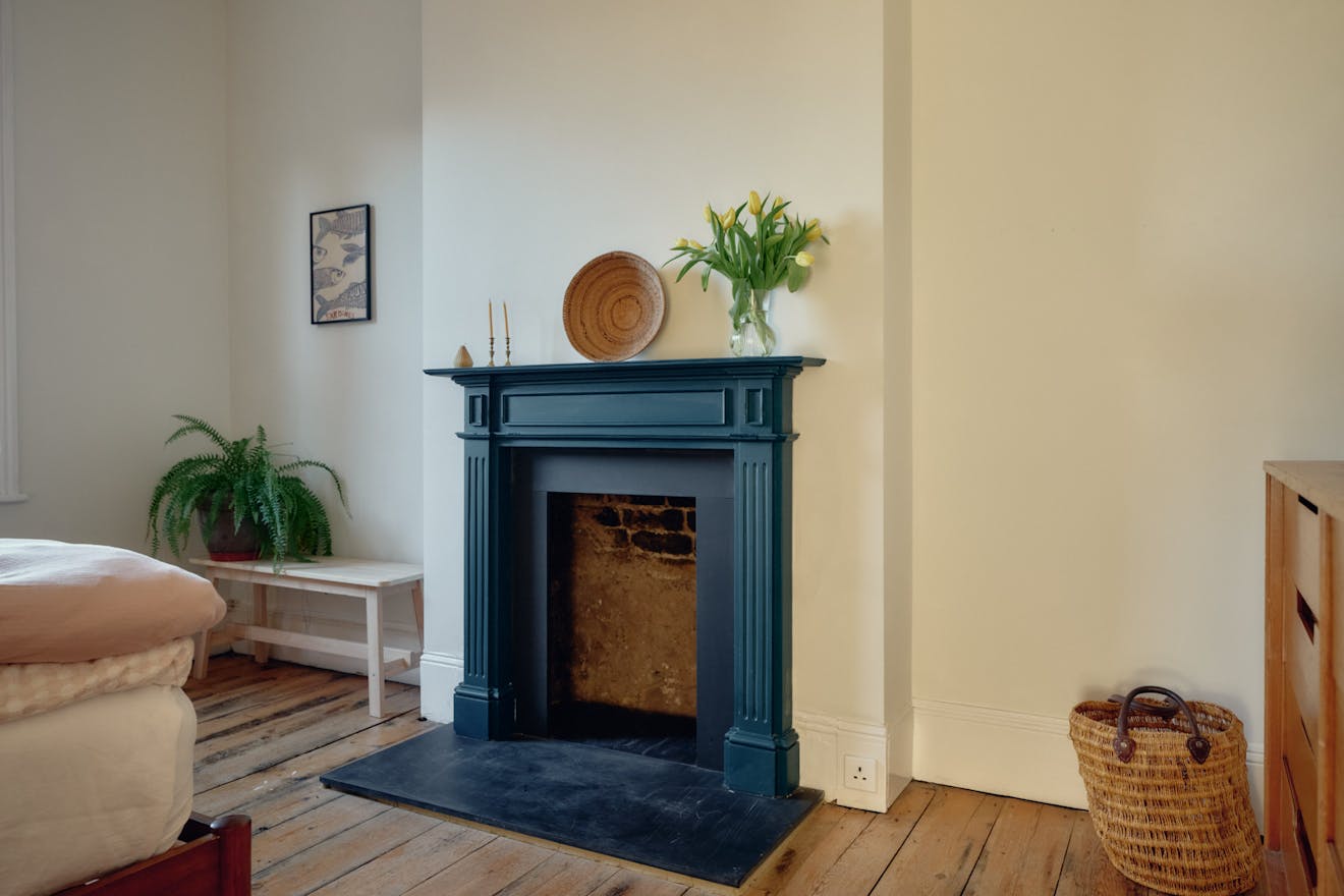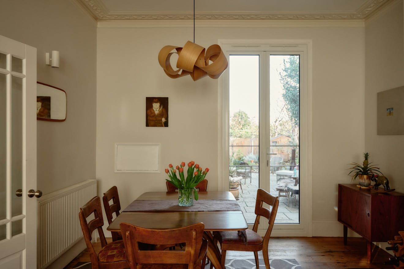 Inside, original features take centre stage in the hallway, where oak floorboards run underfoot and decorative corbels nod to the home’s historic past. The reception room has a calming palette with large sash windows drawing in warm westerly light. A handsome, 19th Century marble ‘Pompadour’ fireplace with a log-burning stove forms a characterful focal point, while elegant cornices and ceiling roses trace the perimeter of the rooms. From here, French doors open the living area out to the garden, creating an easy dialogue between inside and out. In the warmer months, the house transforms when all three garden access points are opened, enabling a smooth flow through the home and out to the patio.