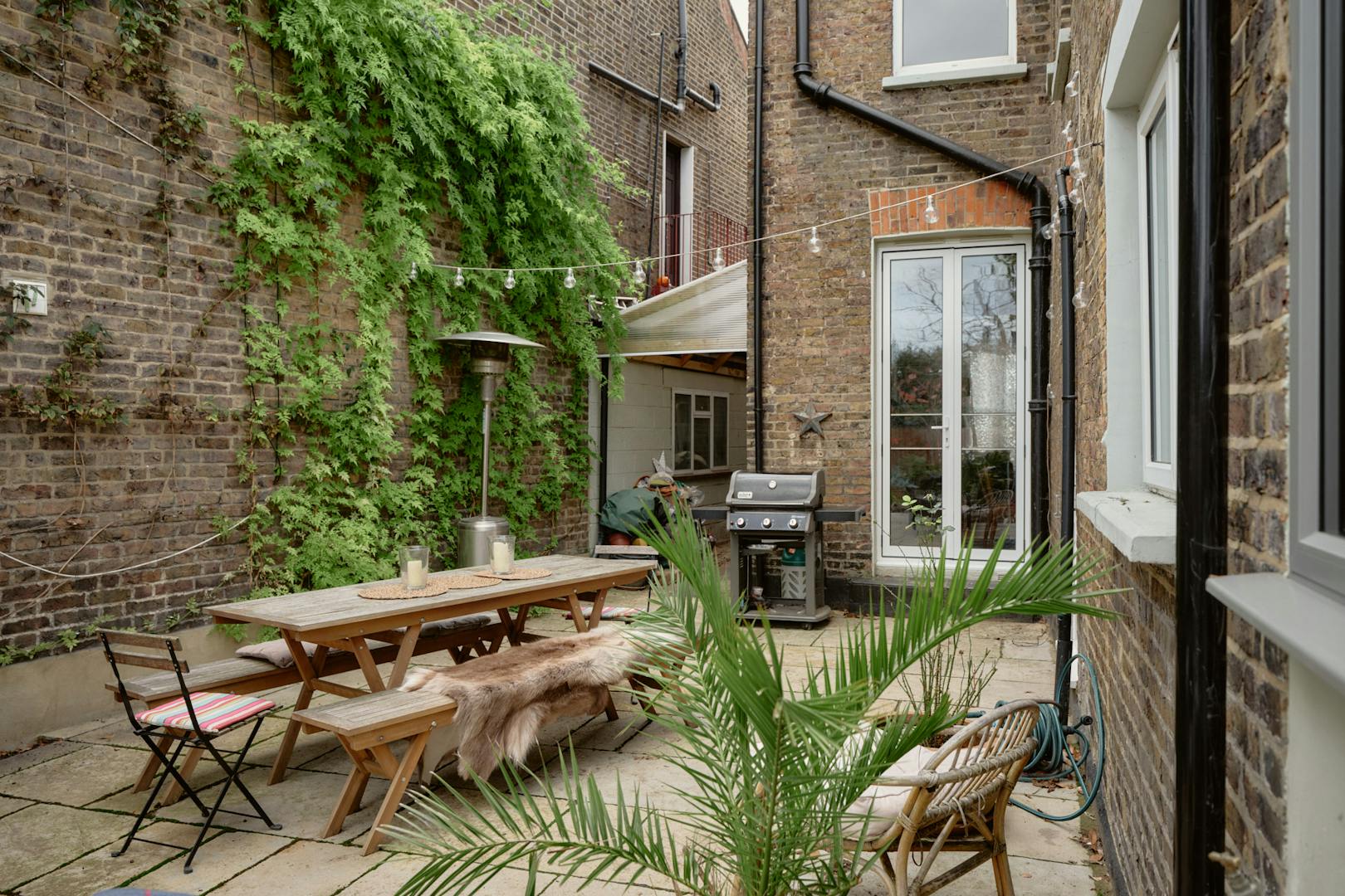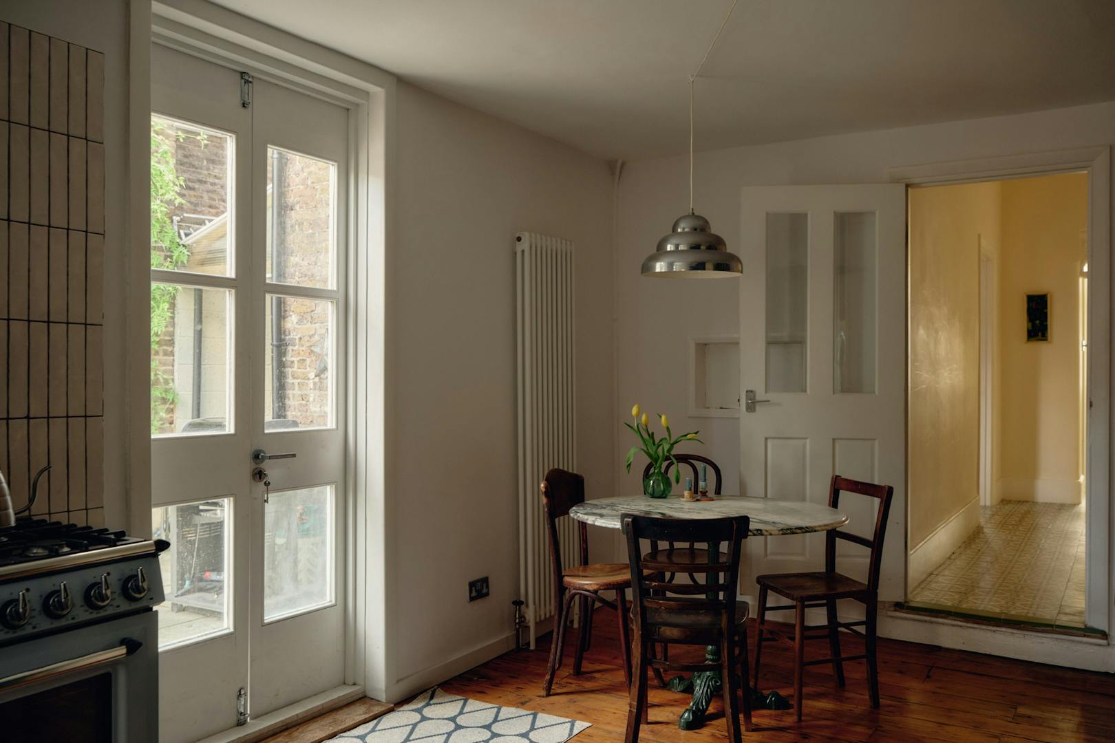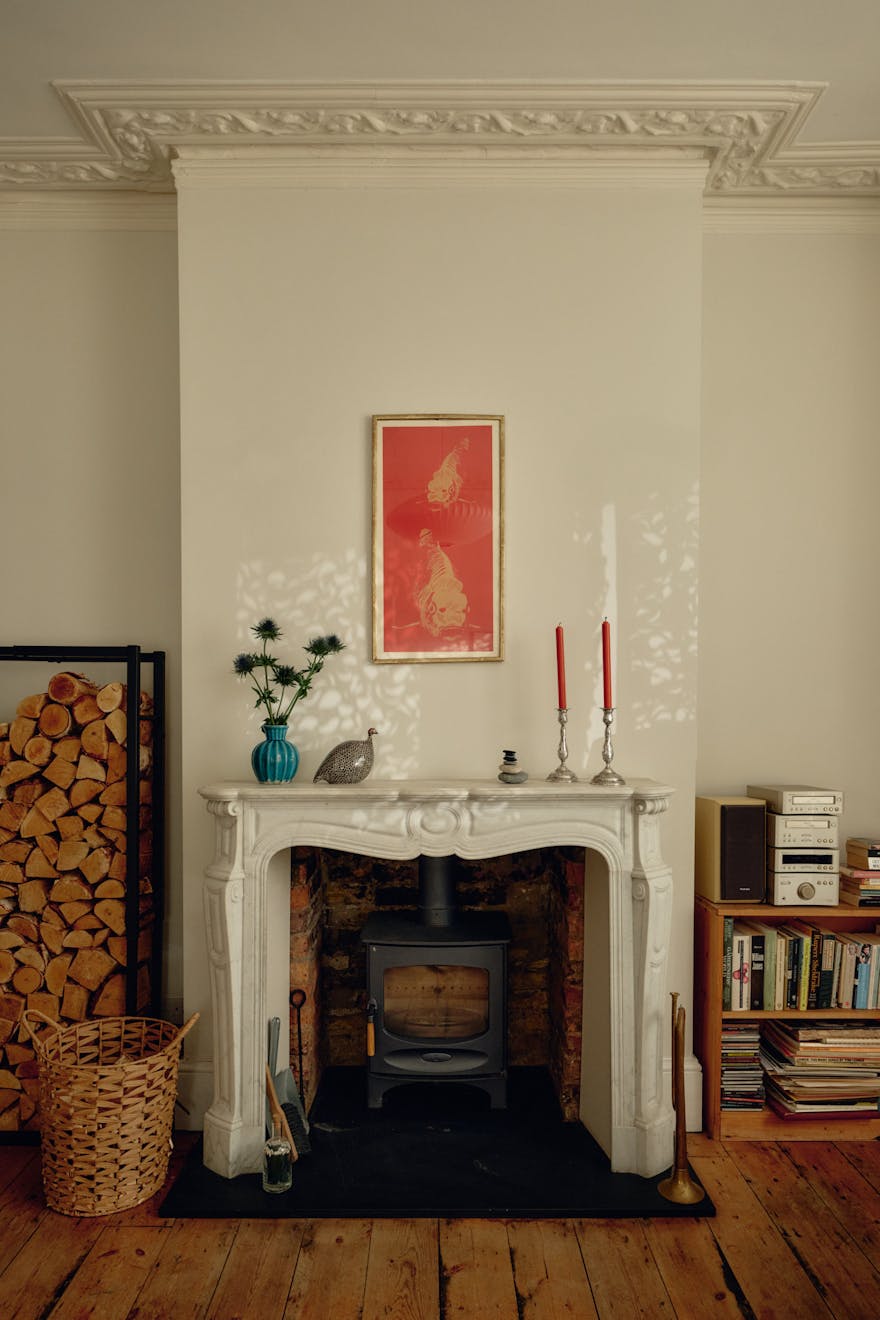Inside, original features take centre stage in the hallway, where oak floorboards run underfoot and decorative corbels nod to the home’s historic past. The reception room has a calming palette with large sash windows drawing in warm westerly light. A handsome, 19th Century marble ‘Pompadour’ fireplace with a log-burning stove forms a characterful focal point, while elegant cornices and ceiling roses trace the perimeter of the rooms. From here, French doors open the living area out to the garden, creating an easy dialogue between inside and out. In the warmer months, the house transforms when all three garden access points are opened, enabling a smooth flow through the home and out to the patio.