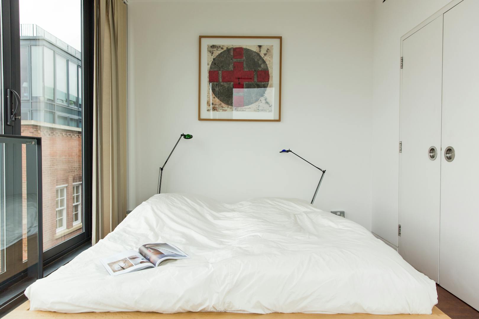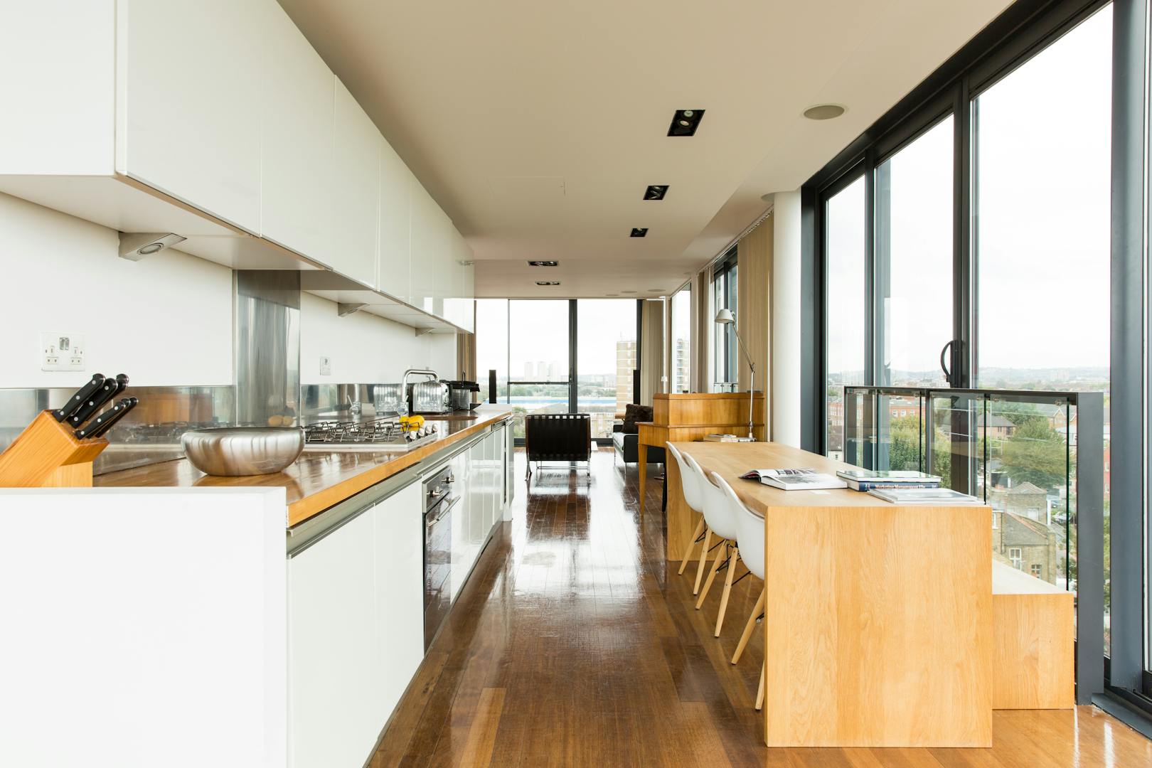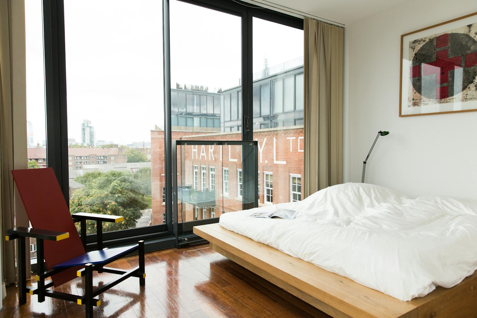 Located in a modern addition to the building, the apartment is a glass and metal mass that appears to balance delicately on top of the original Victorian red-brick factory, cantilevered over the far end. Measuring approximately 1360 sq ft in total, the main living area is an impressive, 45 foot open-plan space, including kitchen, with wooden floors throughout. Wherever you happen to be in this room, the views are spectacular – made possible by the remarkable amount of glazing. From here a staircase offers access to the roof terrace, through an electronic skylight. Once up on the roof, the 400 sq ft (approx) decked terrace offers views stretching out across the city. Downstairs on the lower level there are two double bedrooms both with floor-to-ceiling windows on two sides, offering even more great views. There’s also two bathrooms and plenty of storage. The flat itself is on the fifth and sixth floors of the building, and is accessed via a lift. The Jam Factory has a 24hr concierge, secure bike parking, communal gardens and a children’s playground. There are residents parking spaces available or there are spaces available to rent or to buy (by separate negotiation) in an underground car park in the development.