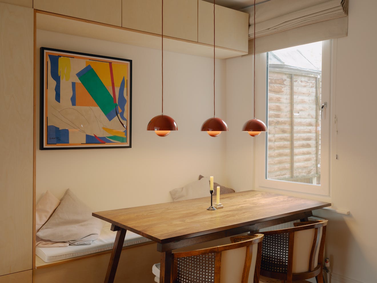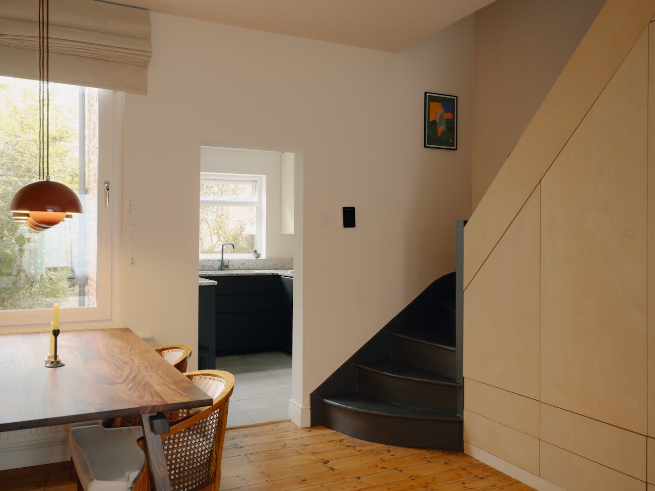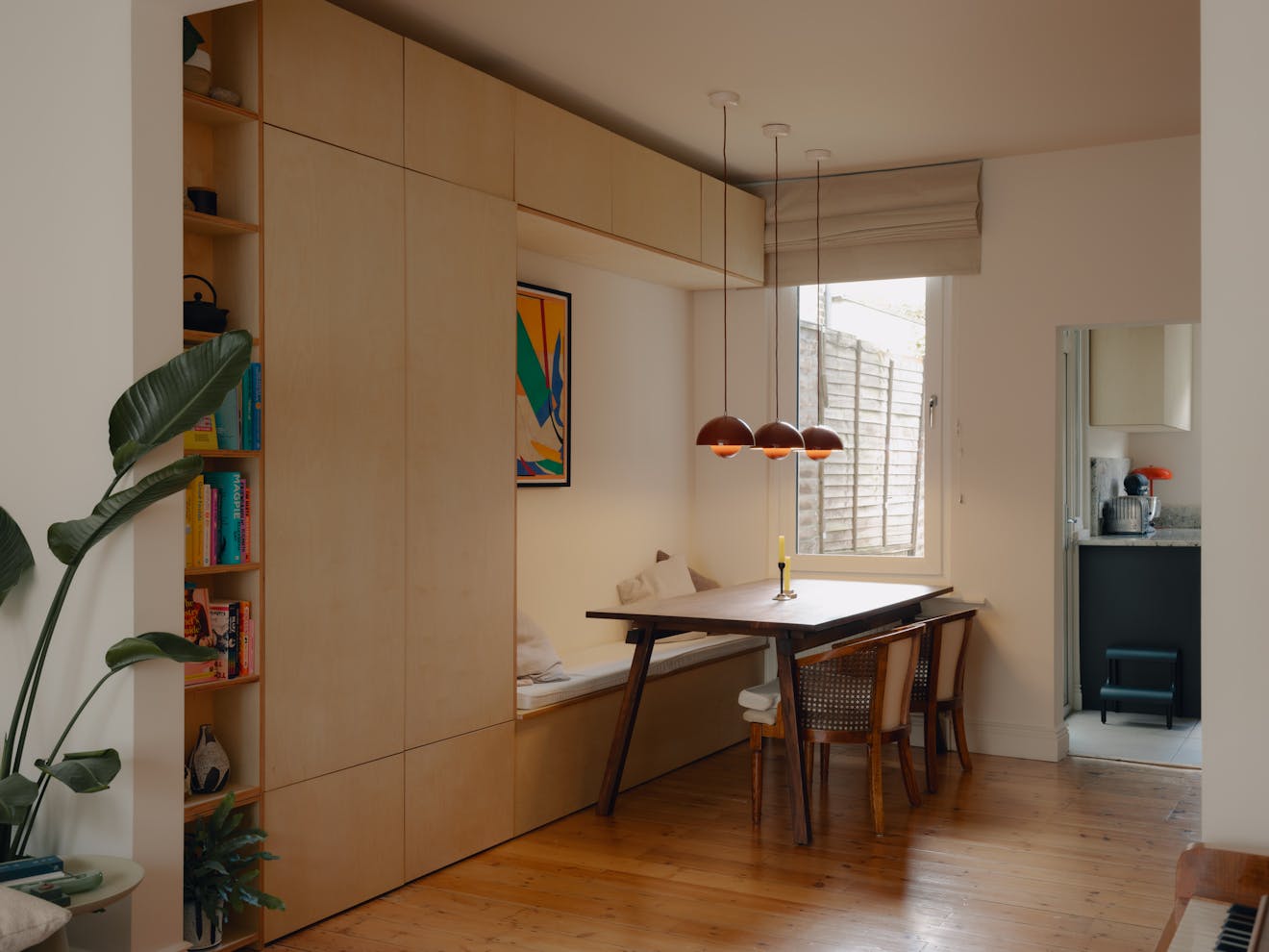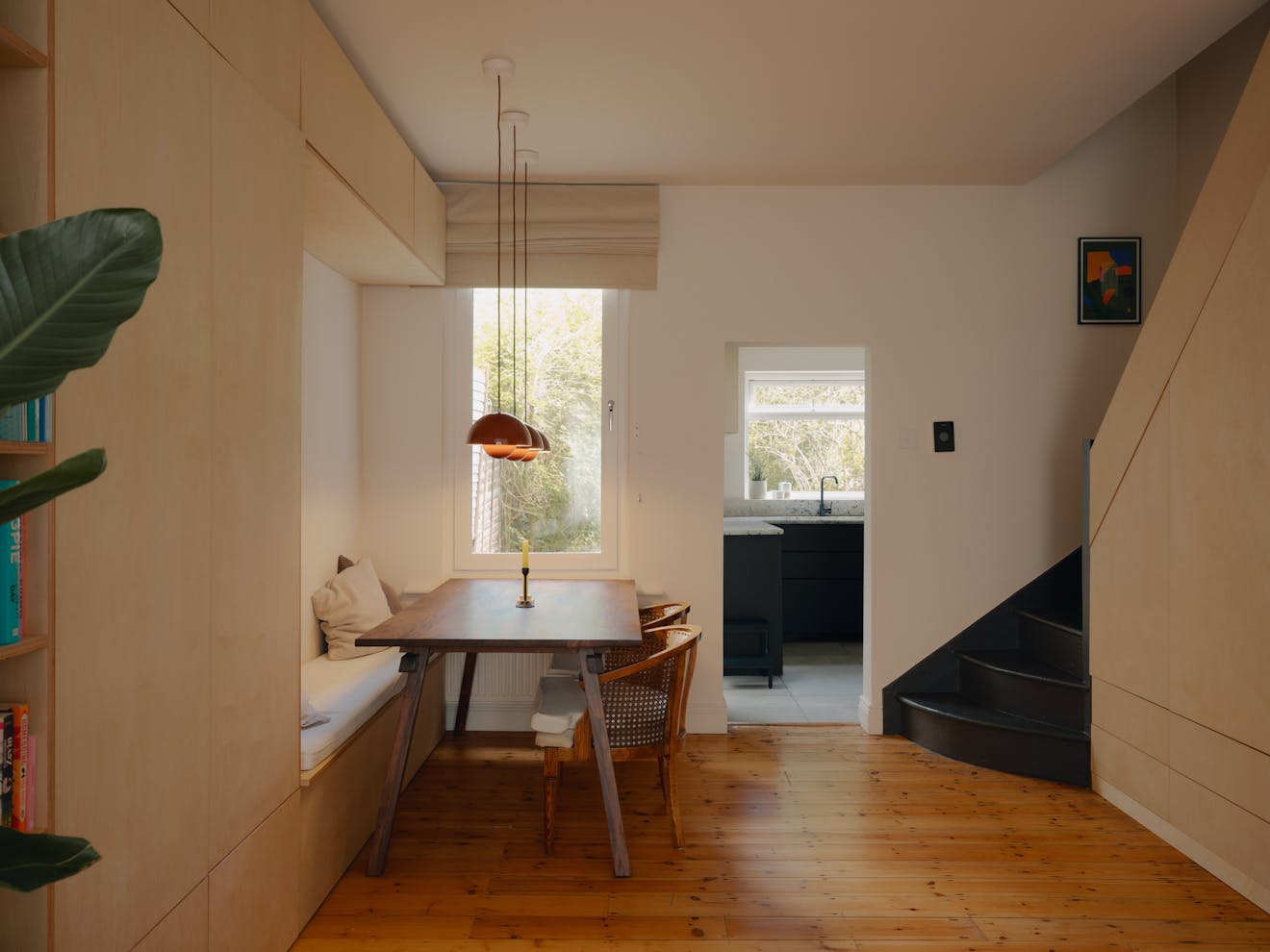 The entire dining area has been redesigned with custom-made, full-height birch plywood storage, which extends into feature bench seating, where the dining table is positioned under a trio of lights. Soft push, handleless units keep the design in line with the clean, modern finish experienced throughout. There is well-placed shelving, under-stair and bench storage, views into the garden via a picture window and a continuation of the pine flooring from the living room.