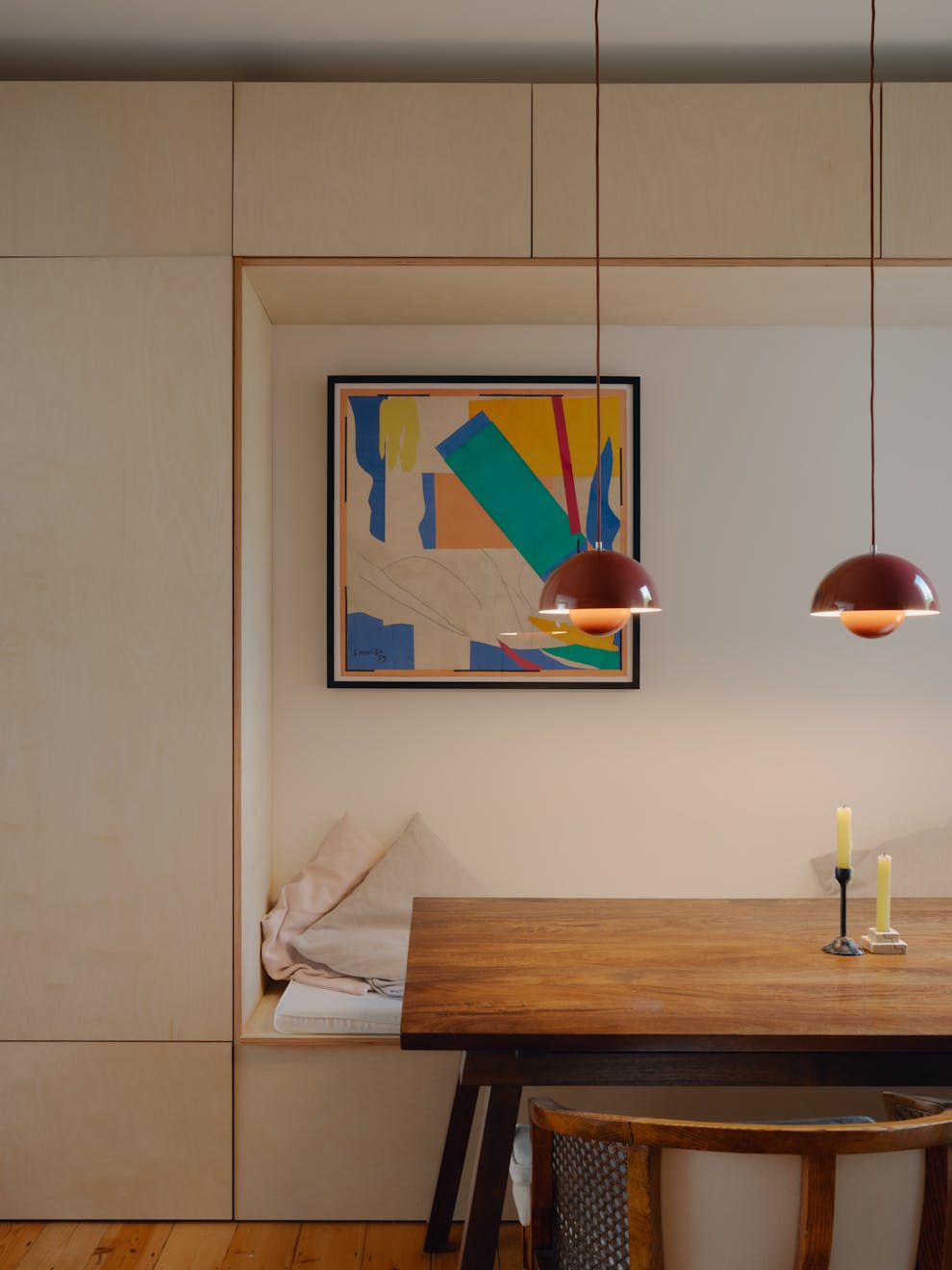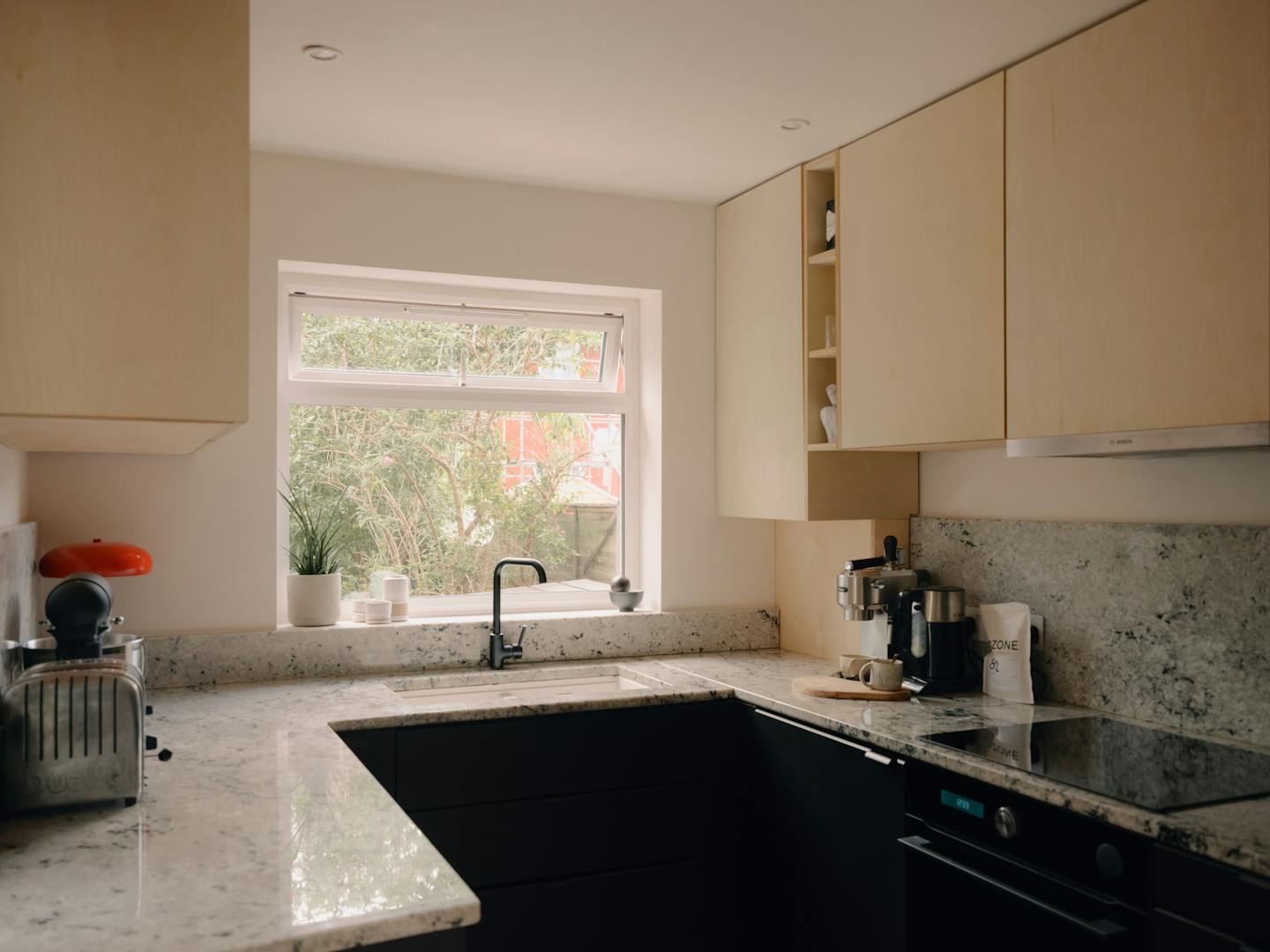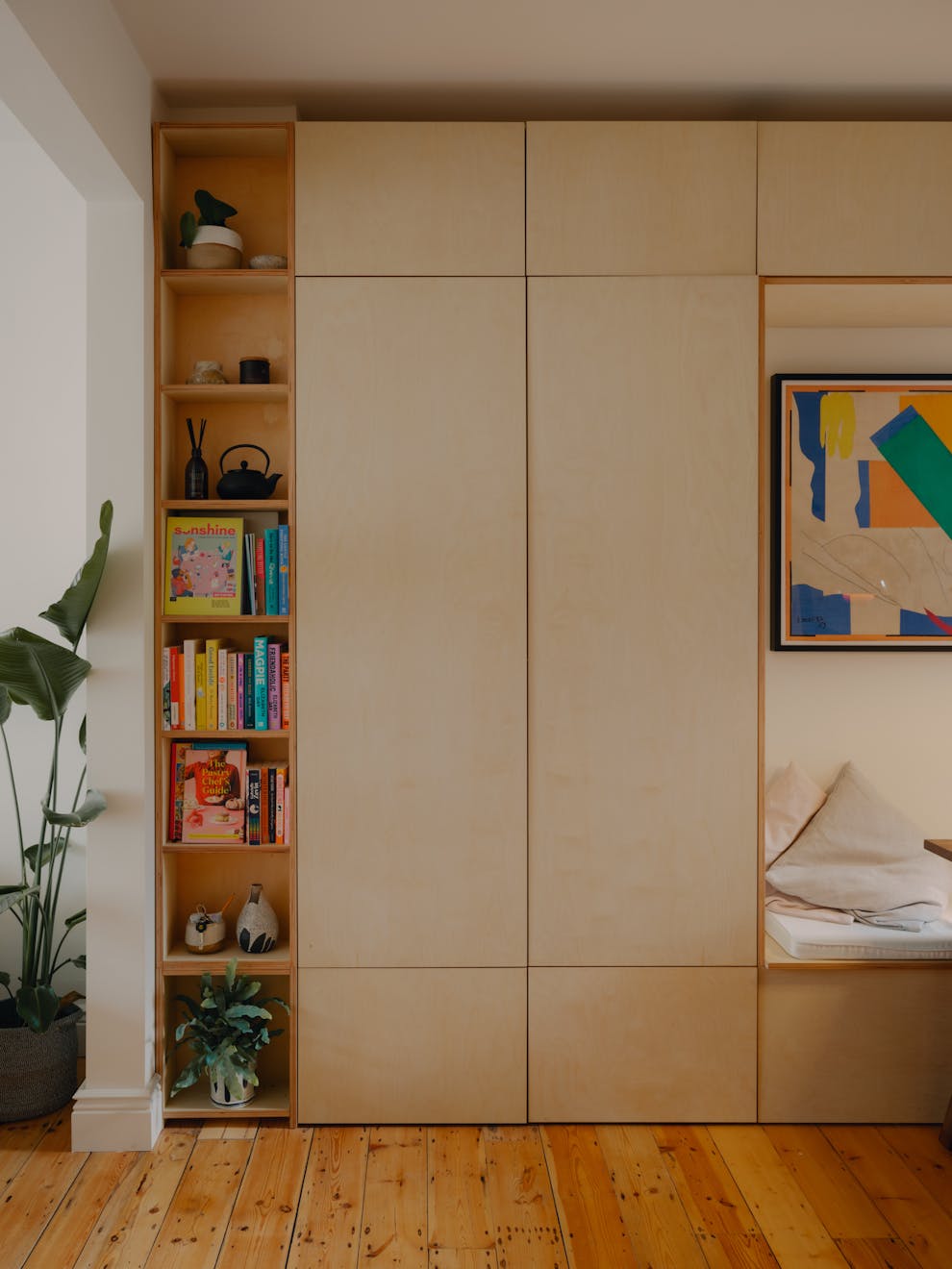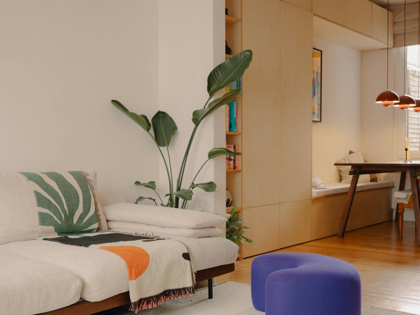 The entire dining area has been redesigned with custom-made, full-height birch plywood storage, which extends into feature bench seating, where the dining table is positioned under a trio of lights. Soft push, handleless units keep the design in line with the clean, modern finish experienced throughout. There is well-placed shelving, under-stair and bench storage, views into the garden via a picture window and a continuation of the pine flooring from the living room.