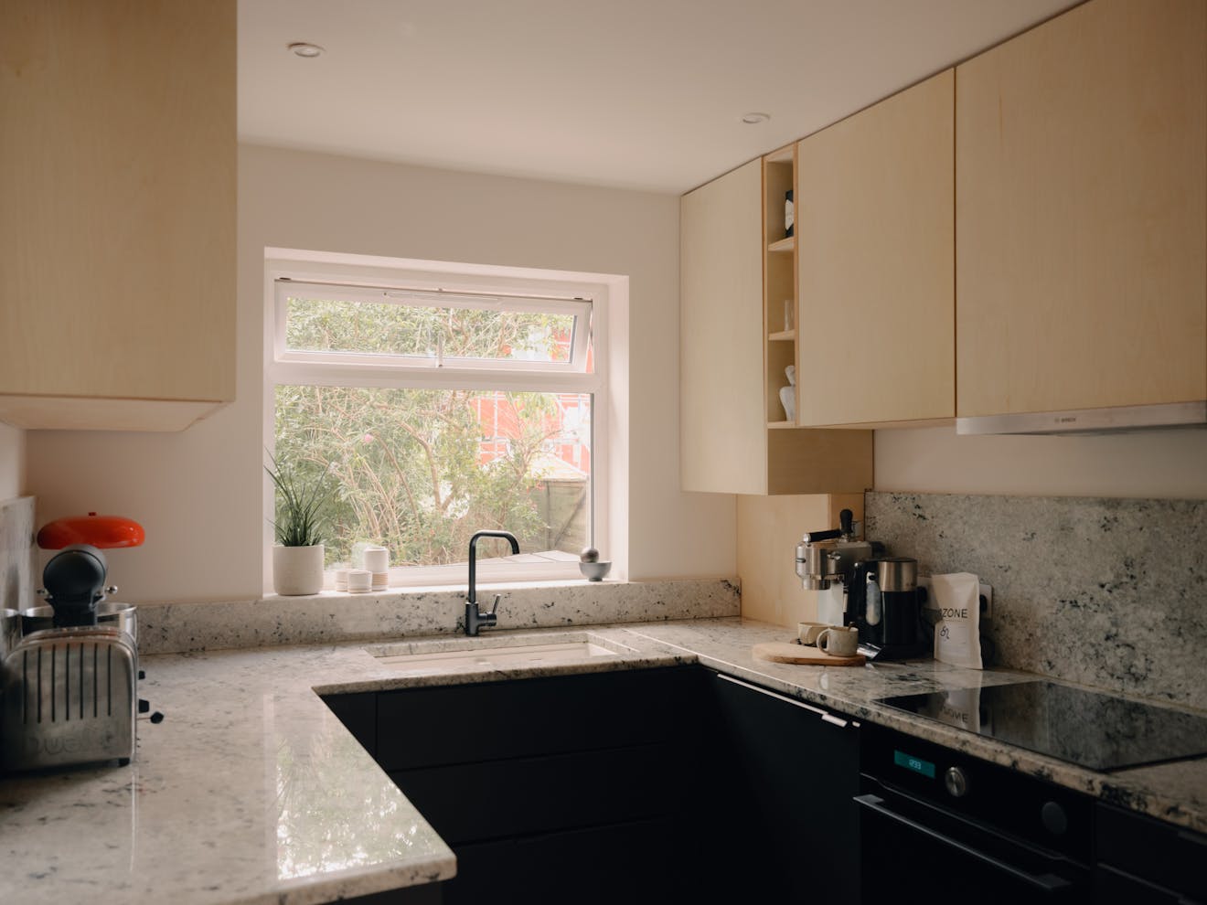 The U-shaped kitchen has been designed with functionality and practicality in mind. Contrasting high and low-level units blend perfectly with a Colonial White granite countertop and splashback, while the sink’s window offers calming views over a rear garden filled with mature planting.