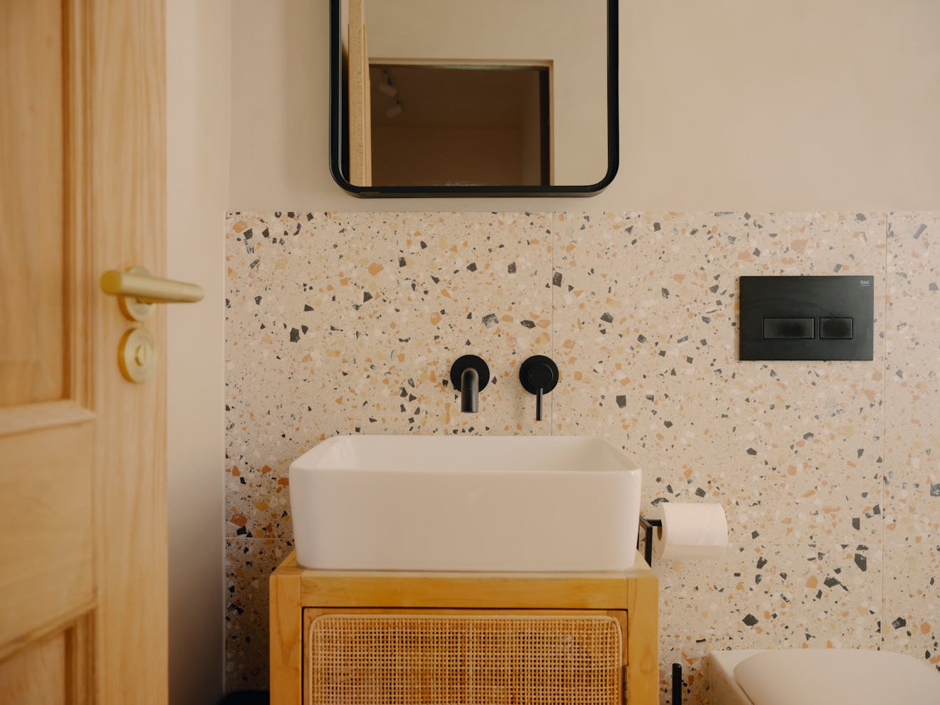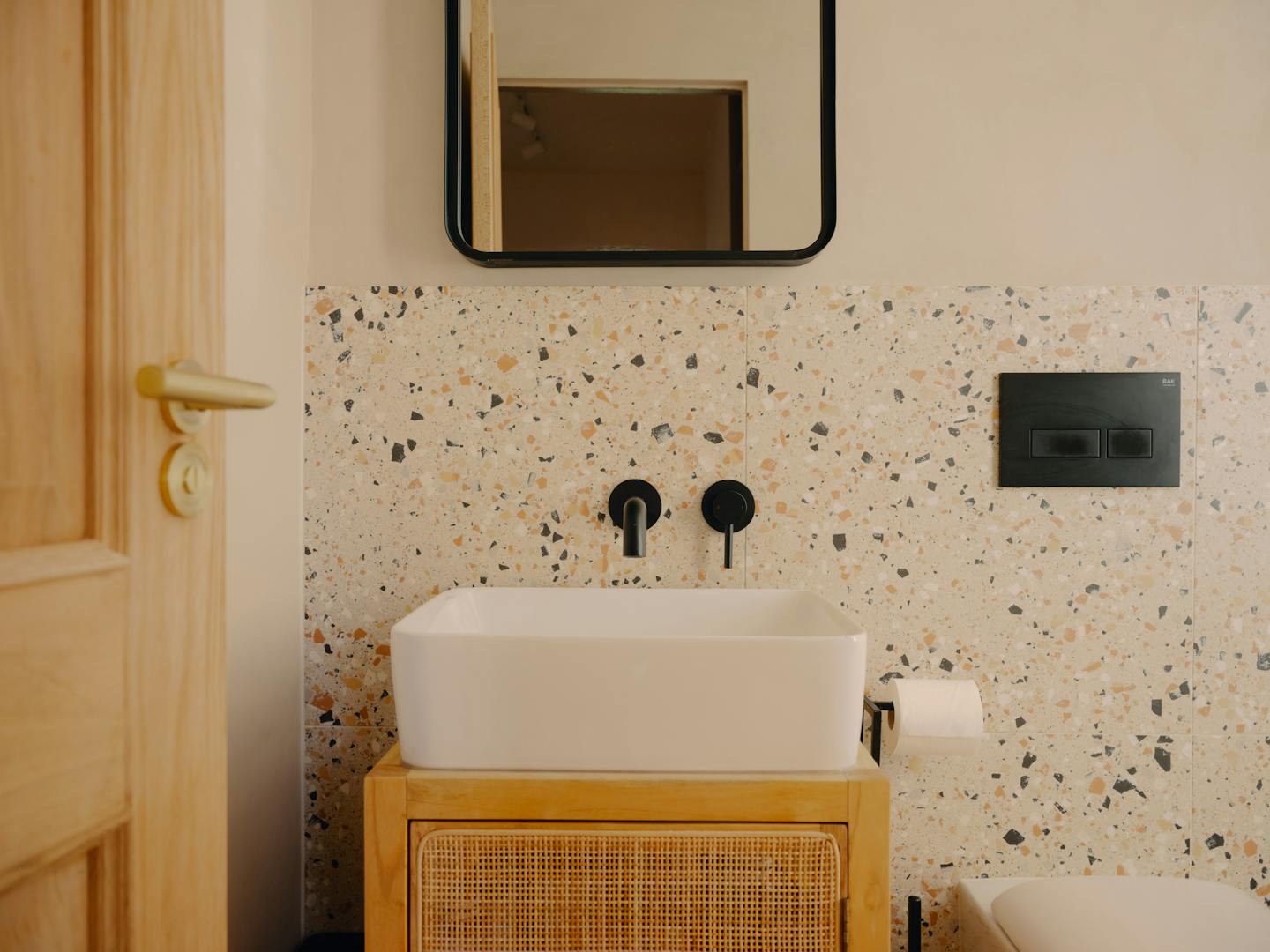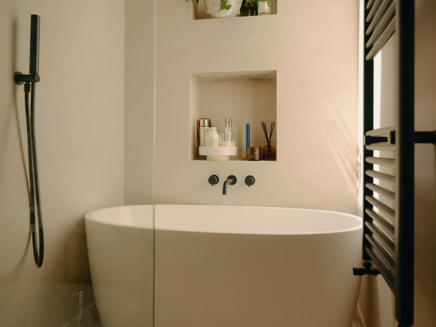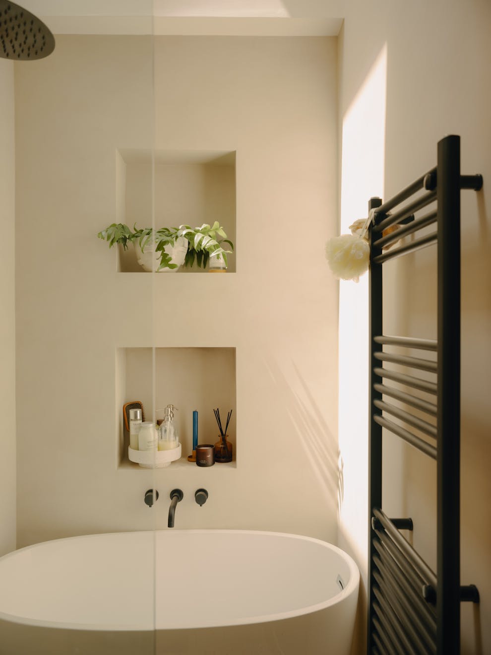The bathroom is finished in microcement and features a terrazzo splashback and tiles, matt black bathroom fittings, a rain shower, a freestanding bath and built-in recess shelving. Most striking is the large skylight above the shower & its beams of natural light.