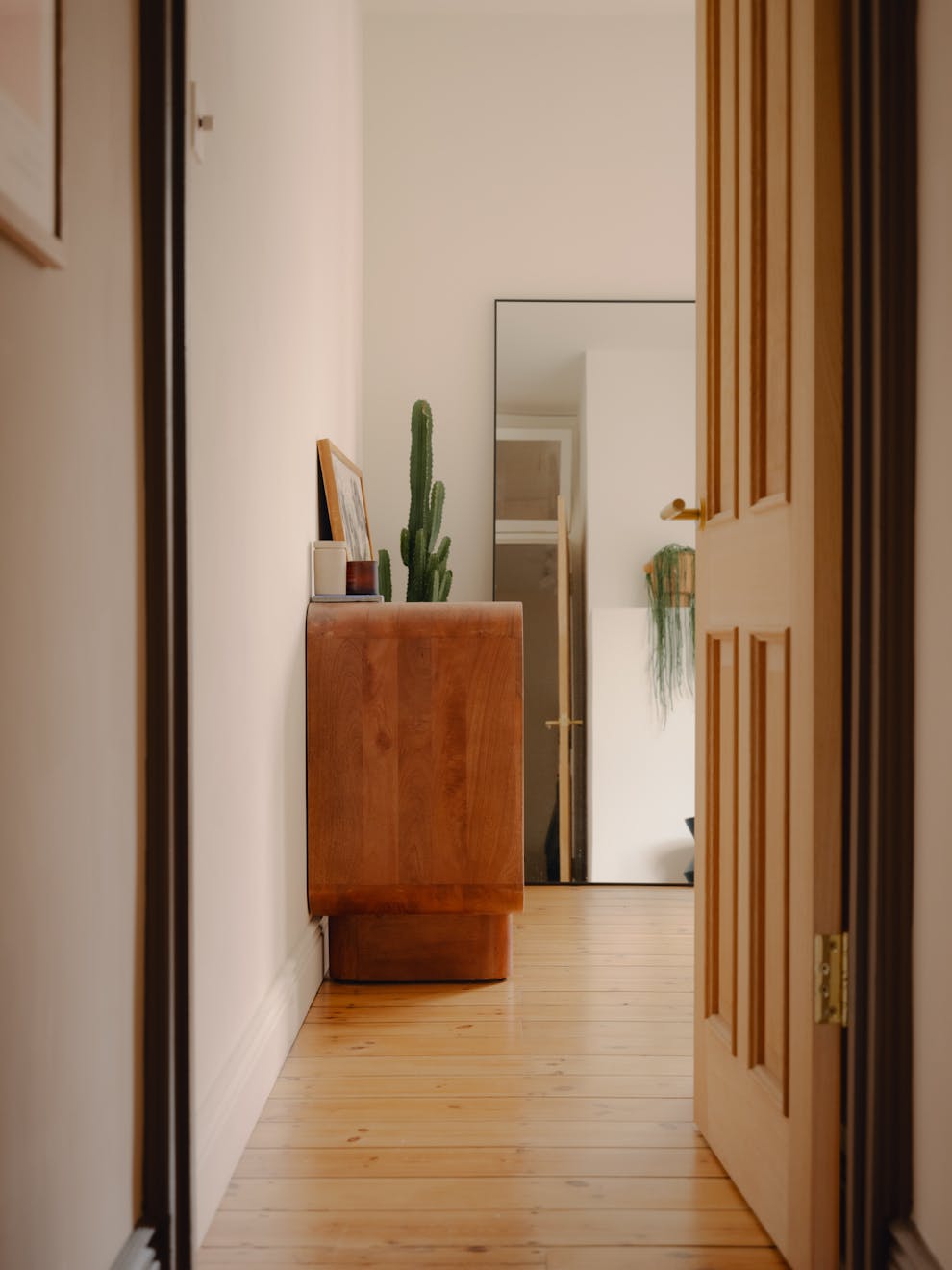 A Victorian tiled hallway shared with the neighbouring home leads you through to a front door that opens onto a bright and airy double living space. The front room is decorated with soft uplighting, restored pine timber flooring and a wonderful south-facing bay window which welcomes plenty of natural light throughout the ground floor.