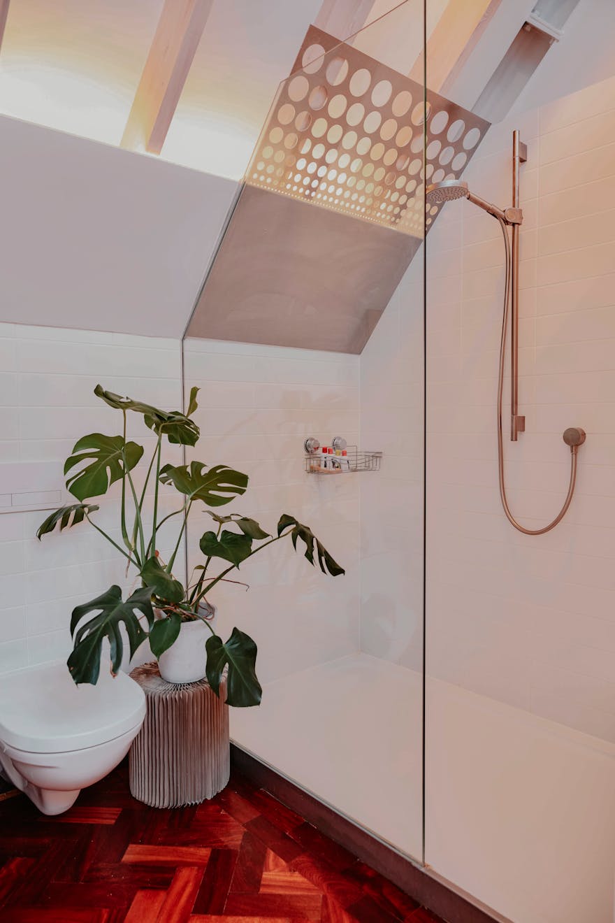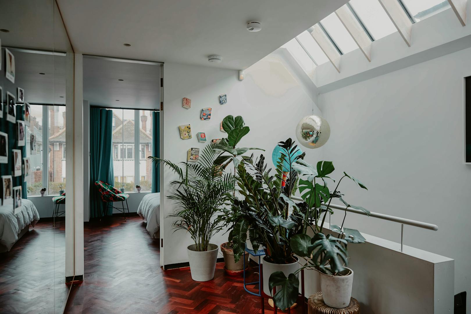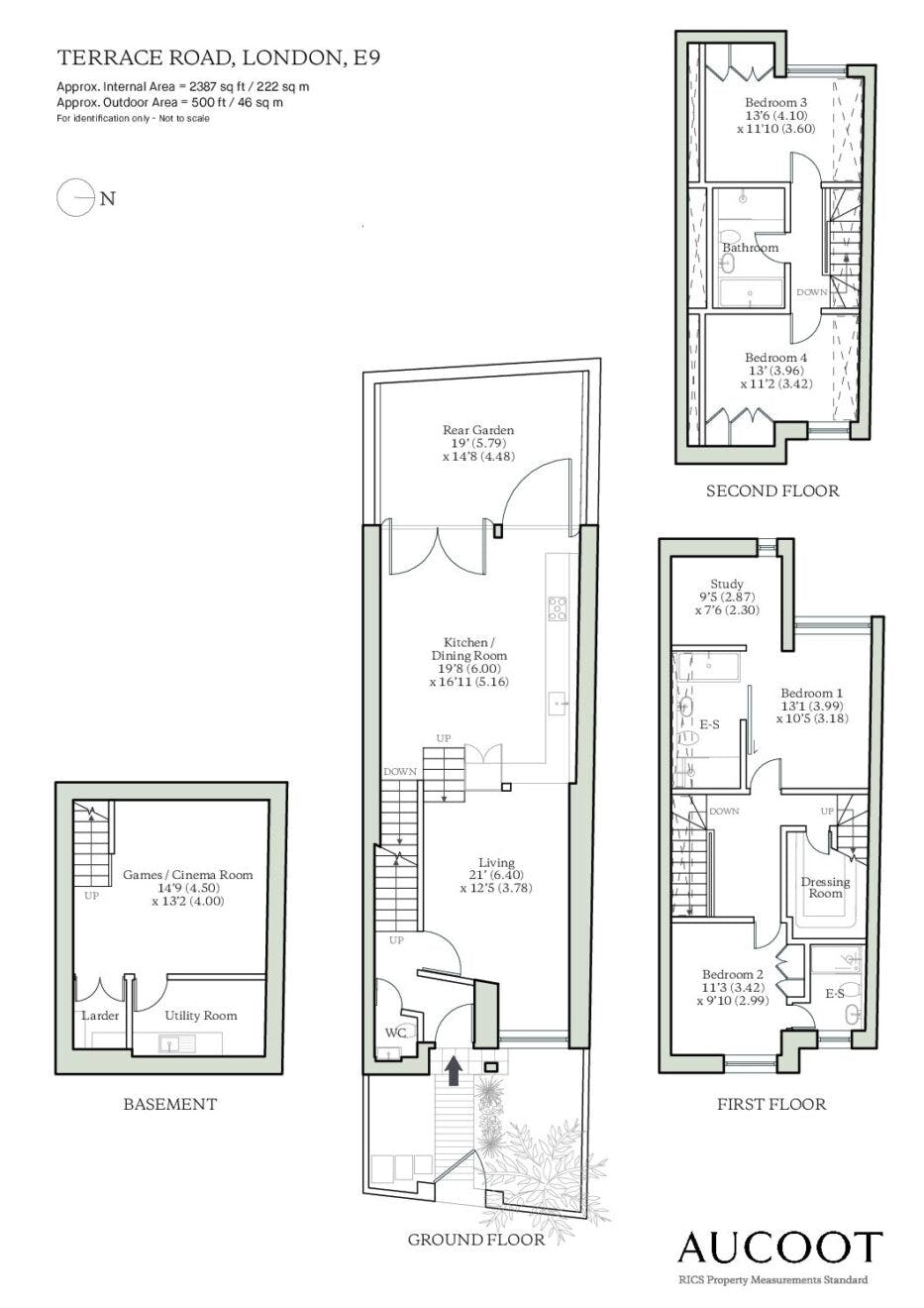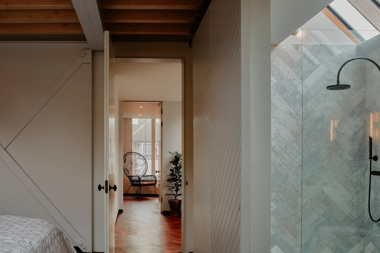 On the upper floors, light and volume are again centre stage. A generous main suite sits to the rear, complete with a study, dressing area and an open-plan bathroom, softly divided by a sliding, textured wall. Another en suite bedroom occupies the front of the house, while the top floor is home to two further bedrooms flanking a family bathroom, all bathed in light from overhead glazing. Broad landings between levels are imagined not merely as corridors but as galleries, offering space to pause, display and reflect.