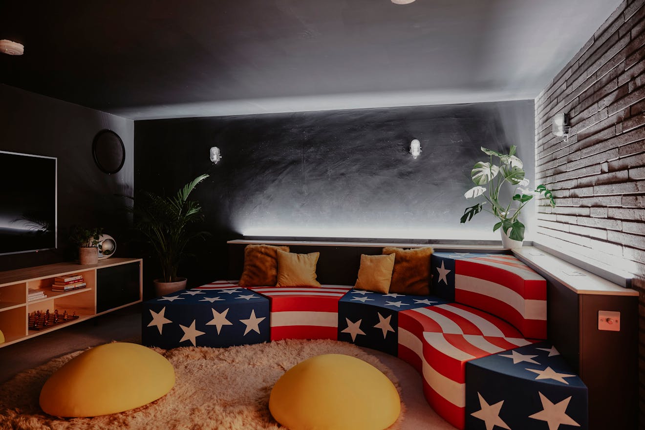 At the heart of the house, a split-level arrangement defines the ground and lower-ground floors, where interconnected living spaces unfold as a sequence rather than a single volume. A west-facing lounge floats above a hand-built kitchen and dining area, which opens directly to the garden through three floor to ceiling striking pivot doors. Beneath, a lower-ground snug/cinema room, utility room and larder are tucked away, enhancing the functionality without compromising the flow.