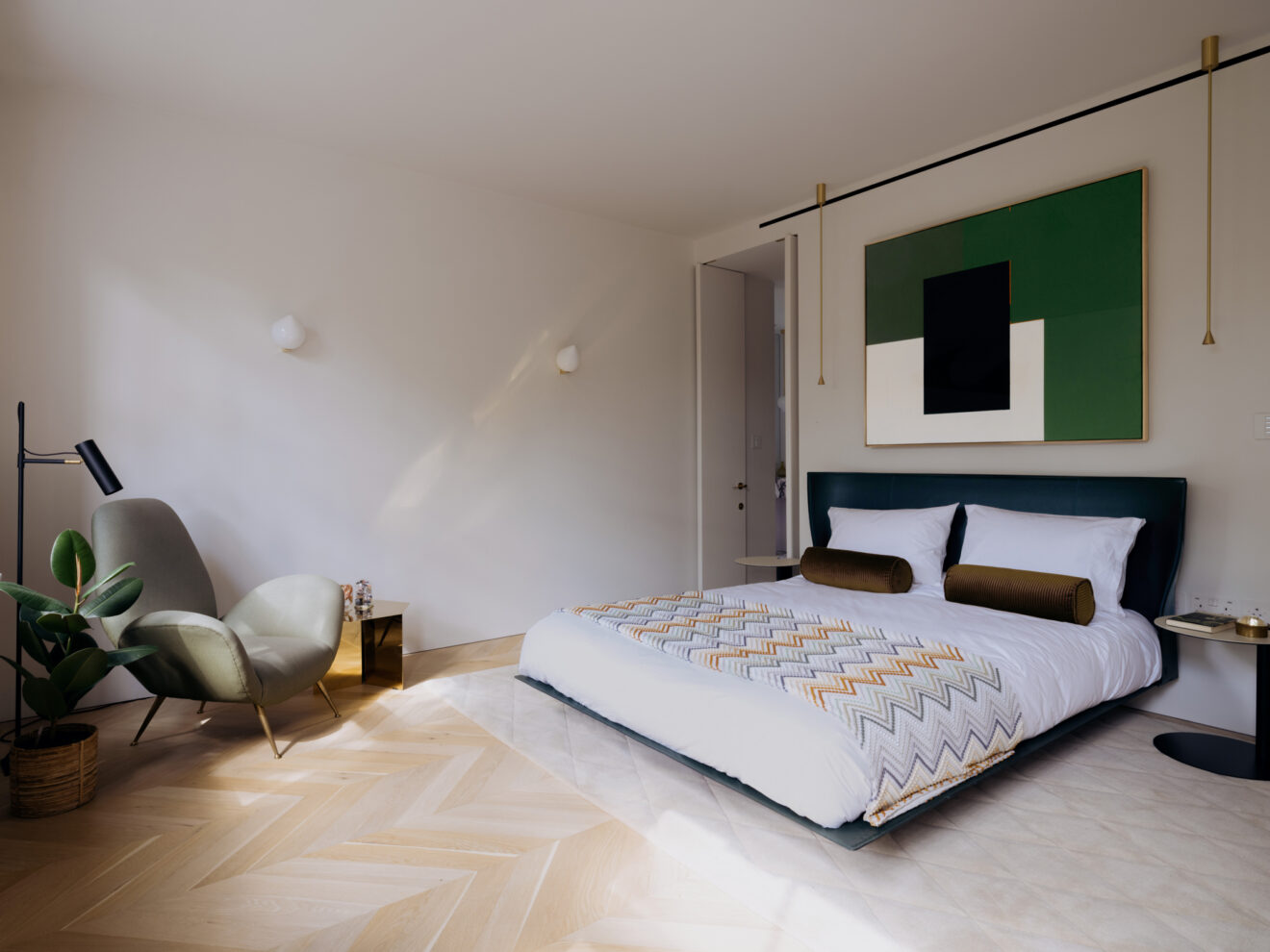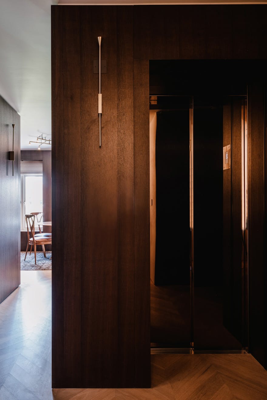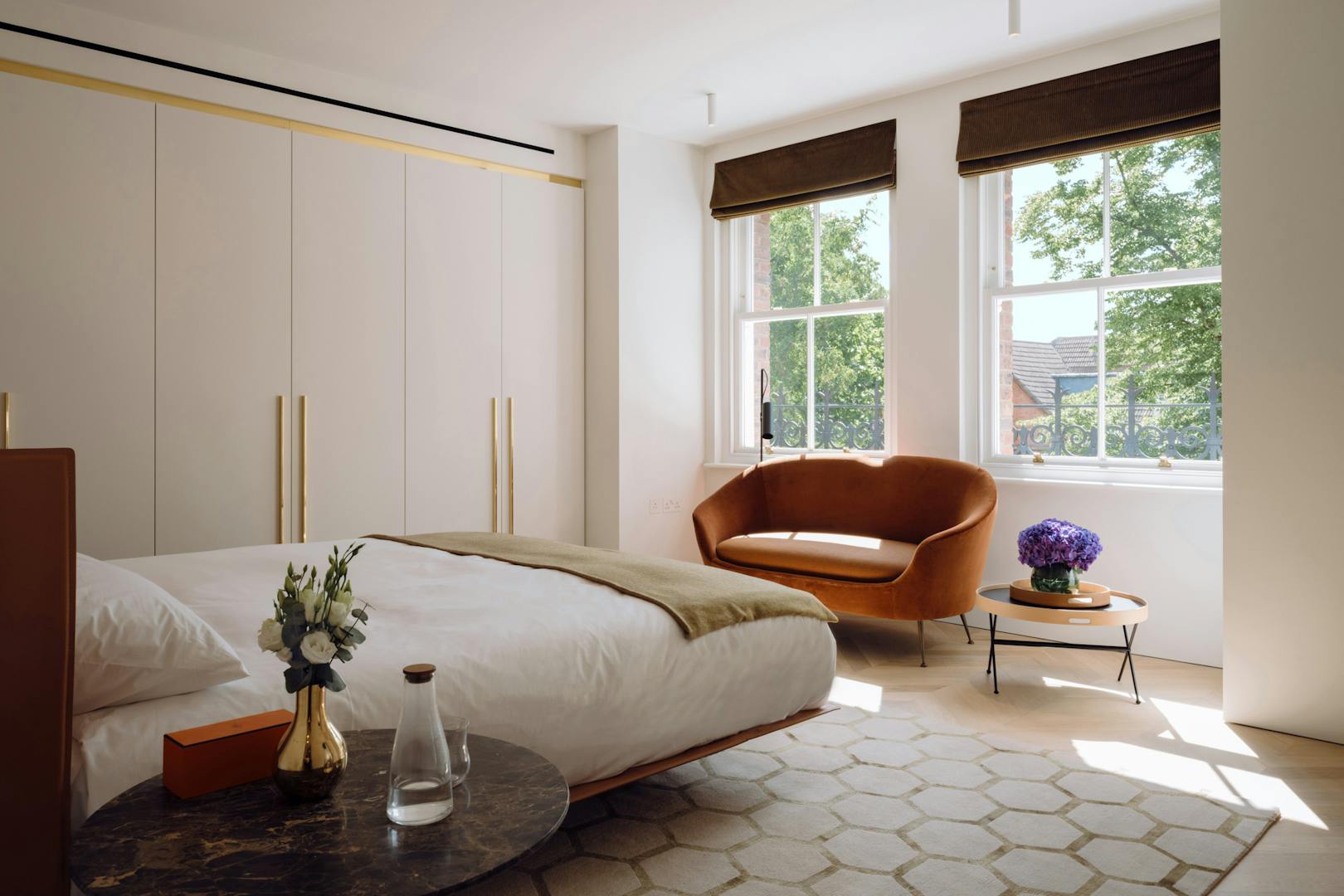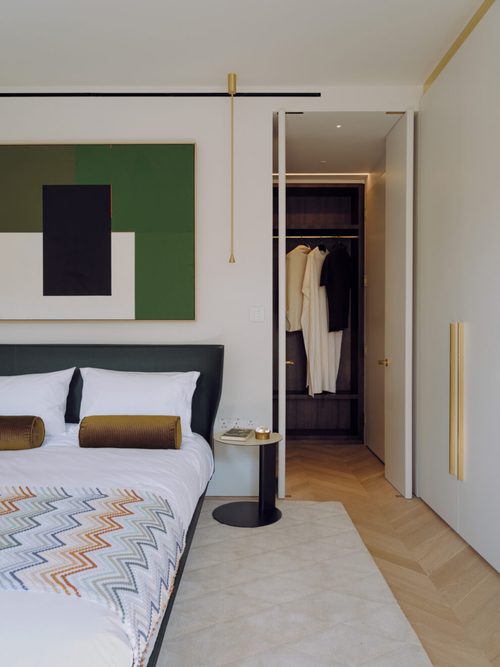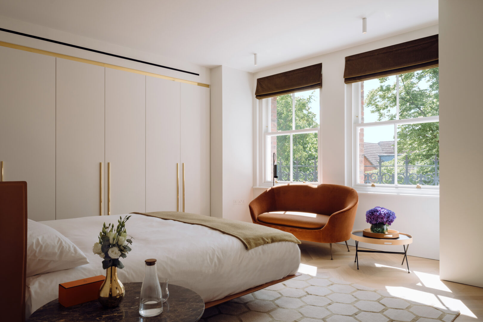 Each apartment in the building is accessed via a leather-lined lift that opens directly into the home. Located on the second floor, the lift arrives into a wide hallway, where chevron-patterned engineered oak flooring with underfloor heating runs throughout, creating a strong sense of cohesion and flow. At the front of the apartment are two generous west-facing bedrooms, both with en-suite bathrooms, featuring Arabascata marble and Vola fixtures, as well as ample storage.
