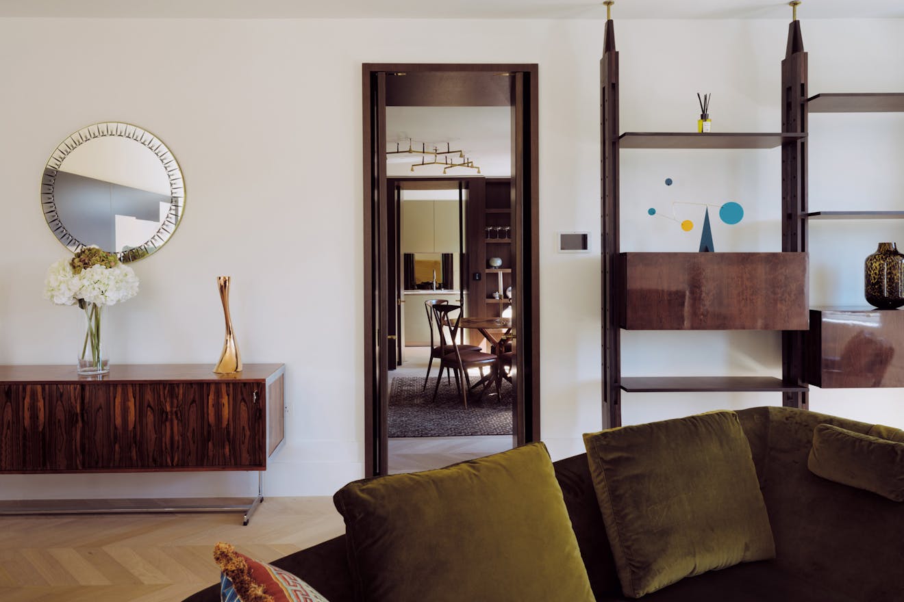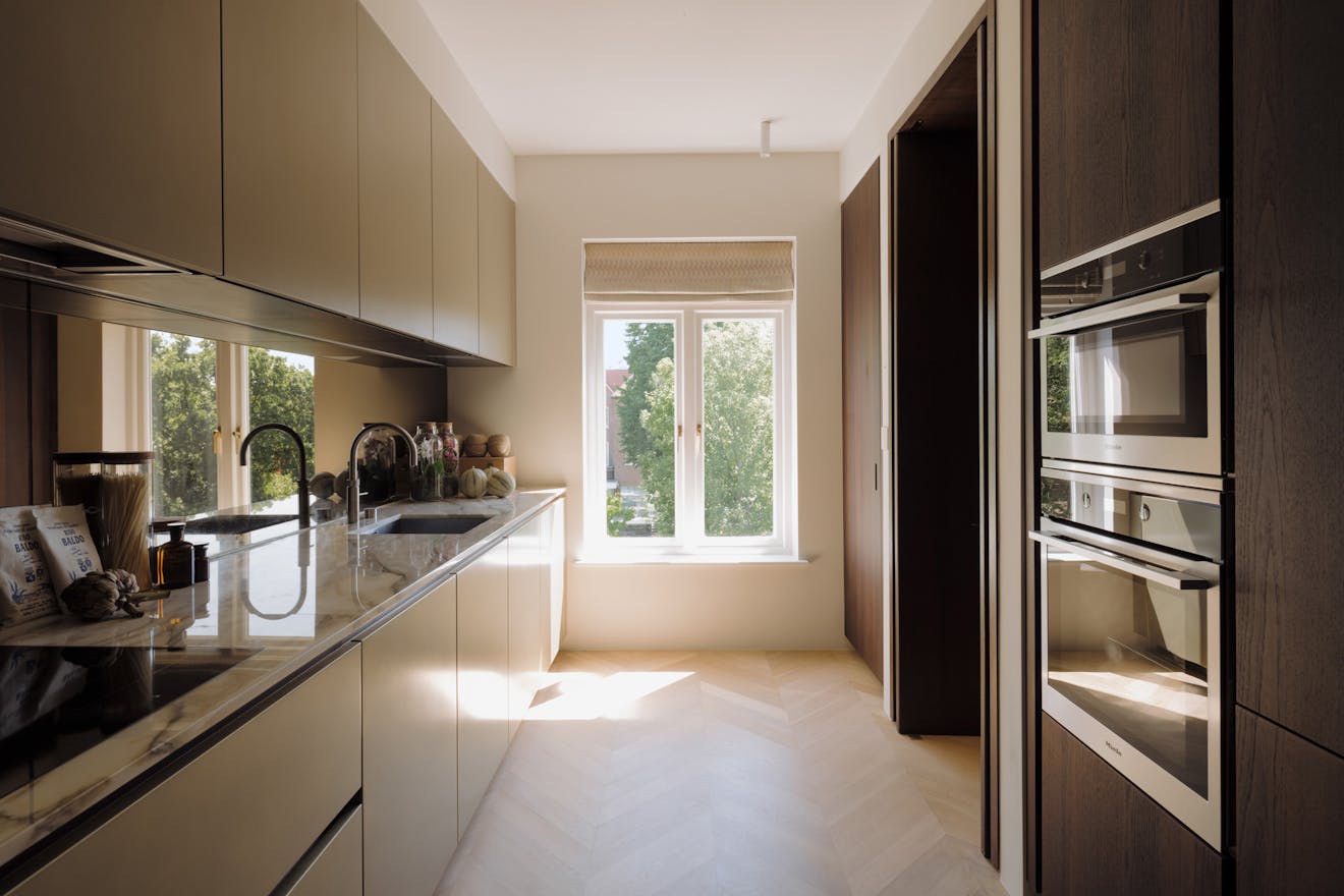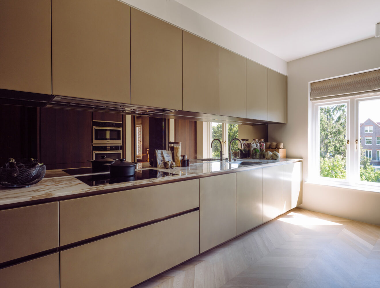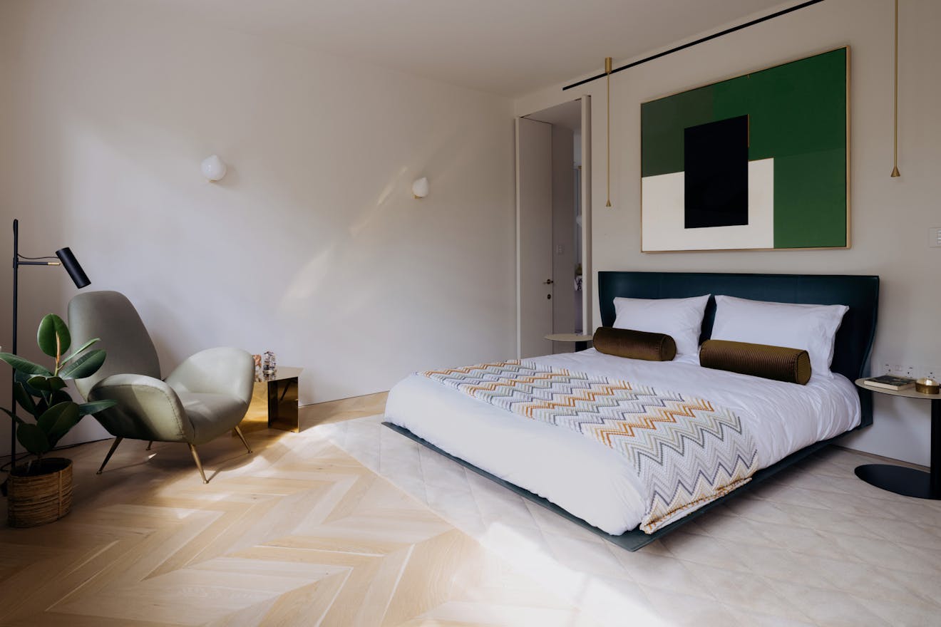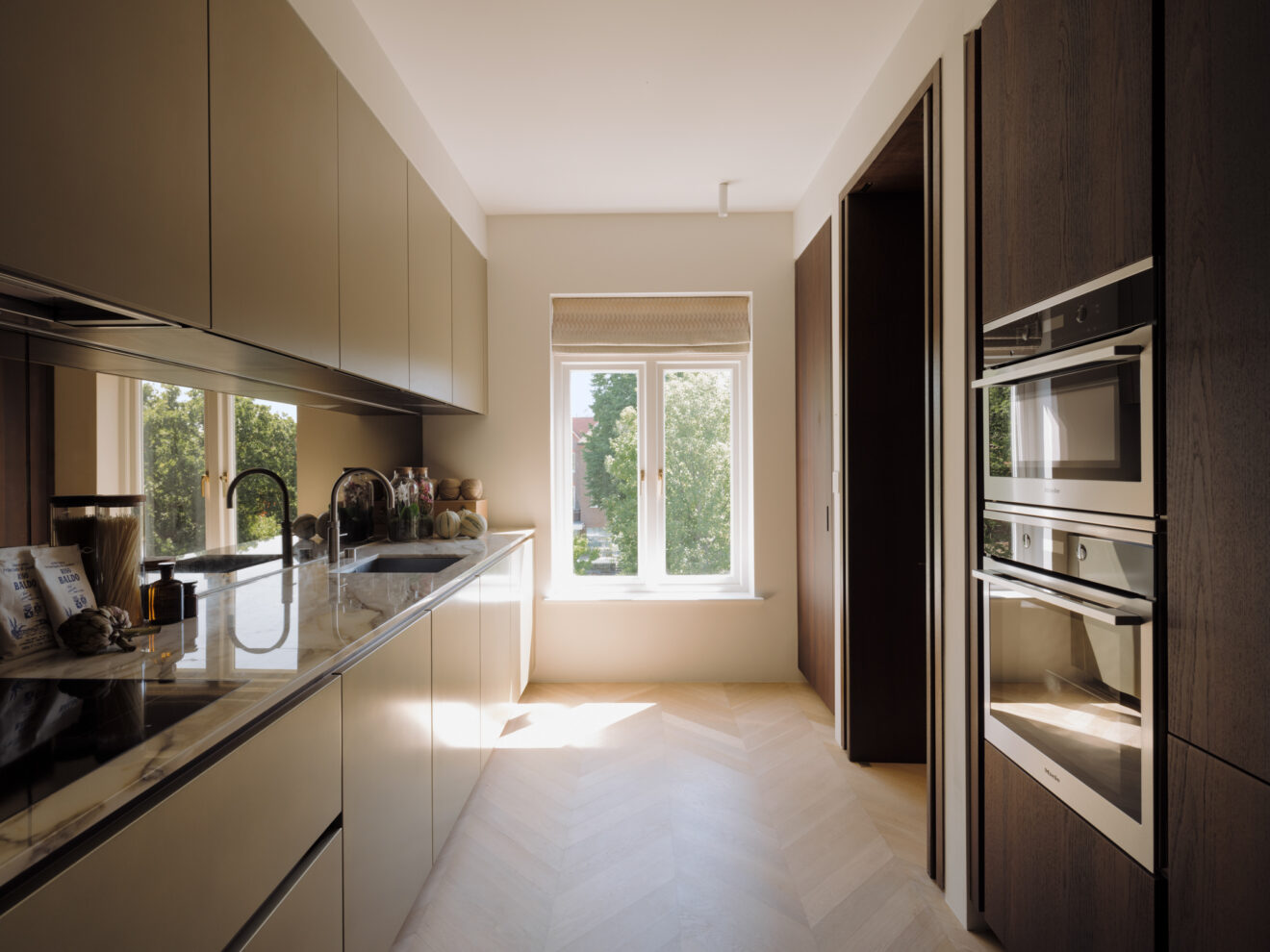 Each apartment in the building is accessed via a leather-lined lift that opens directly into the home. Located on the second floor, the lift arrives into a wide hallway, where chevron-patterned engineered oak flooring with underfloor heating runs throughout, creating a strong sense of cohesion and flow. At the front of the apartment are two generous west-facing bedrooms, both with en-suite bathrooms, featuring Arabascata marble and Vola fixtures, as well as ample storage.