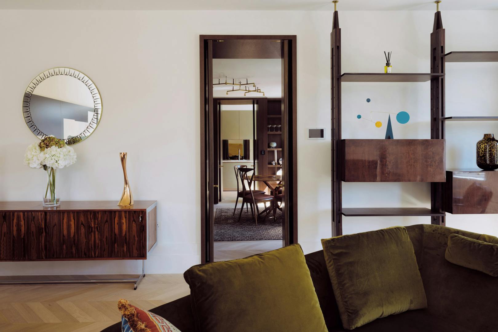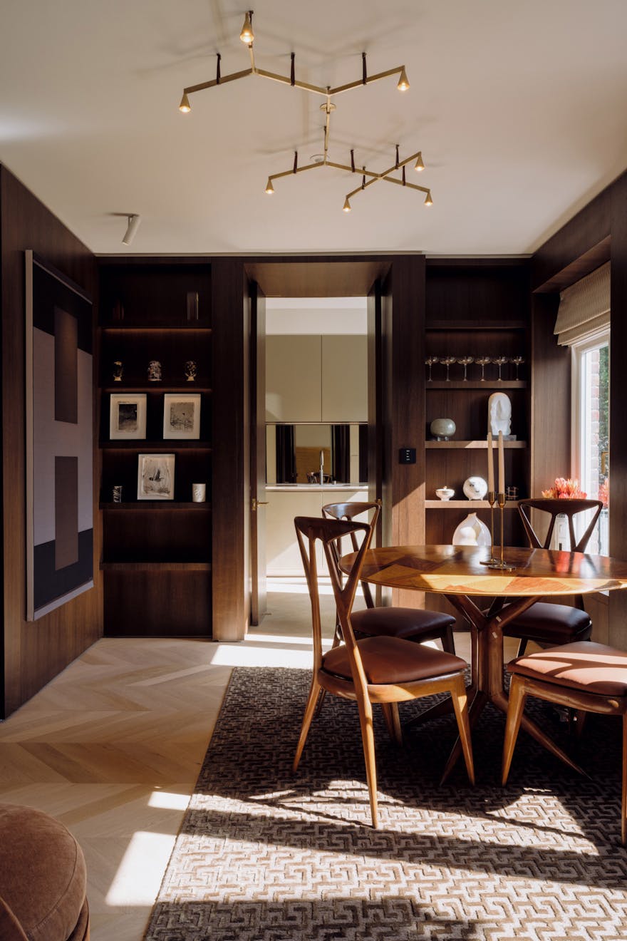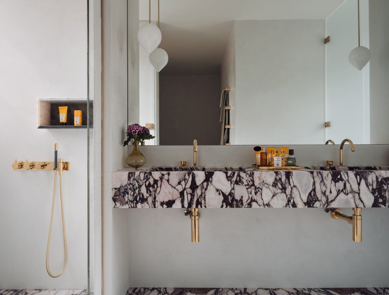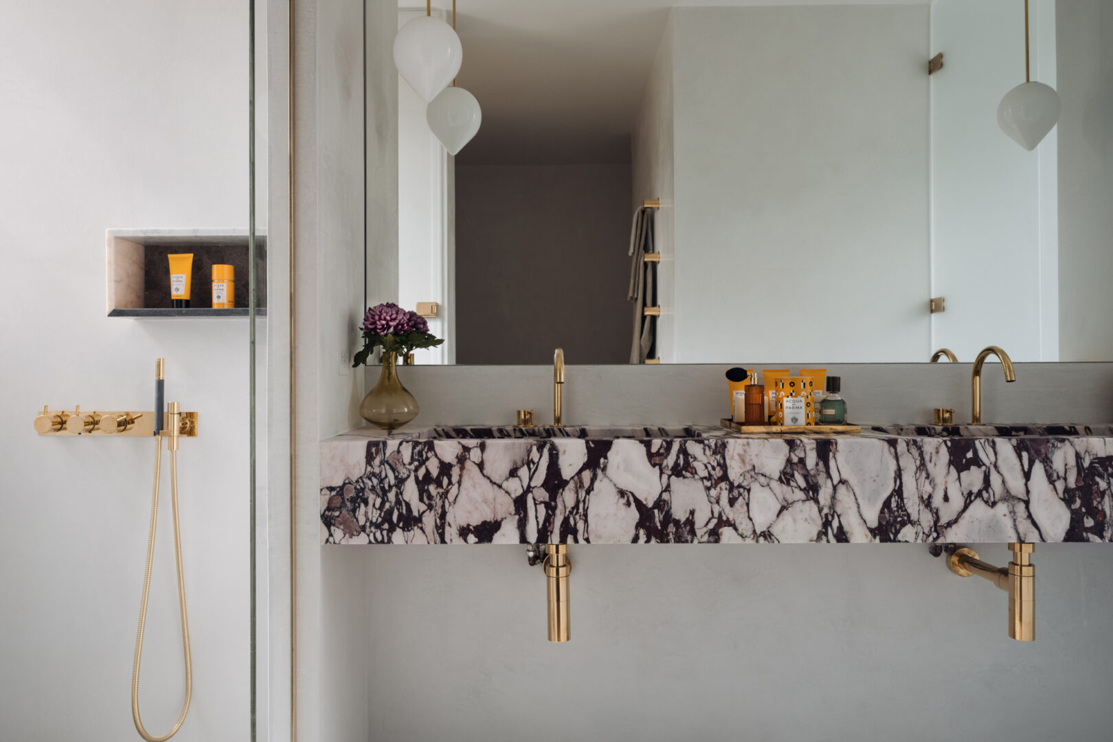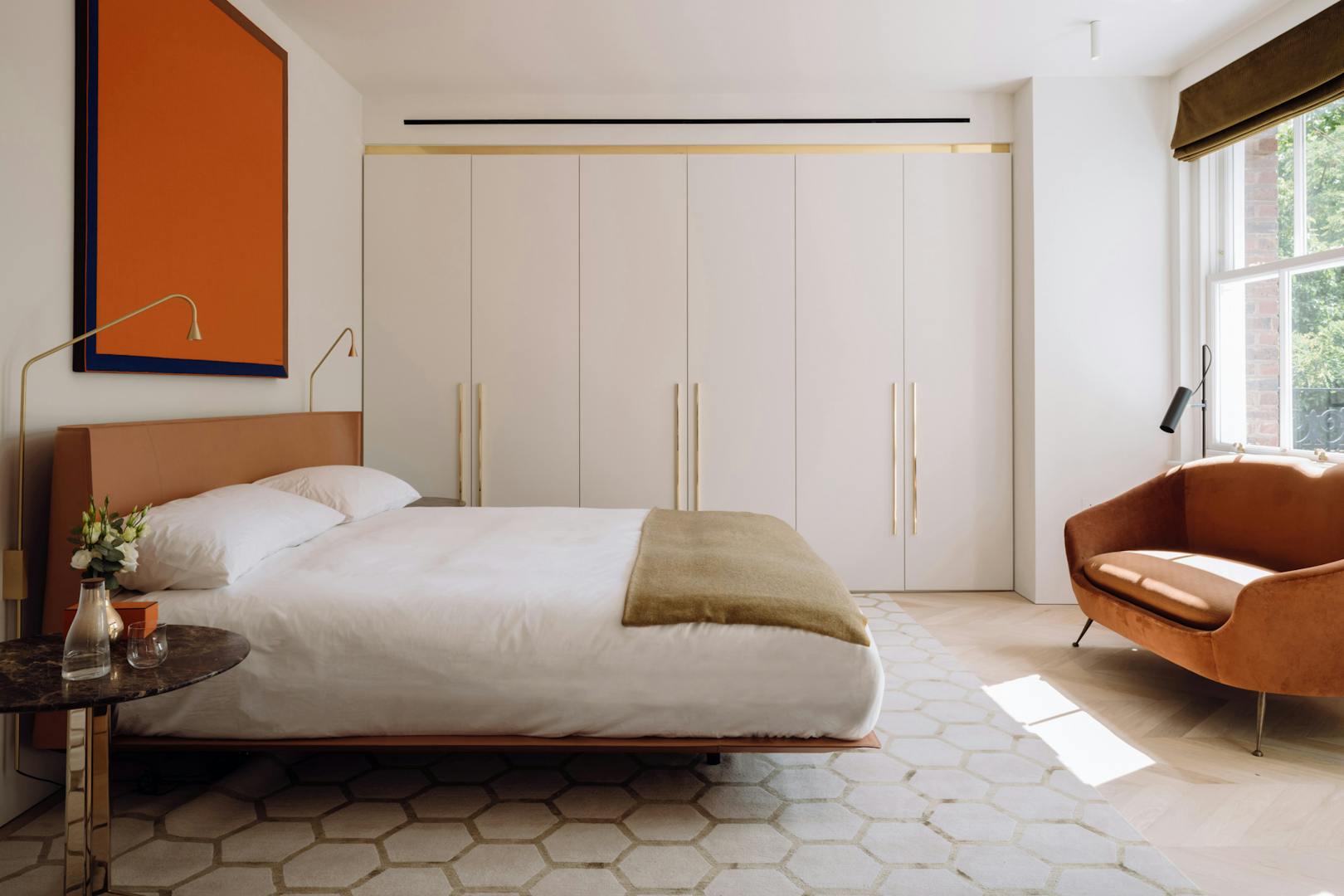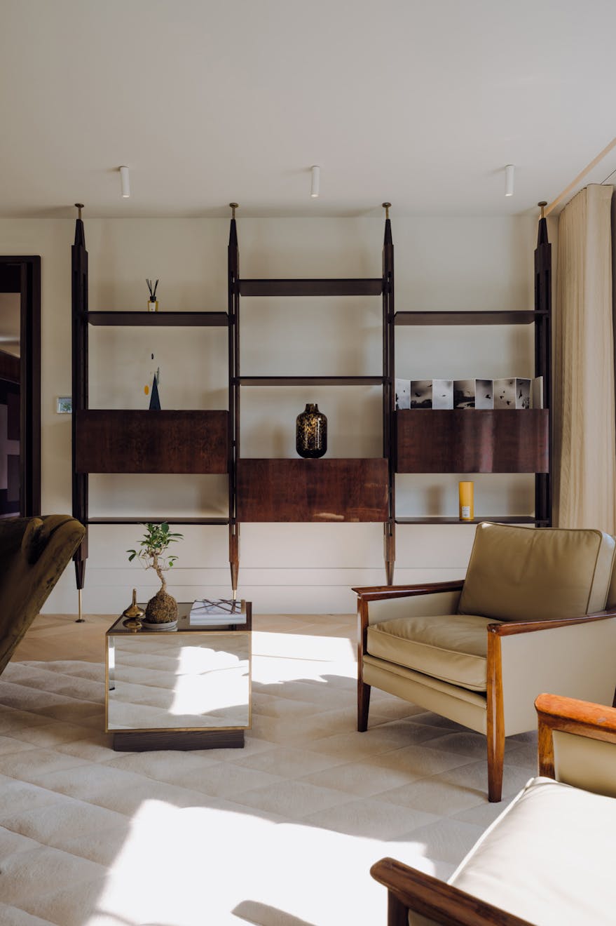 Each apartment in the building is accessed via a leather-lined lift that opens directly into the home. Located on the second floor, the lift arrives into a wide hallway, where chevron-patterned engineered oak flooring with underfloor heating runs throughout, creating a strong sense of cohesion and flow. At the front of the apartment are two generous west-facing bedrooms, both with en-suite bathrooms, featuring Arabascata marble and Vola fixtures, as well as ample storage.