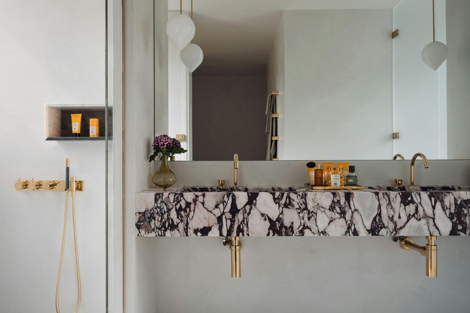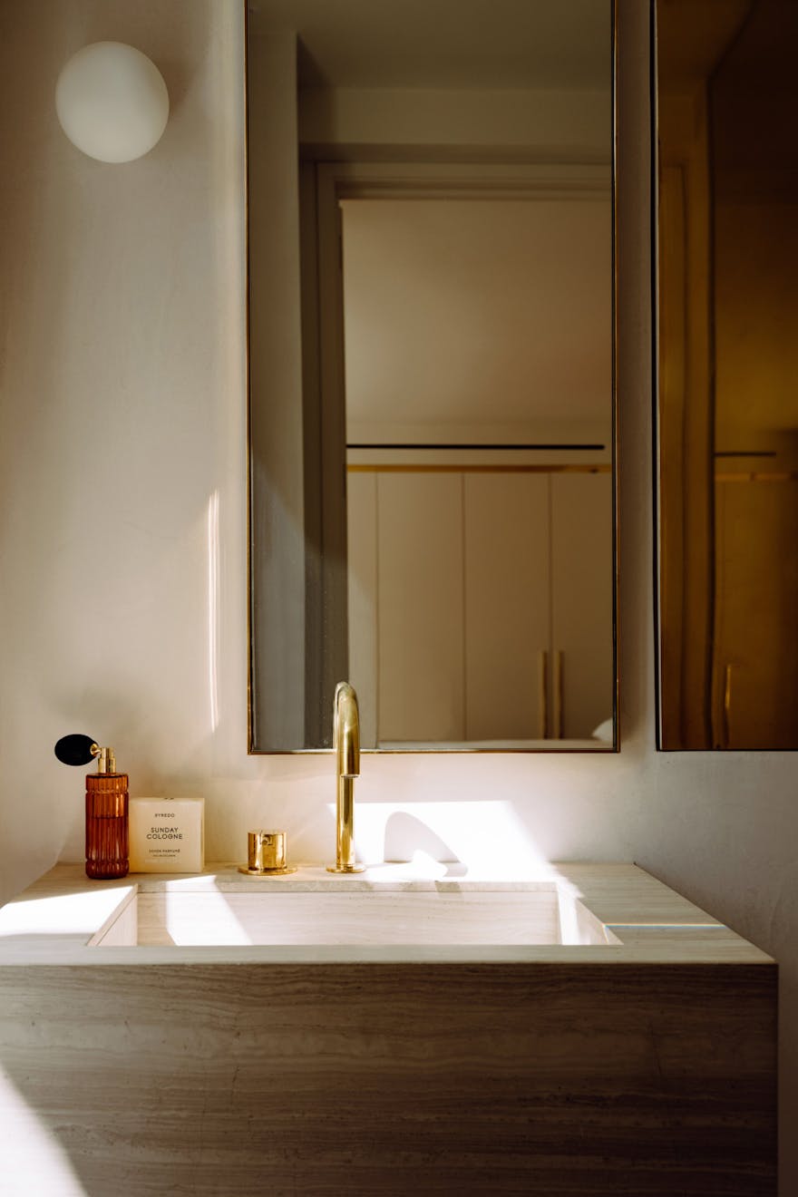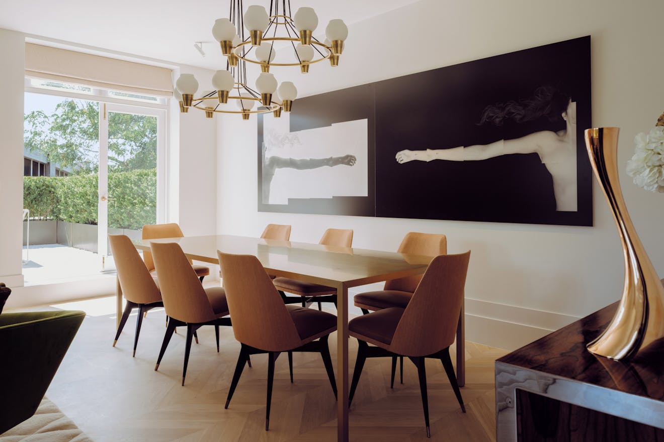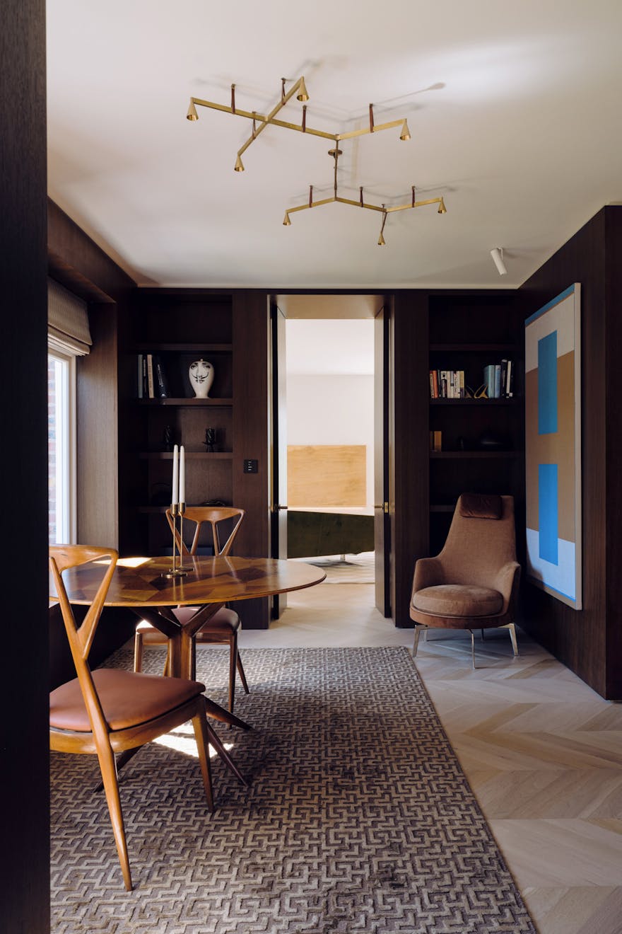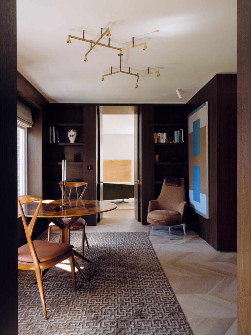 Each apartment in the building is accessed via a leather-lined lift that opens directly into the home. Located on the second floor, the lift arrives into a wide hallway, where chevron-patterned engineered oak flooring with underfloor heating runs throughout, creating a strong sense of cohesion and flow. At the front of the apartment are two generous west-facing bedrooms, both with en-suite bathrooms, featuring Arabascata marble and Vola fixtures, as well as ample storage.