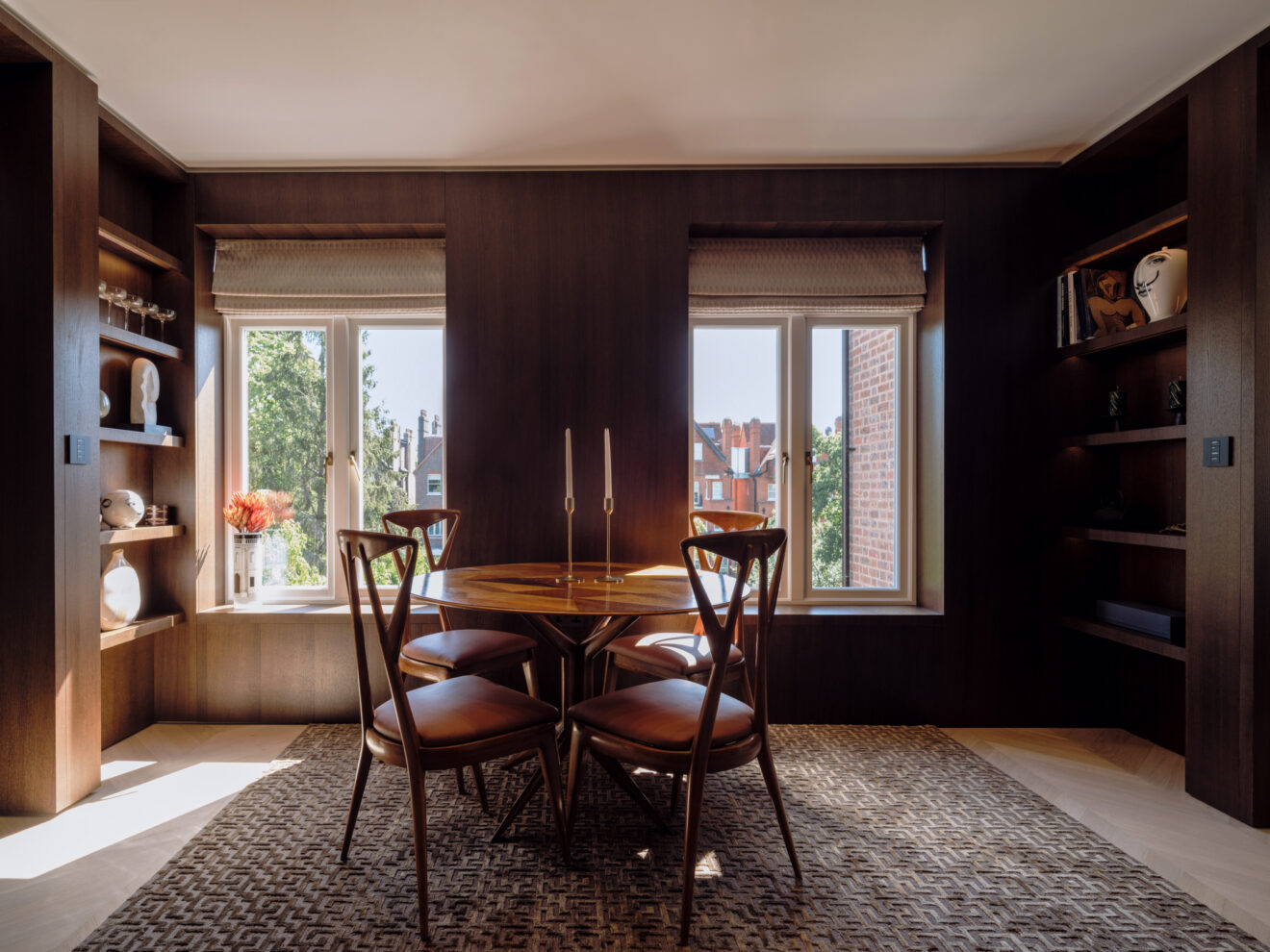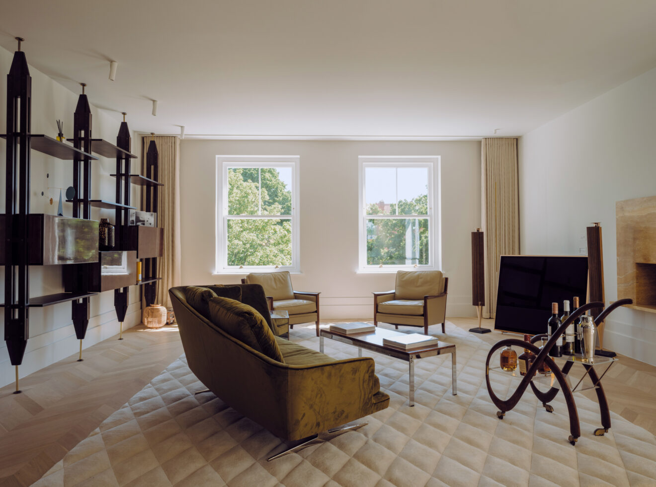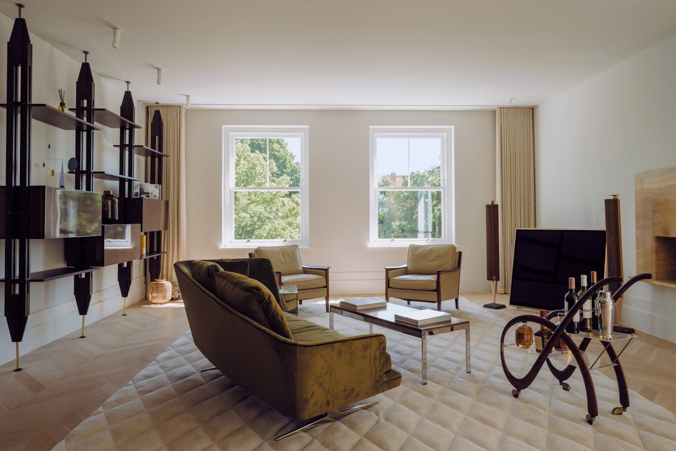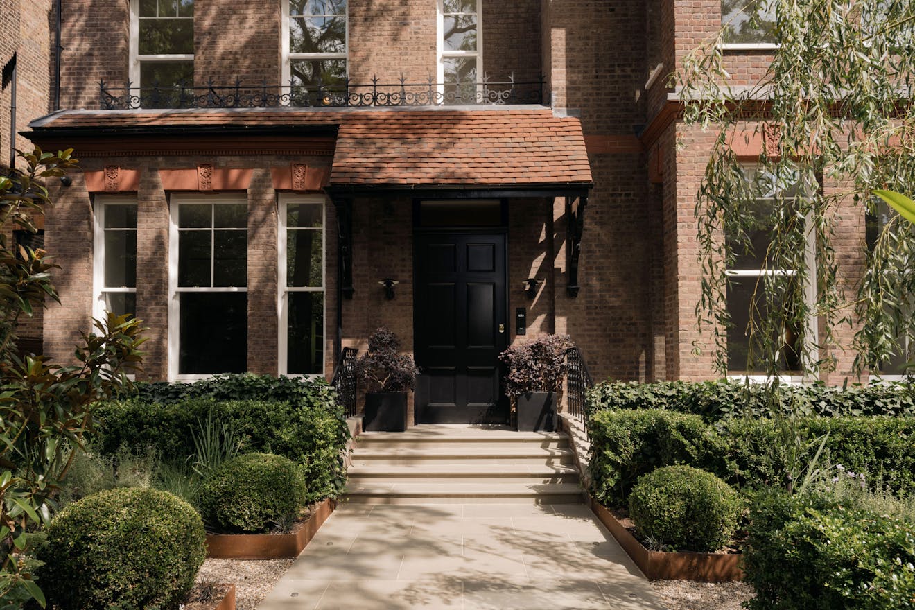 Entry to the apartment takes in the building’s elegant red-brick façade, projected square bays and balanced proportions, which are echoed by the grand villas along nearby Fitzjohn’s Avenue. Recently landscaped, the front garden has Corten-steel planters and bullnose-limestone steps leading to the raised entrance.