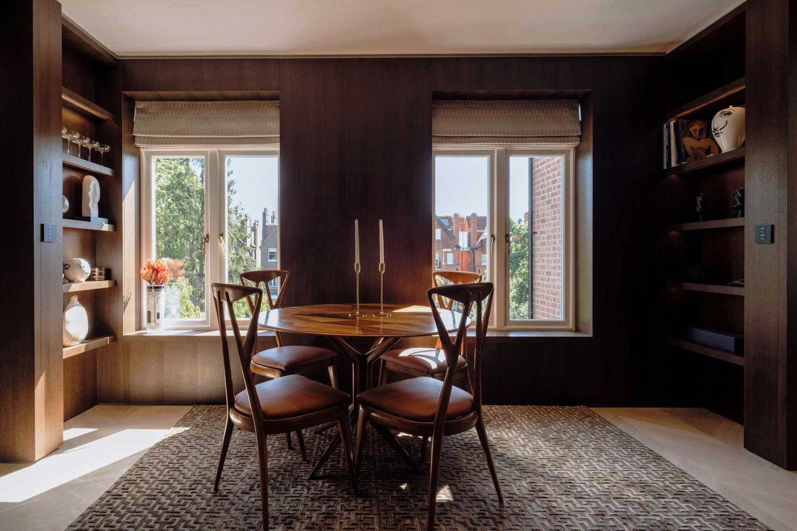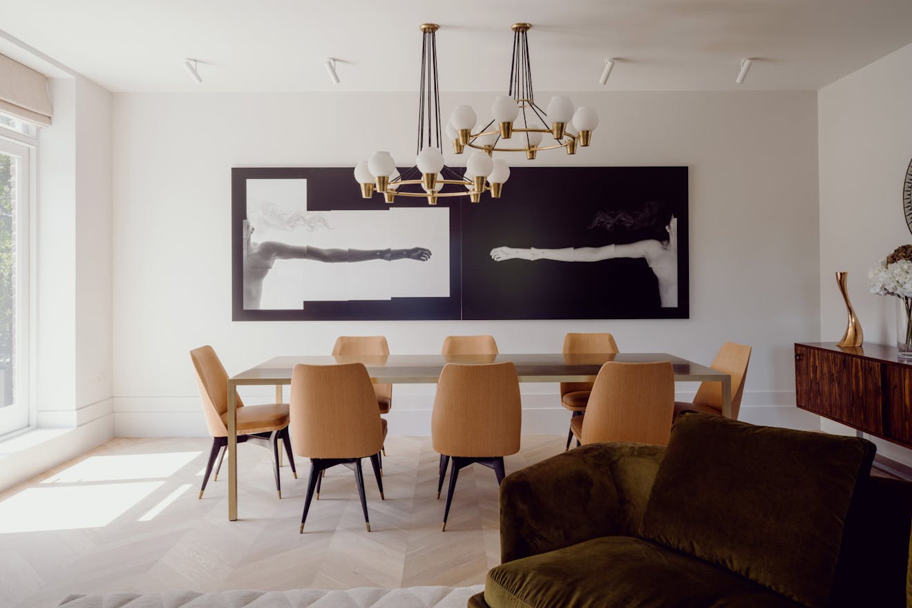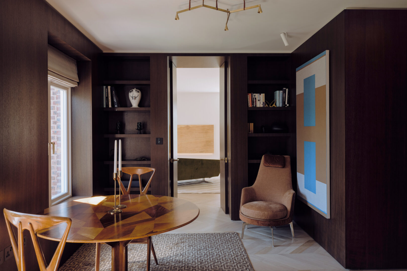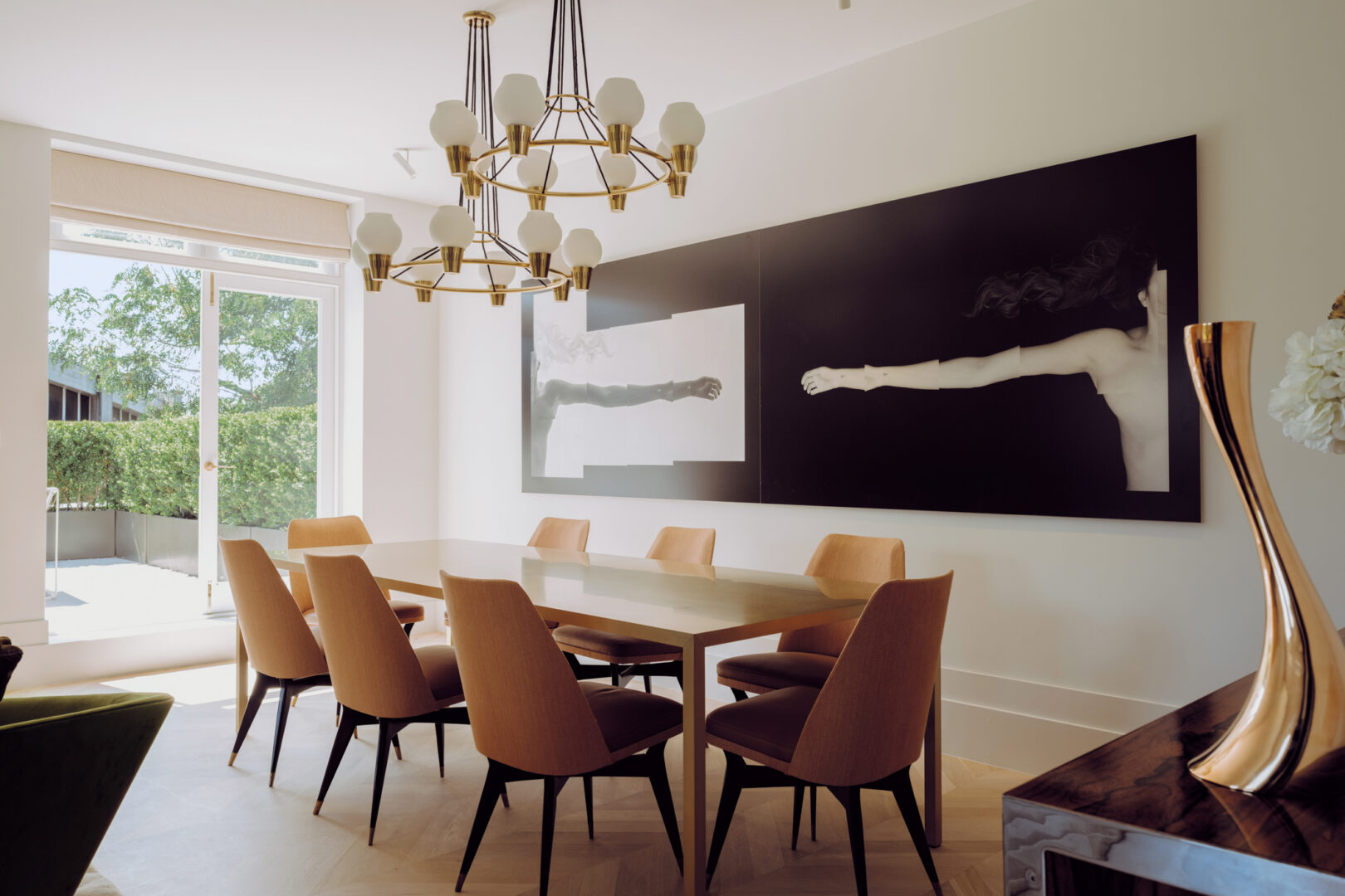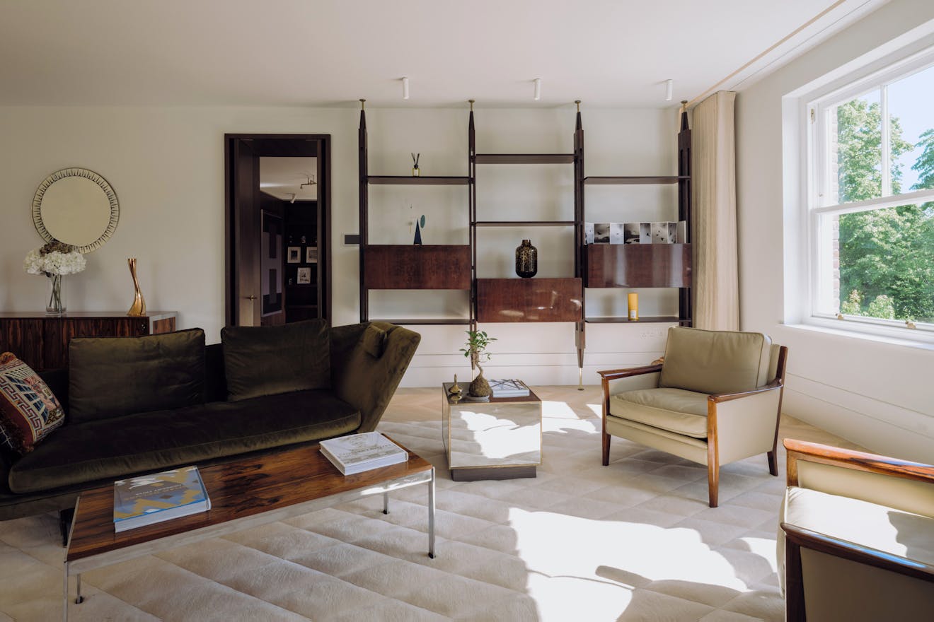 Entry to the apartment takes in the building’s elegant red-brick façade, projected square bays and balanced proportions, which are echoed by the grand villas along nearby Fitzjohn’s Avenue. Recently landscaped, the front garden has Corten-steel planters and bullnose-limestone steps leading to the raised entrance.
