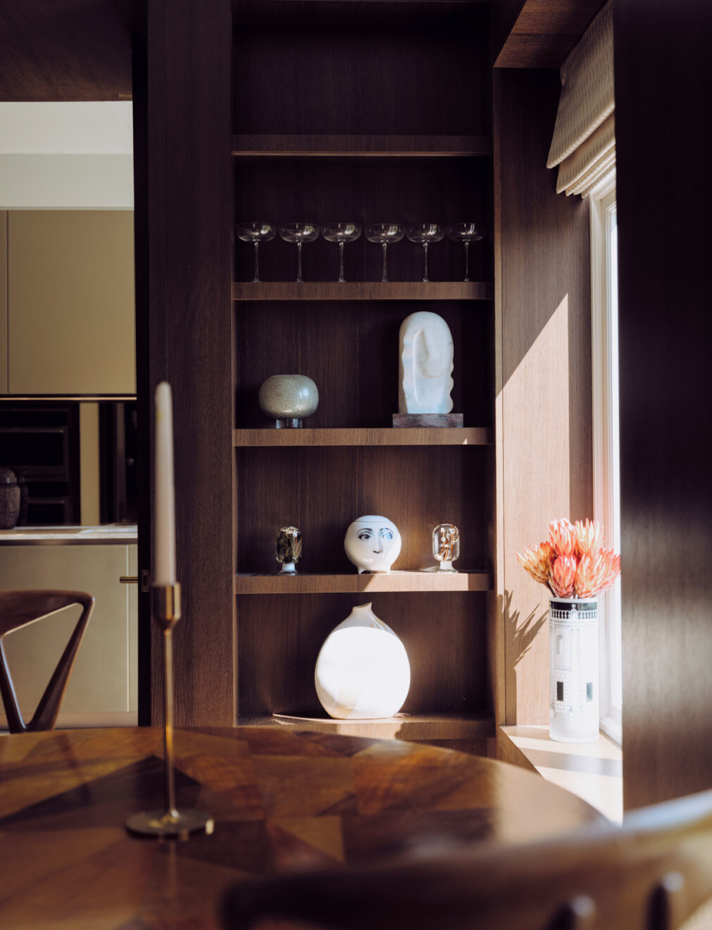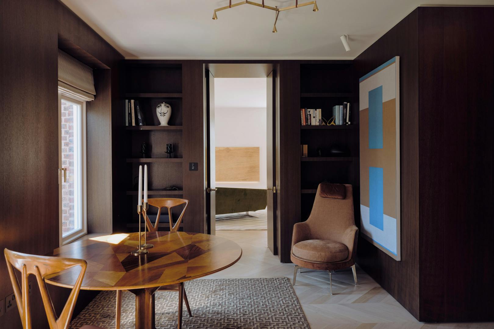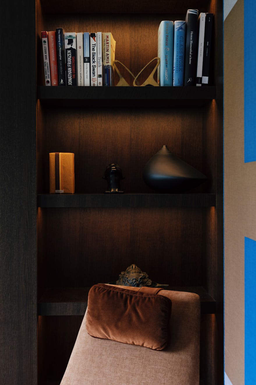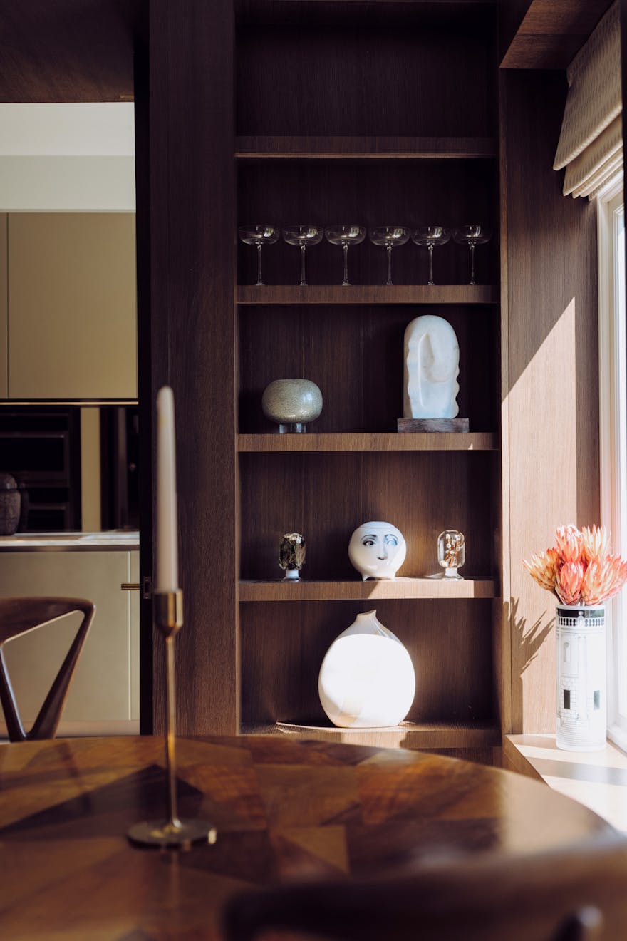 Entry to the apartment takes in the building’s elegant red-brick façade, projected square bays and balanced proportions, which are echoed by the grand villas along nearby Fitzjohn’s Avenue. Recently landscaped, the front garden has Corten-steel planters and bullnose-limestone steps leading to the raised entrance.