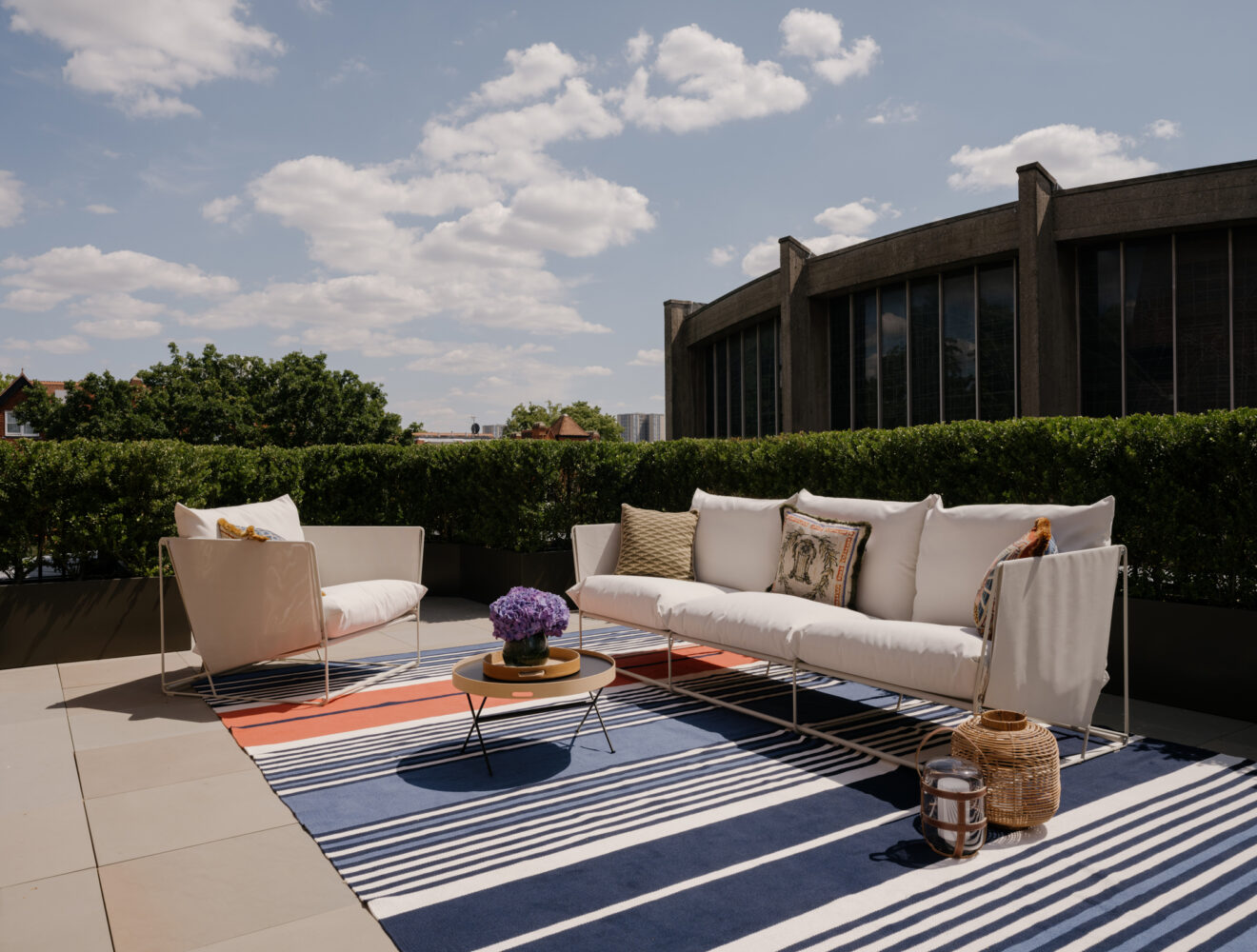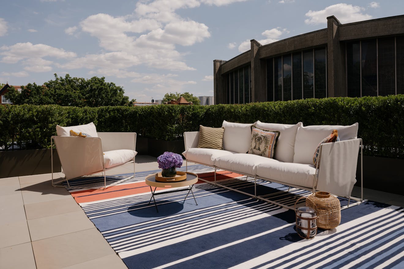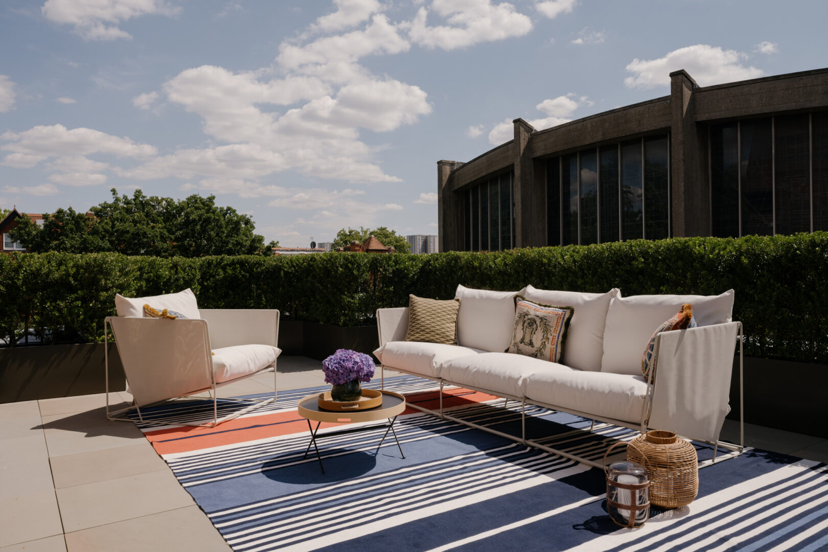 The large paved terrace enjoys uninterrupted southern and westerly aspects. Box hedging provides privacy, while open views extend towards the high-level glazing of St Thomas More Church.