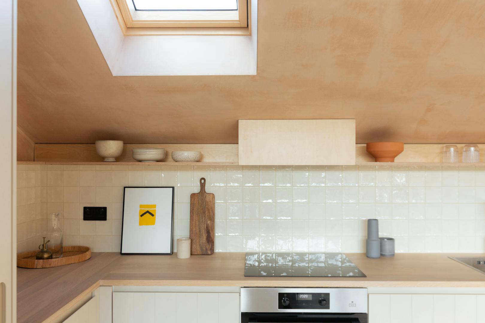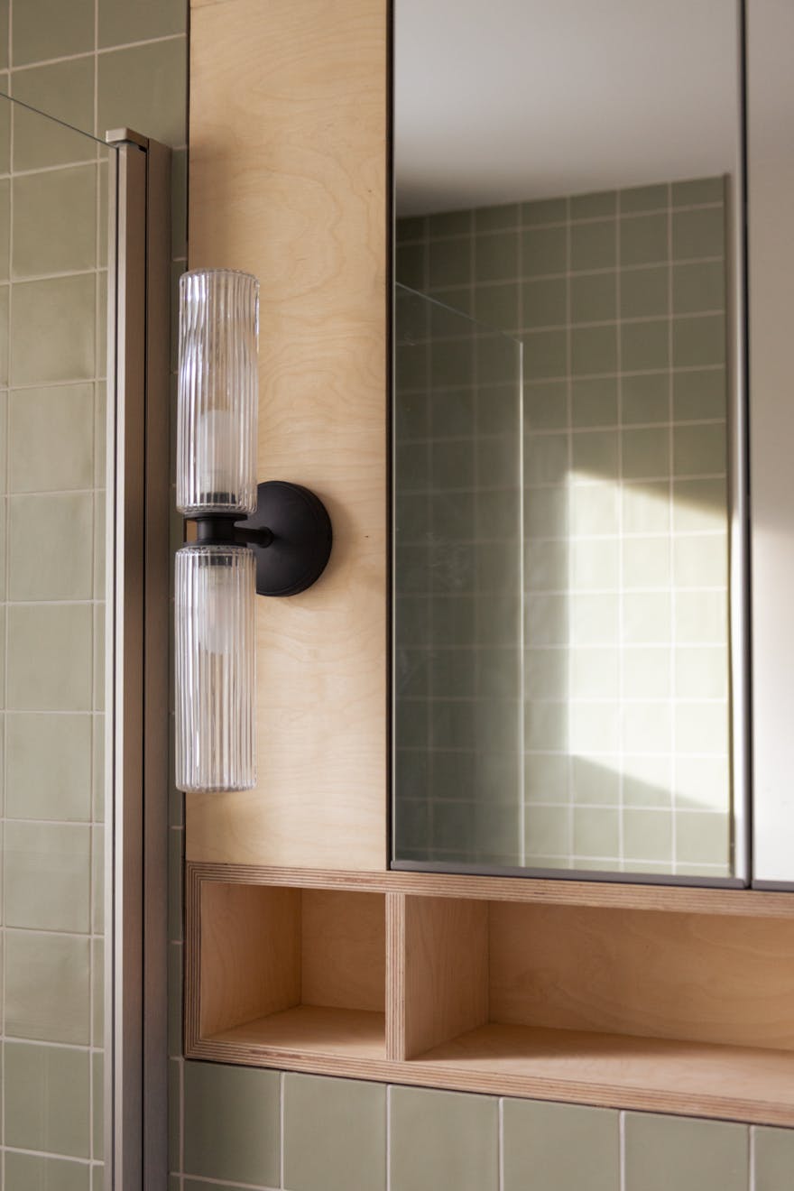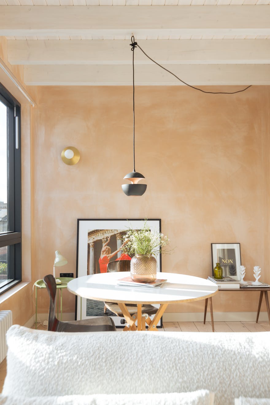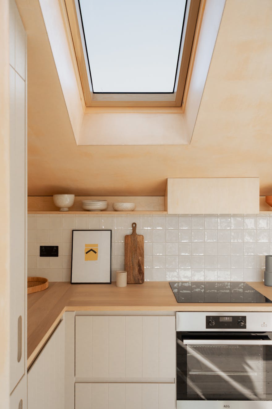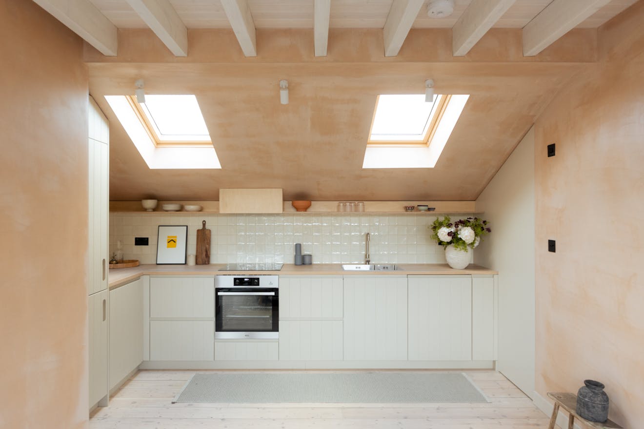 Ascending the sage-green stairs, you’ll find a large, cleverly recessed loft space opposite a Serge Mouille–style wall light. On the top floor, a wall of Idealcombi Danish glazing floods the living and kitchen area with natural light, complemented by a recessed Forest curtain rail. The plaster walls have been sealed to retain their dusty pink hue, while oak floorboards, reclaimed from other parts of the building and treated with Osmo wax, which add warmth underfoot. The bespoke BLOQ Design kitchen fronts are painted in Cloth Drop by Farrow & Ball and house integrated appliances that tuck neatly beneath the pitched roofline.