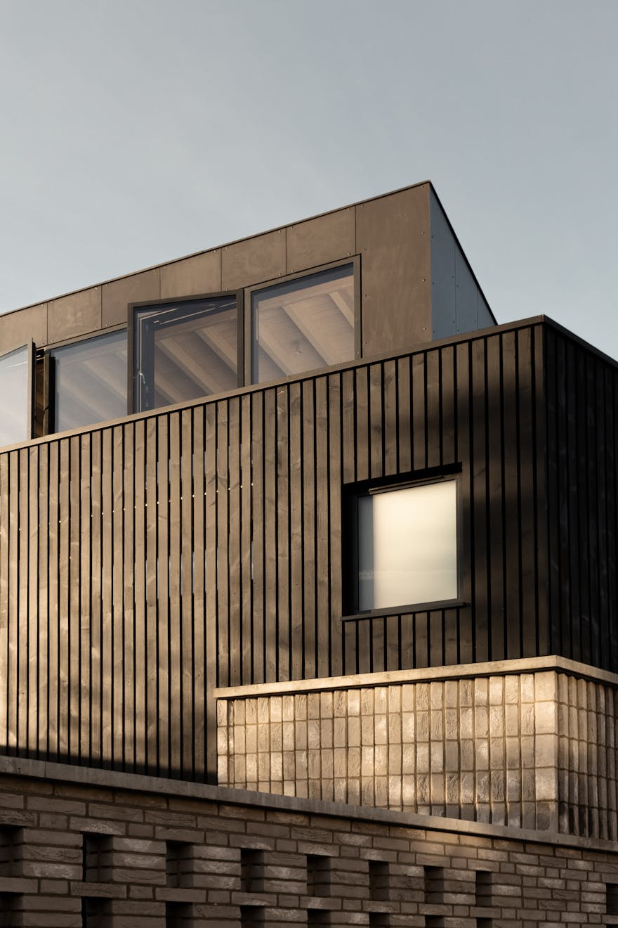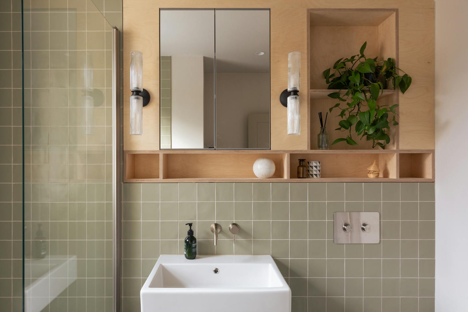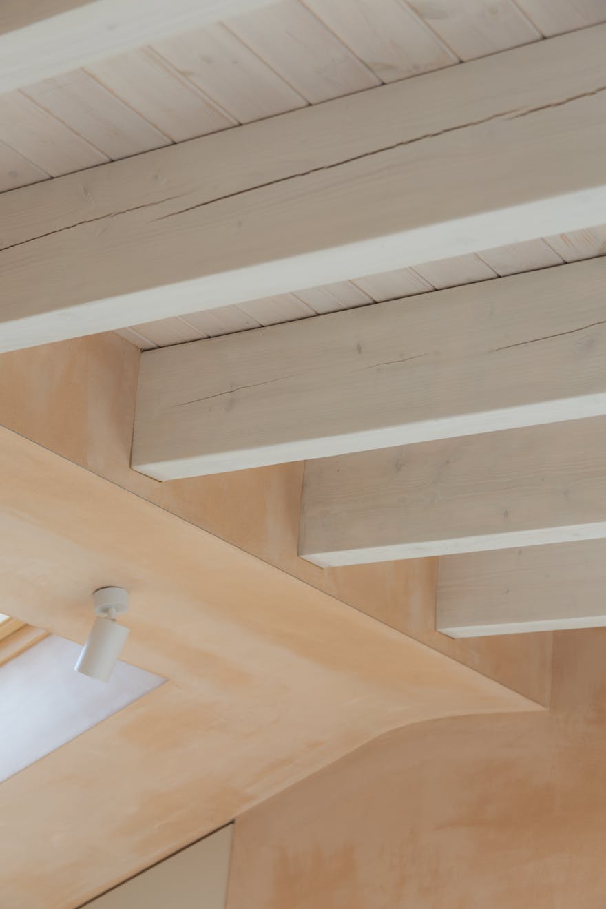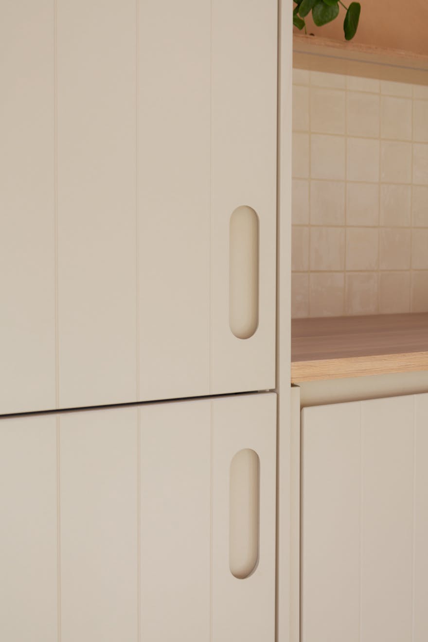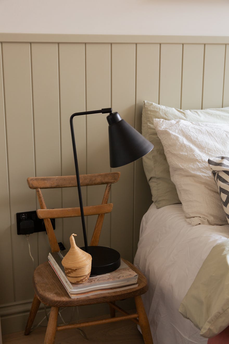 Ascending the sage-green stairs, you’ll find a large, cleverly recessed loft space opposite a Serge Mouille–style wall light. On the top floor, a wall of Idealcombi Danish glazing floods the living and kitchen area with natural light, complemented by a recessed Forest curtain rail. The plaster walls have been sealed to retain their dusty pink hue, while oak floorboards, reclaimed from other parts of the building and treated with Osmo wax, which add warmth underfoot. The bespoke BLOQ Design kitchen fronts are painted in Cloth Drop by Farrow & Ball and house integrated appliances that tuck neatly beneath the pitched roofline.