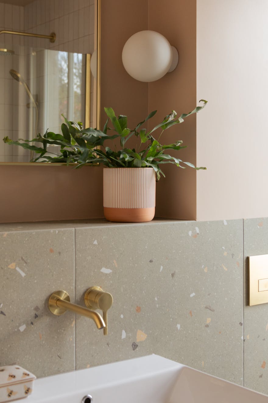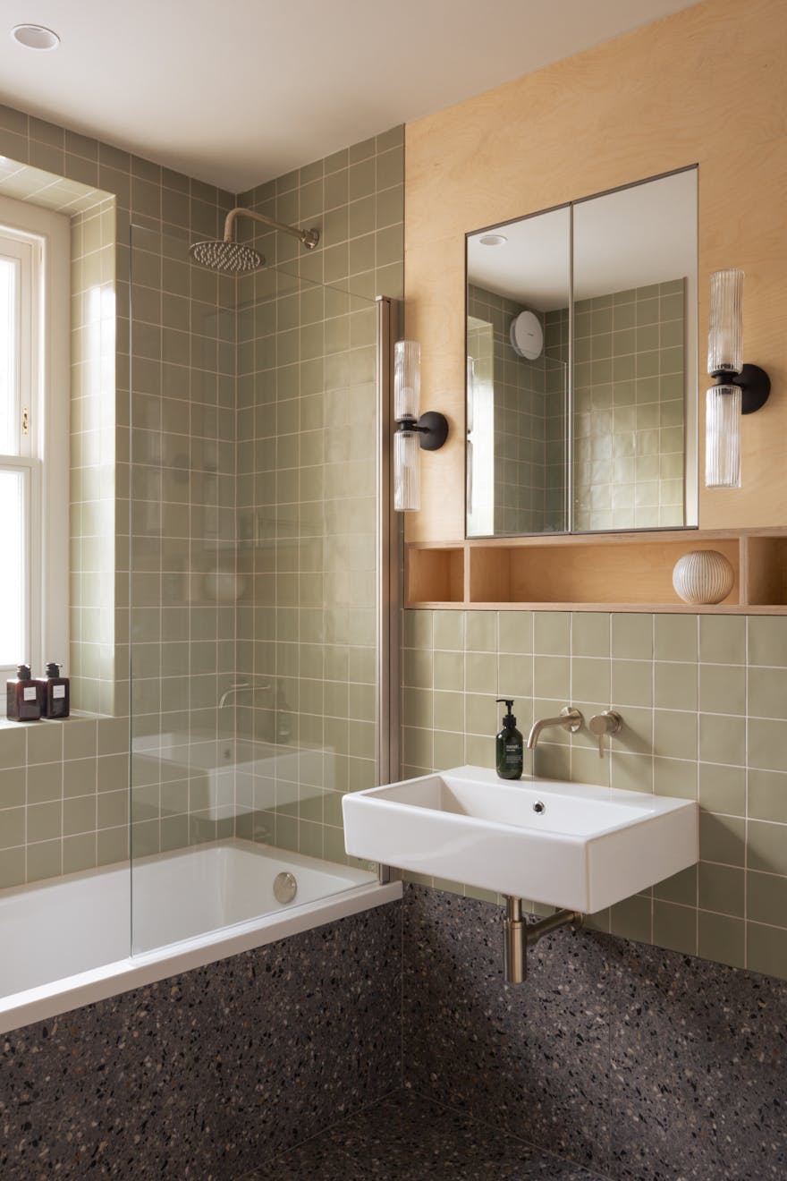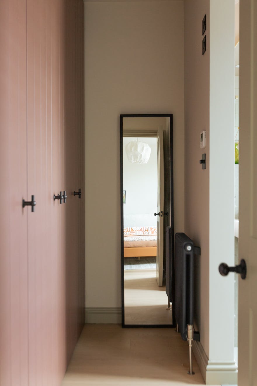 Entry is via a communal hallway with Claybrook tiles underfoot. Sisal-style carpeted stairs lead to the first floor, where the bedrooms and bathrooms are located. At the front of the plan is a bedroom with a cleverly designed walk-in wardrobe that leads to an en-suite shower room. Fired Earth terrazzo tiles and gold-tone hardware are offset by soft pink walls. The calming palette used in the bedrooms is Portland Stone Light by Little Greene, with Portland Stone on the skirting boards and doors.
