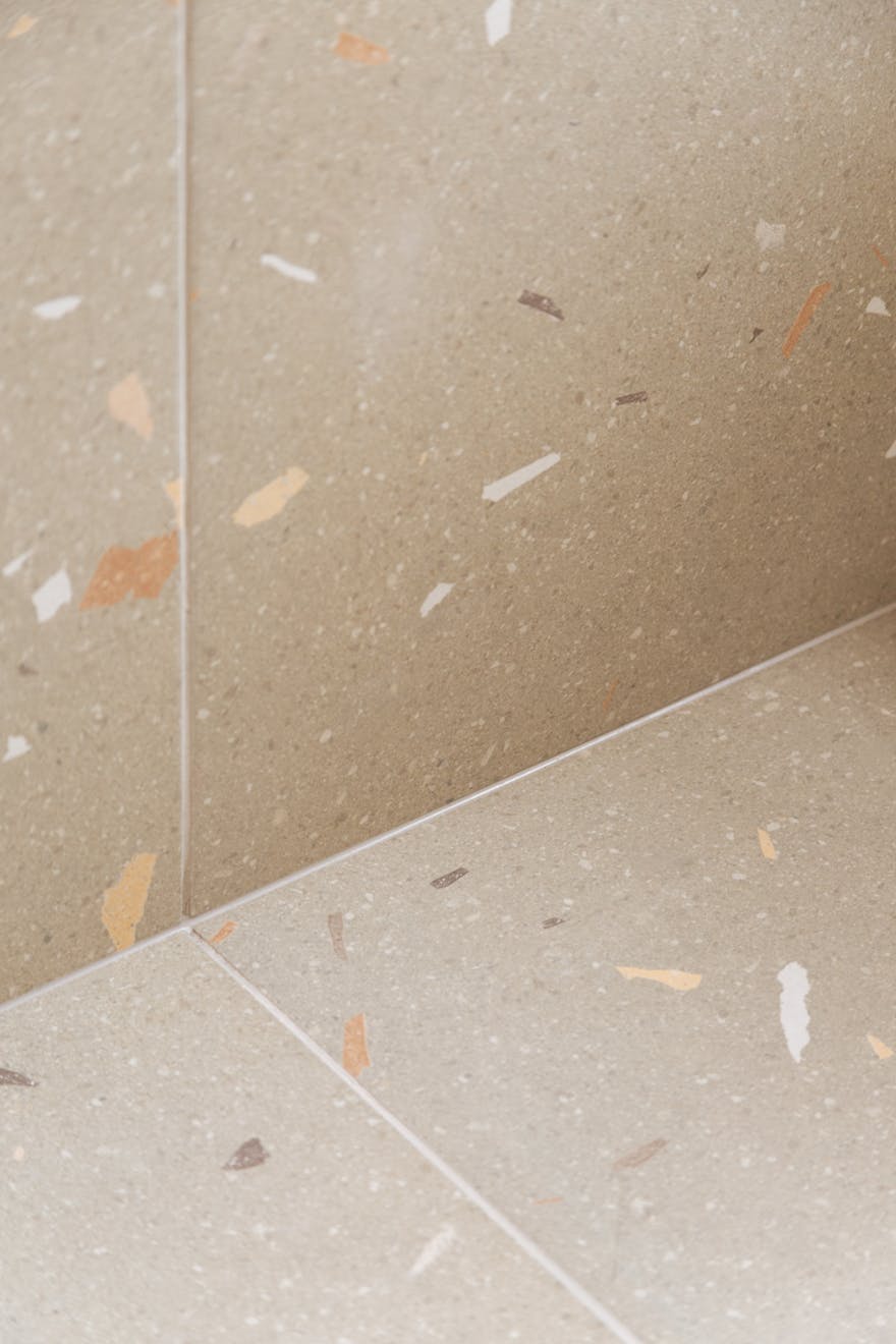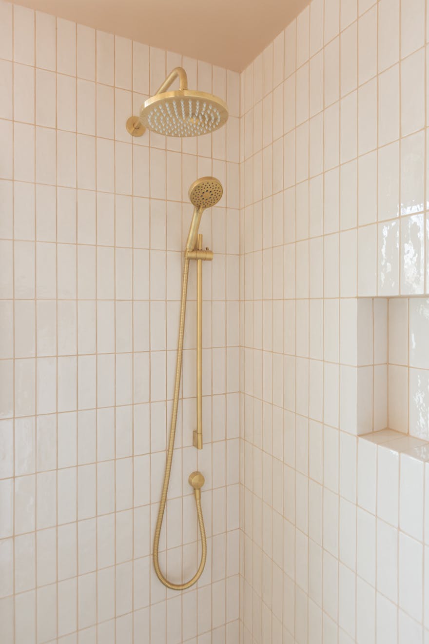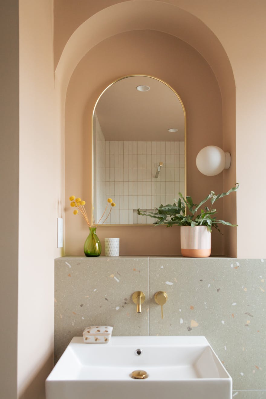 Entry is via a communal hallway with Claybrook tiles underfoot. Sisal-style carpeted stairs lead to the first floor, where the bedrooms and bathrooms are located. At the front of the plan is a bedroom with a cleverly designed walk-in wardrobe that leads to an en-suite shower room. Fired Earth terrazzo tiles and gold-tone hardware are offset by soft pink walls. The calming palette used in the bedrooms is Portland Stone Light by Little Greene, with Portland Stone on the skirting boards and doors.