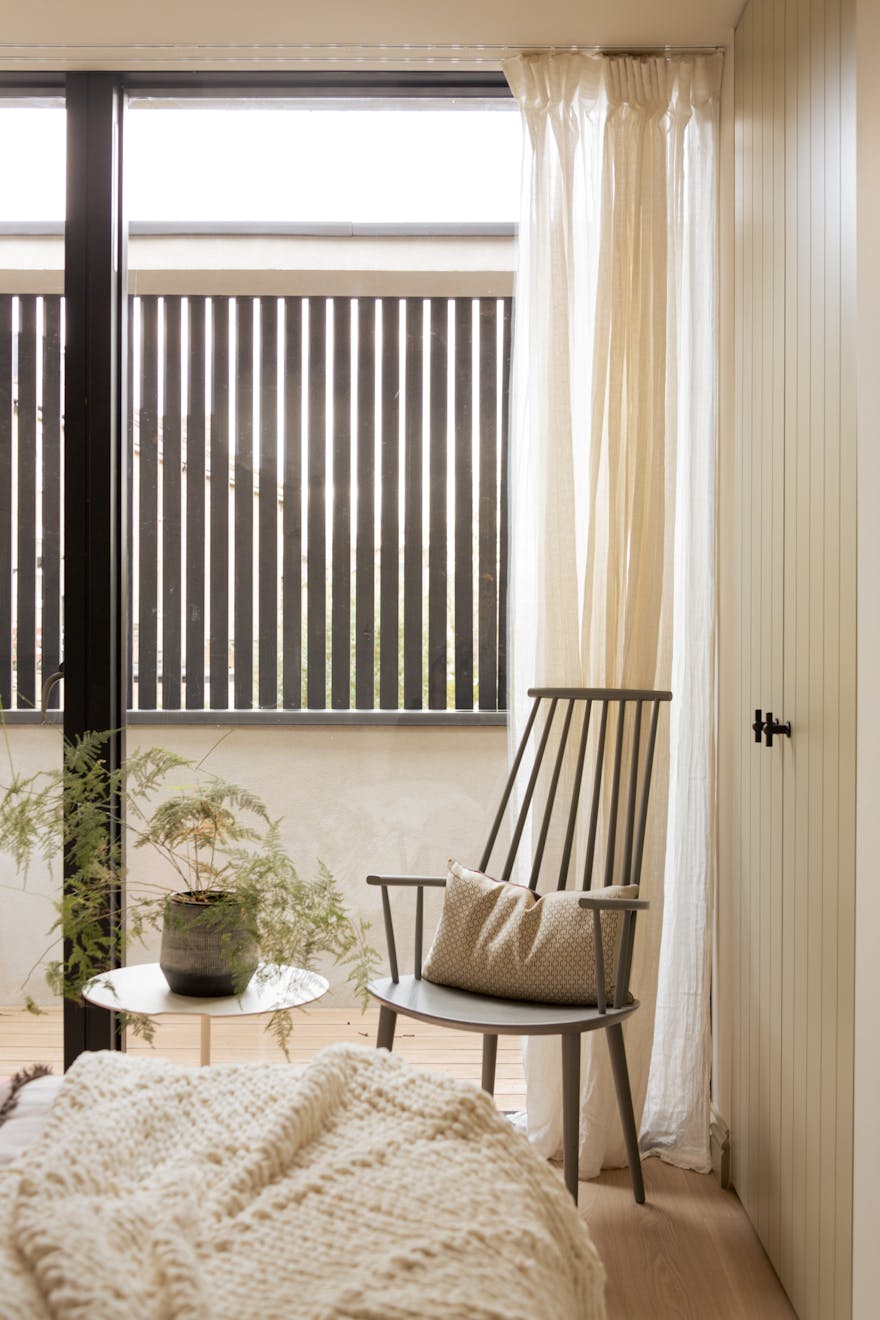 At the rear, there is a spacious bedroom with built-in wardrobe storage and a sun-catching balcony that runs the width of the room. Providing both privacy and an outdoor retreat, the balcony has ample space for planting and a small table and chairs, making it an ideal spot for morning coffee. Adjacent to this bedroom is a family bathroom with Britton hardware, Domus tiles and a Pelham towel radiator.