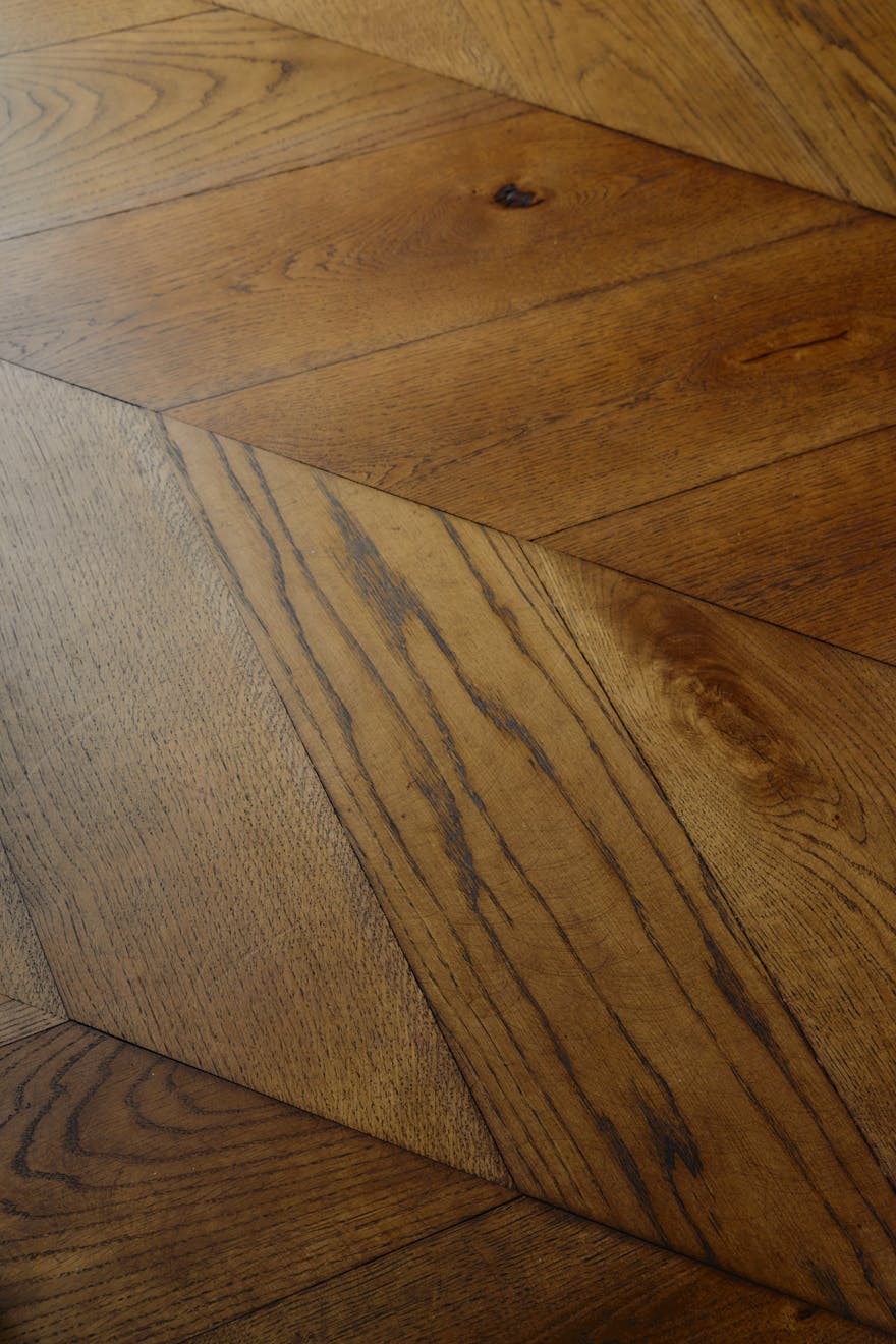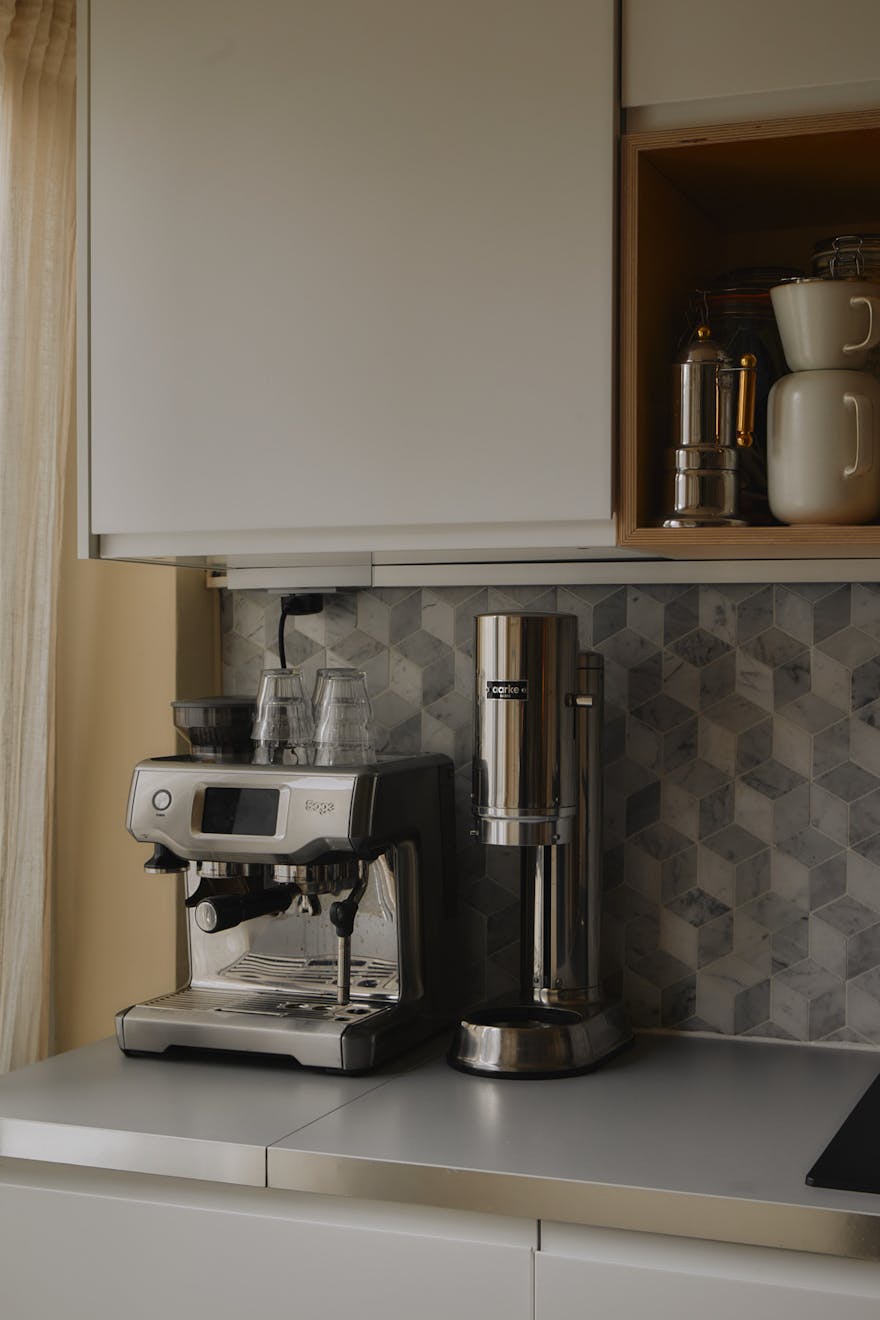 At the rear, the kitchen, finished with crisp white cabinetry and stainless steel countertops, strikes a clean, utilitarian note, softened by natural light that pours in from the garden beyond. Chevron flooring runs throughout, tying each space together and adding a sense of movement and continuity.
