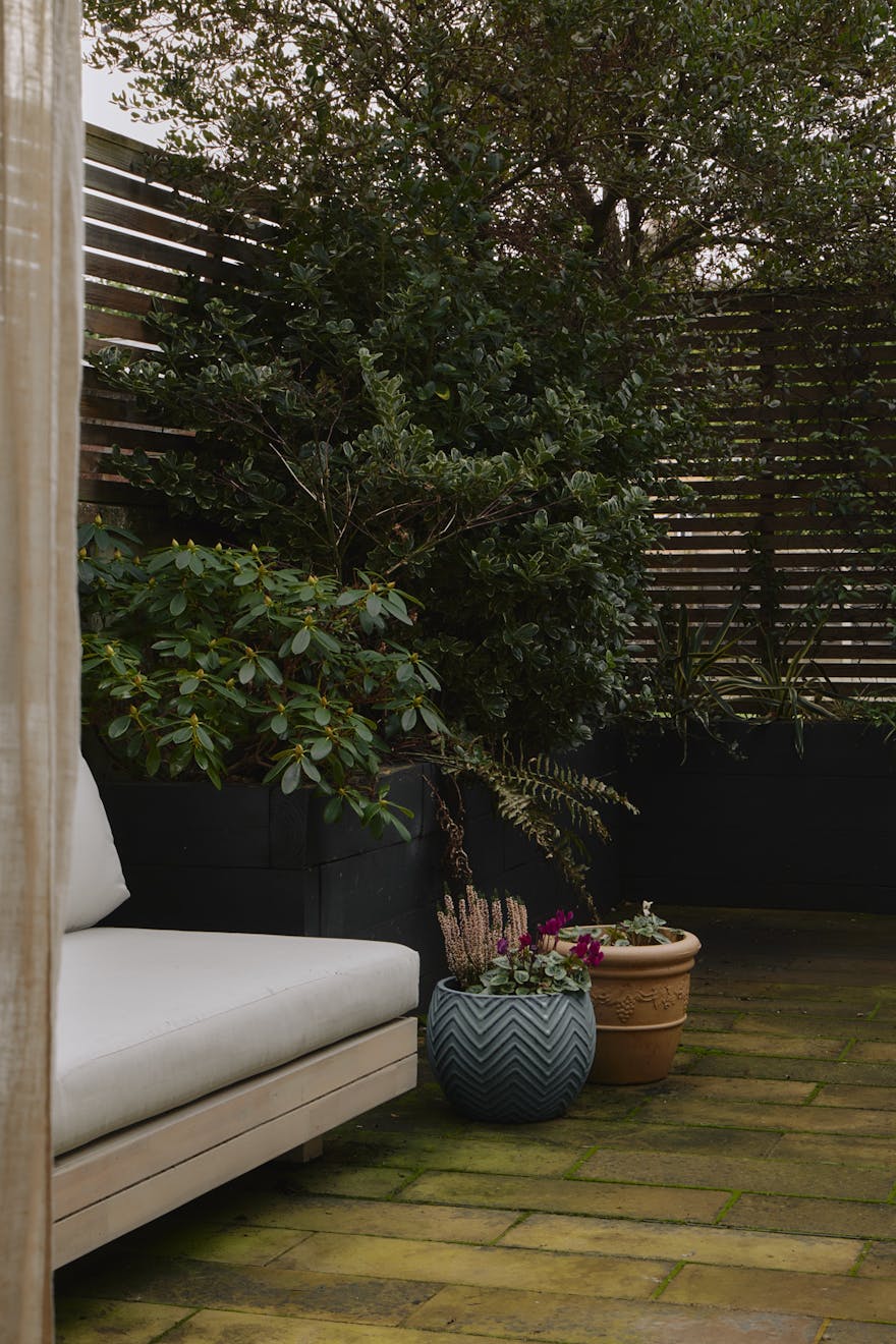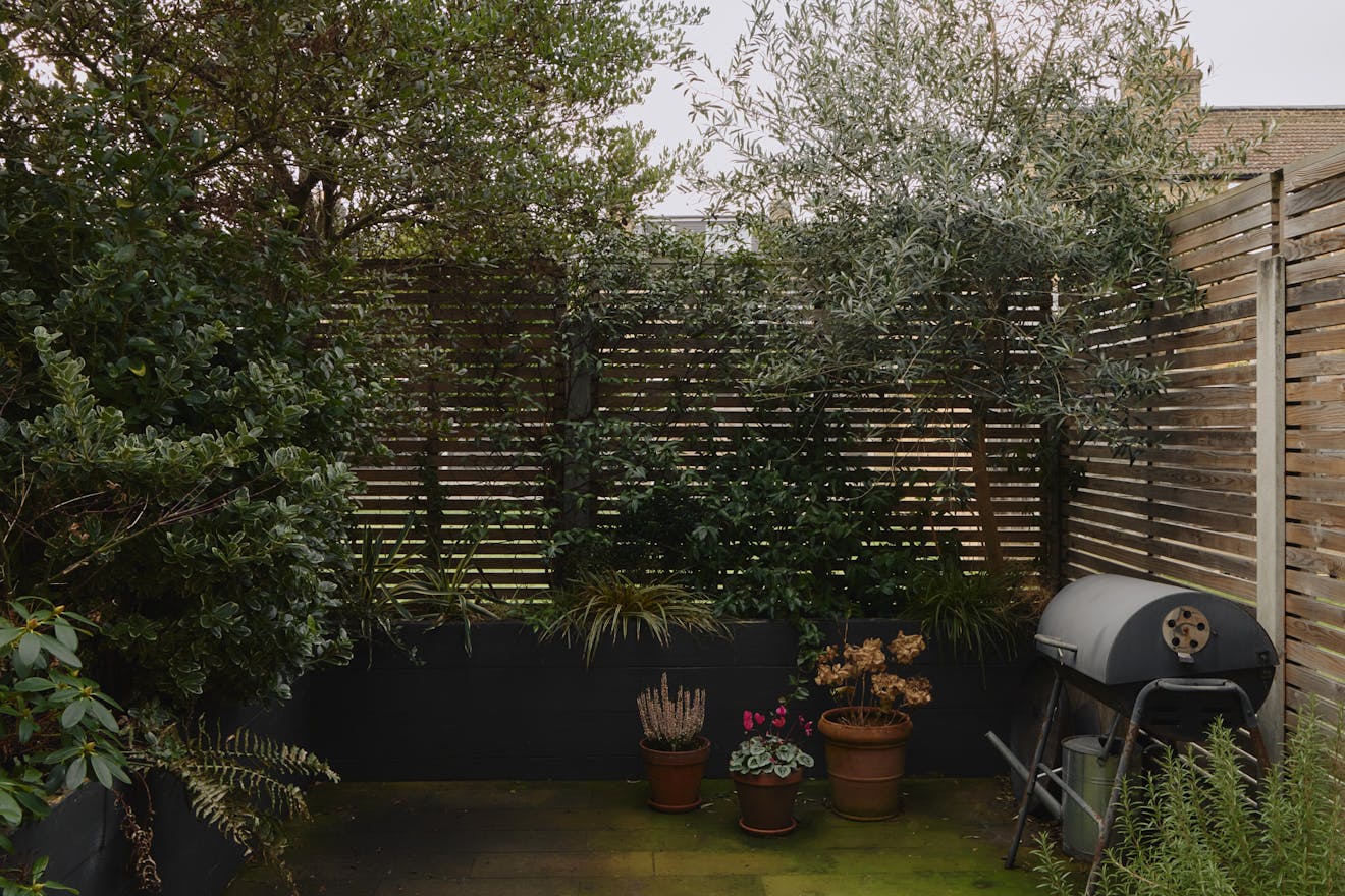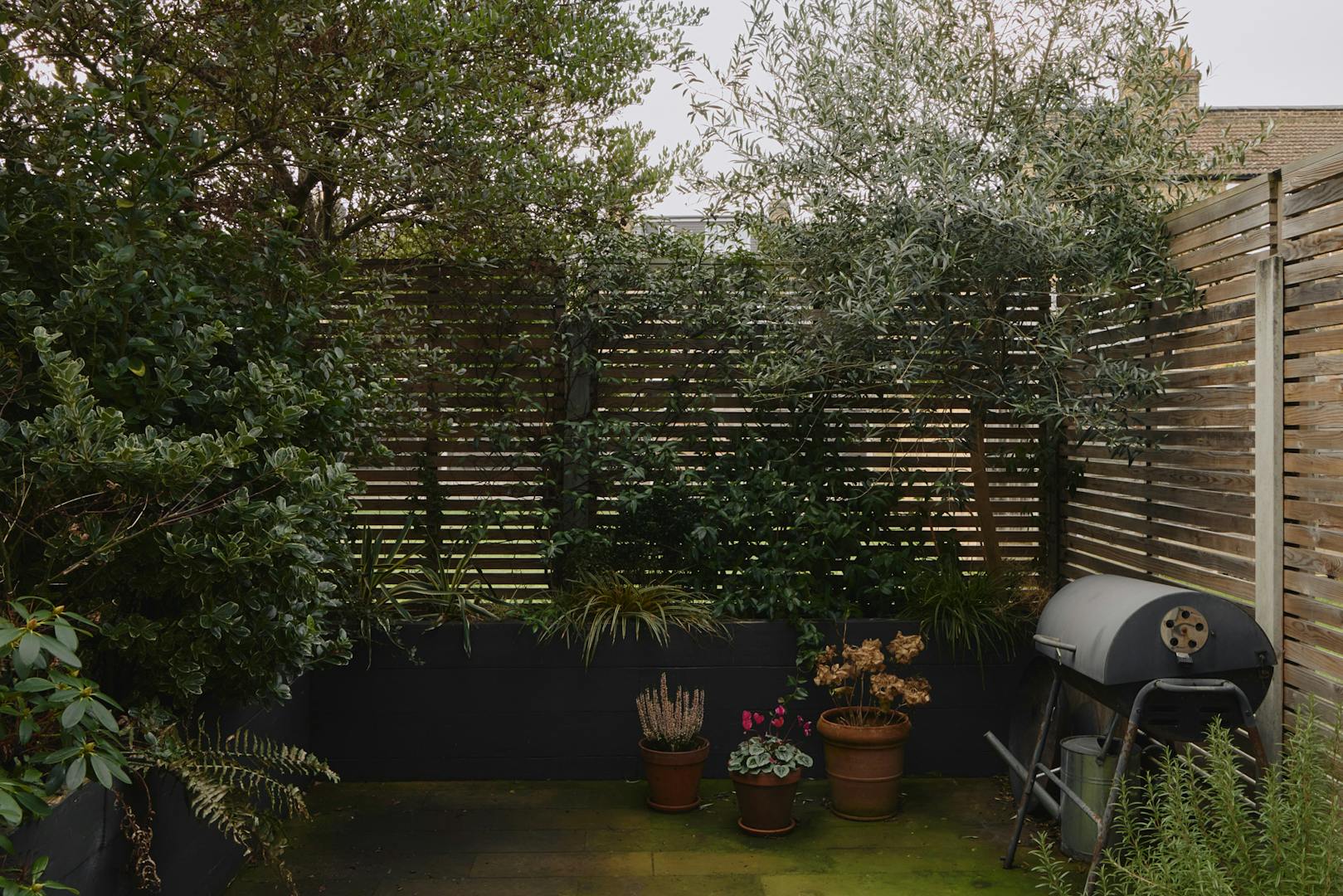 French doors open directly from the kitchen onto a secluded patio garden, extending the living space outdoors and inviting natural light deep into the home. The garden is bordered by timber batten fencing and mature planting — a carefully composed outdoor space designed for privacy, calm, and low-maintenance enjoyment.