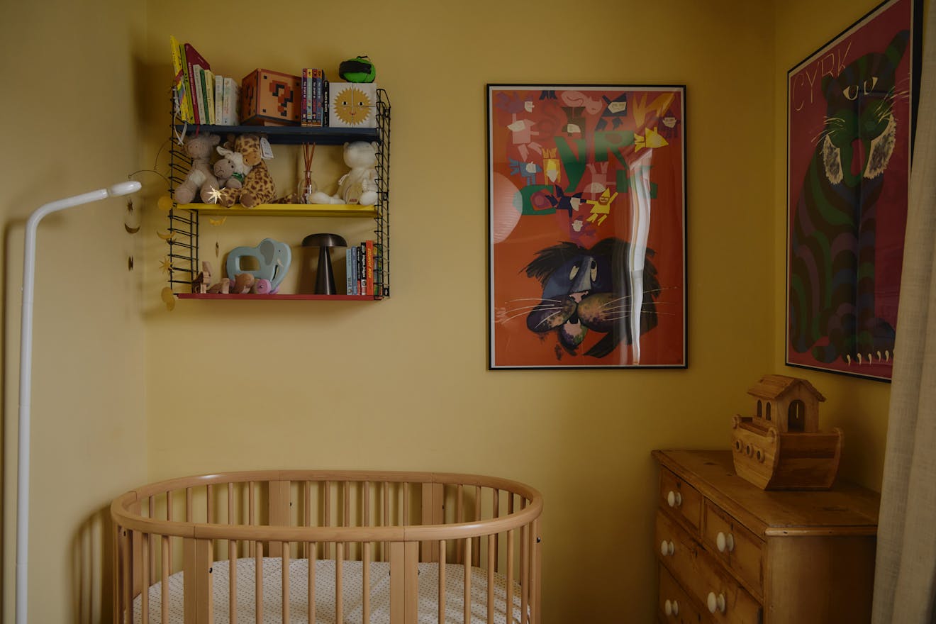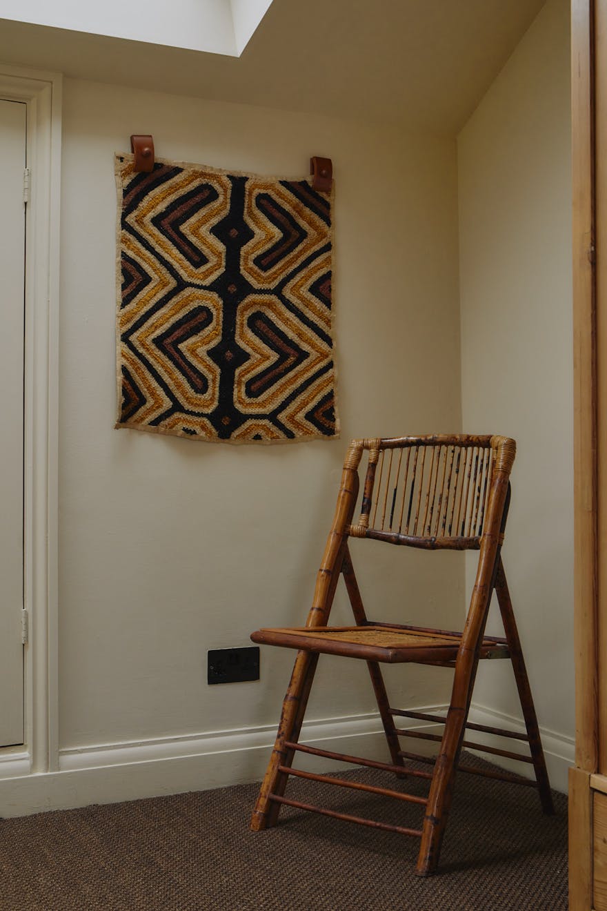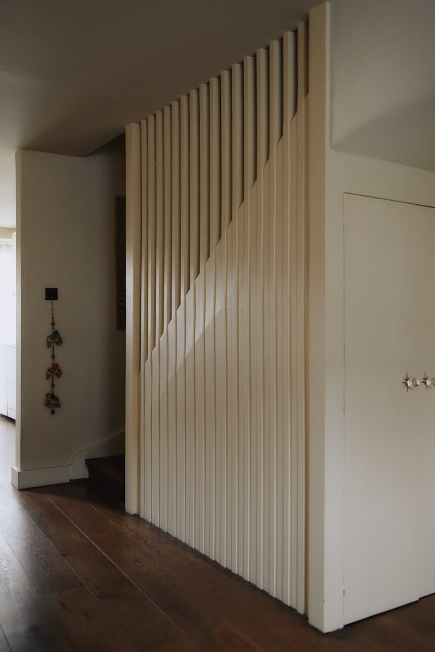 The ground floor unfolds in a linear sequence of defined zones. To the front, the reception area is anchored by a large sash-style window, drawing in morning light and offering a calm place to unwind. Moving inward, the dining space is both practical and atmospheric, framed by a bespoke L-shaped plywood bench in a rich walnut hue, a tactile centrepiece, enhanced by the soft glow of a pendant light overhead.