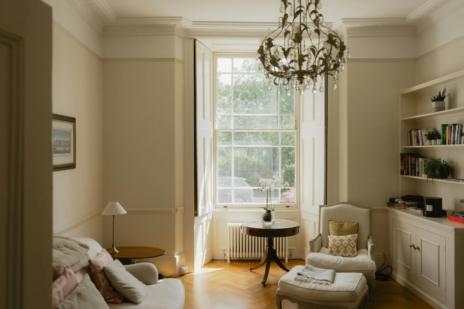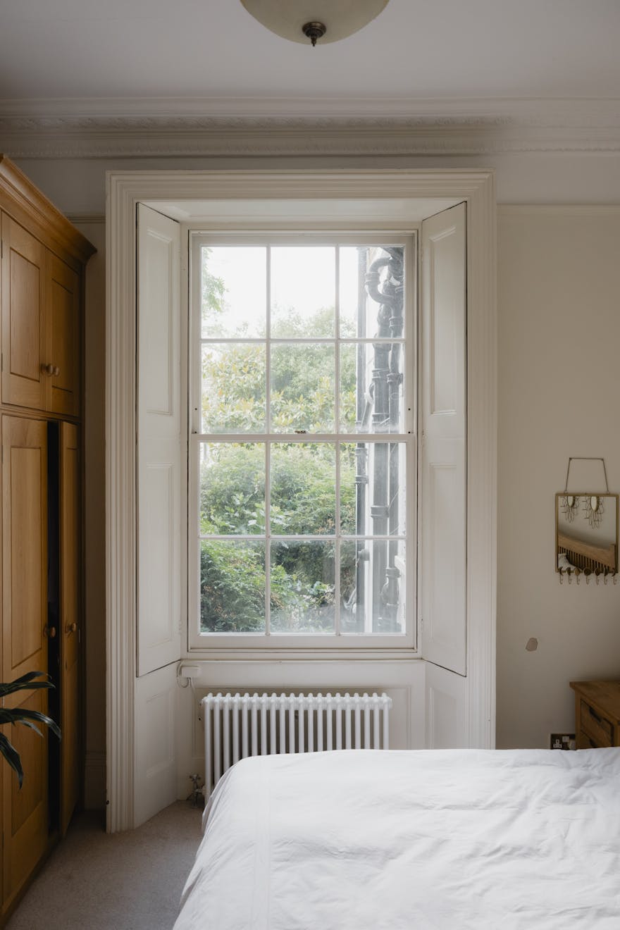 The front room overlooks the private residents' garden square, an enviable green space surrounded by Victorian architecture that offers a peaceful retreat from the bustle of the city. The tranquil atmosphere of the square, with its mature trees, lush flowerbeds, and green lawns, is exclusive to residents and forms the perfect backdrop to the home.