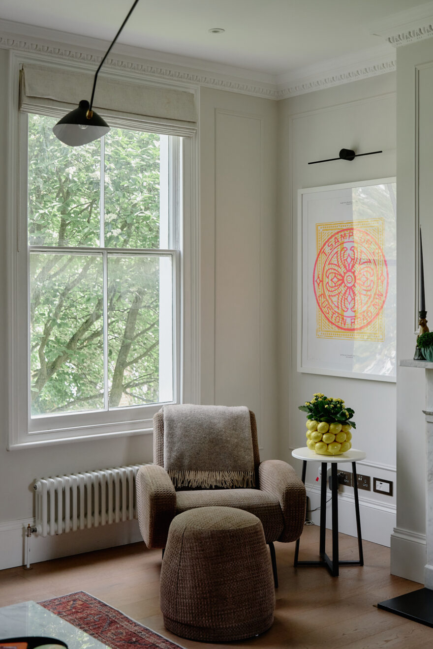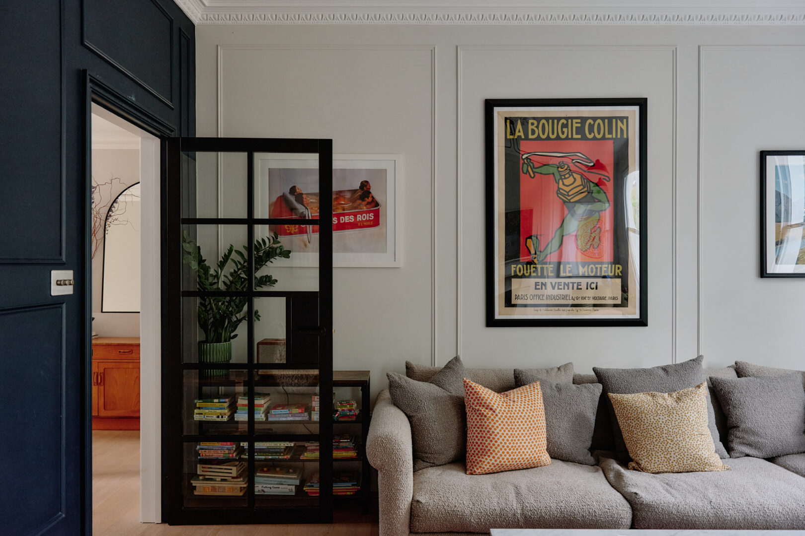 Walking beneath the curved arched, through a Crittall door, you’re welcomed into an impeccably designed semi open-plan reception and kitchen. Thoughtfully zoned, the living area features sash windows, a marble fireplace and engineered wood flooring, wall panelling with mood lighting, all set against a rich navy palette that brings depth and warmth. The verdant outlook brings a sense of calm and a connection to the outdoors.