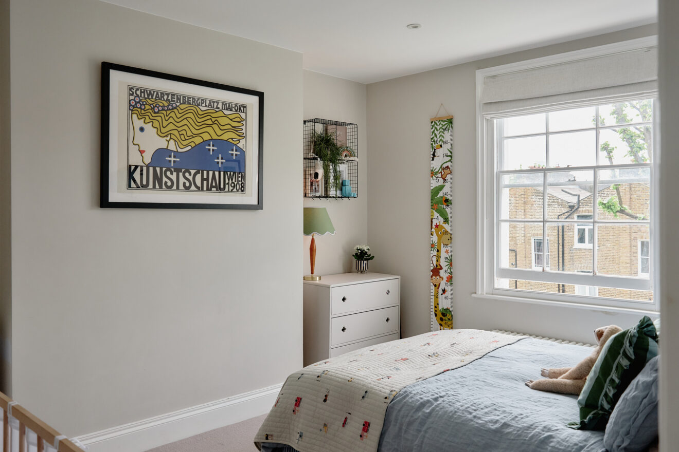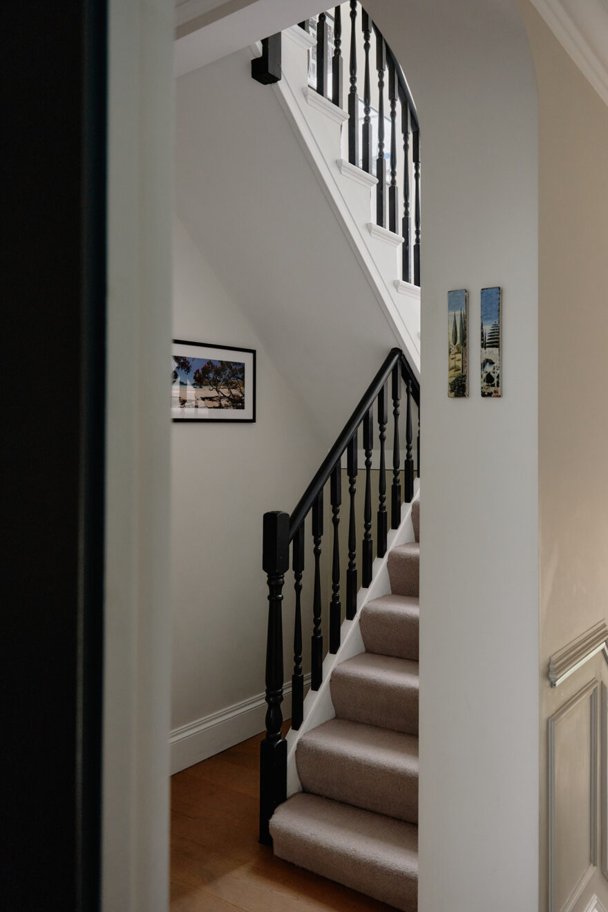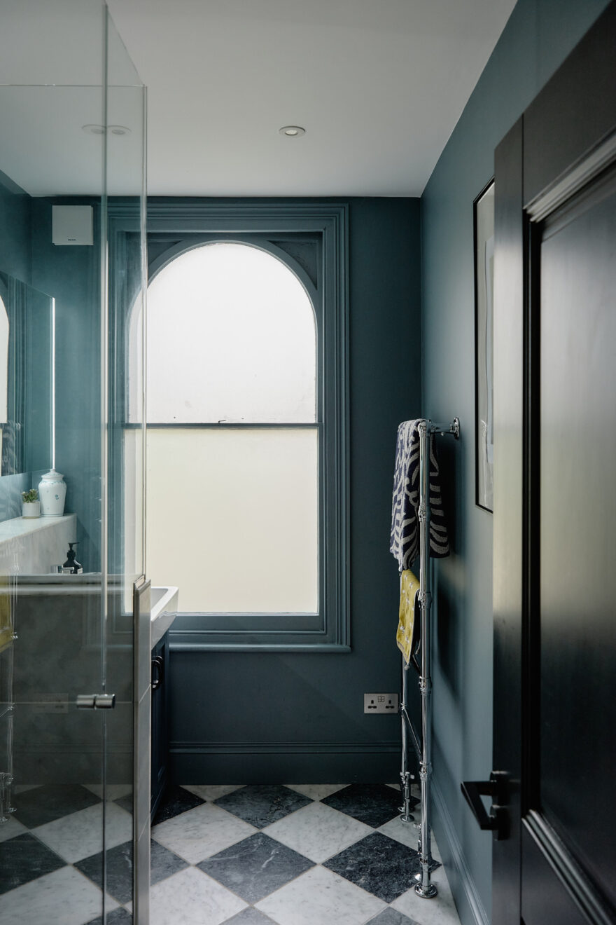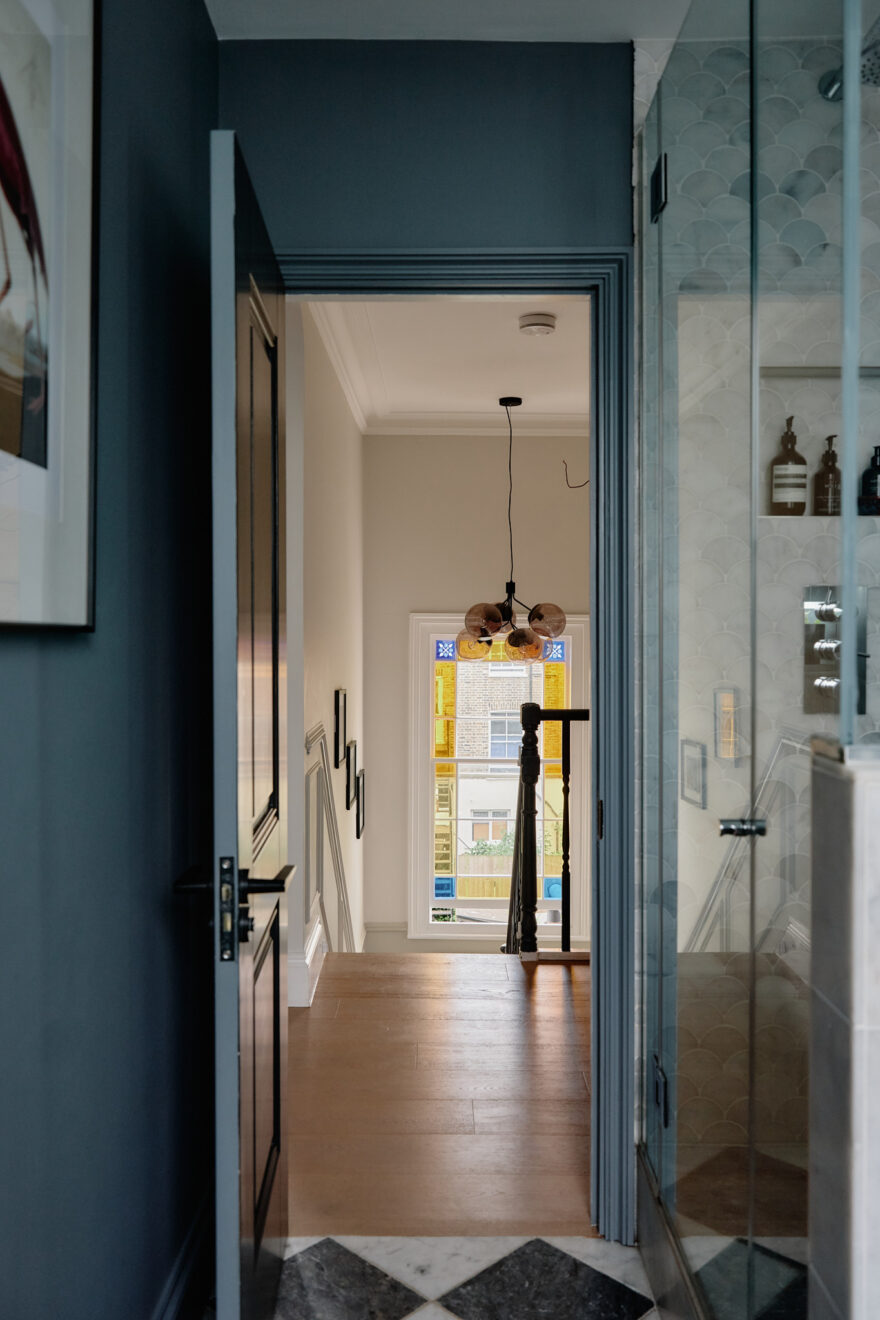 The south-facing kitchen is a striking space, bespoke cabinetry in deep navy, finished with brass hardware, paired with light Asbescato marble worktops and a full-height splashback. Natural light pours in, enhancing the material palette. Also on this level, a generous bathroom, defined by checkerboard tiles and softly curved sash windows.
