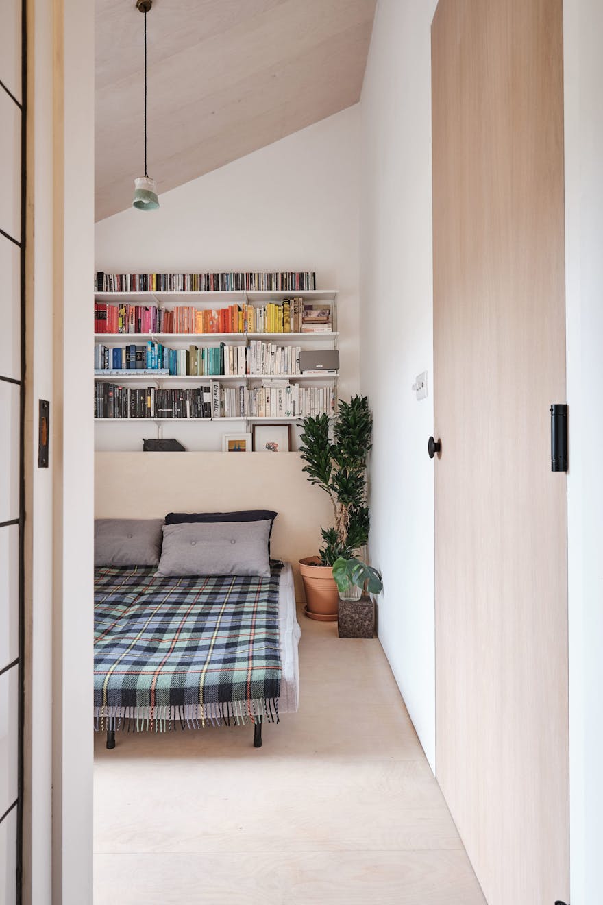 A conversion of the former attic space is accessed by a contemporary open plywood staircase. A design statement in itself, sunlight floods in between the steps and through the window at the top, highlighting the full-height, ply-clad walls. This birch ply cladding continues through to the walls of the master bedroom. Tucked away at the very top of the house, this incredibly quiet and private bedroom has clothes storage hidden behind custom curtained areas. Two windows make this another bright room. There’s a sweet original sash overlooking the neighbouring gardens and a new skylight - perfect for cloud-watching or falling asleep to the pitter-patter of rain. The en-suite bathroom on this level is particularly special, with another lovely skylight above the shower and handmade green tiles lining the room from floor to ceiling. The owner is not just an architect but a ceramicist as well (with a client list including Ottolenghi), so he specified the glaze for the tiles, which were made in Spain especially for this project.