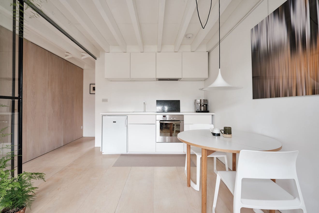 The open-plan kitchen/lounge faces the back of the house, with a view over the rooftops and leafy gardens of Barnsbury. This room is bathed in natural light from a large sash window, plus exposed ceiling rafters give real charm to the space. There’s a sleek but compact kitchen, with masses of additional hidden storage and a pull-out larder cupboard running along the wall that leads to the guest bedroom.