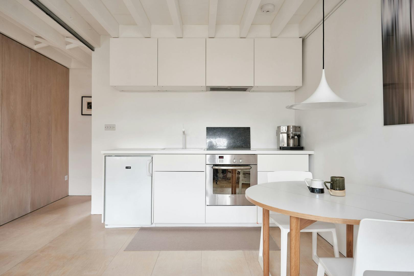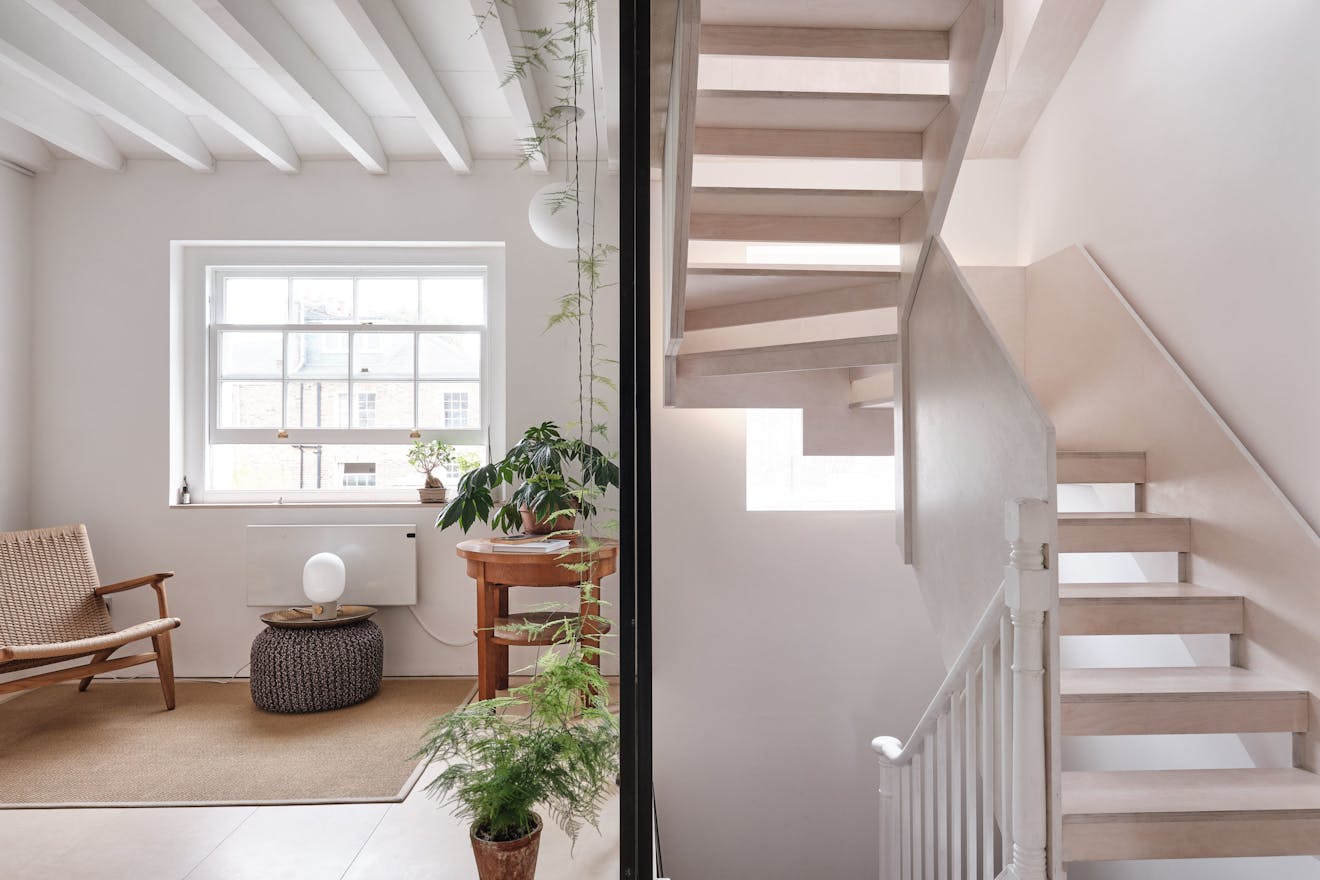 Already very quiet and peaceful, the sense of calm and cohesiveness throughout the flat is emphasised by a tonal palette of natural colours and textures. Considered details include sisal carpeting on the stairs and master bedroom, a custom-designed plywood staircase, shadow gaps, fitted wardrobes with cane webbing and oiled beech ply flooring that reflects the light beautifully.