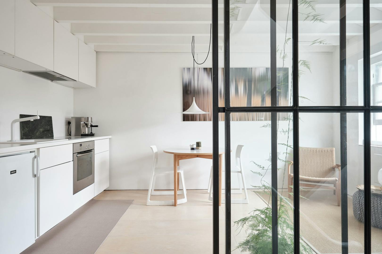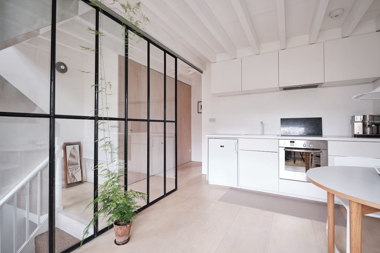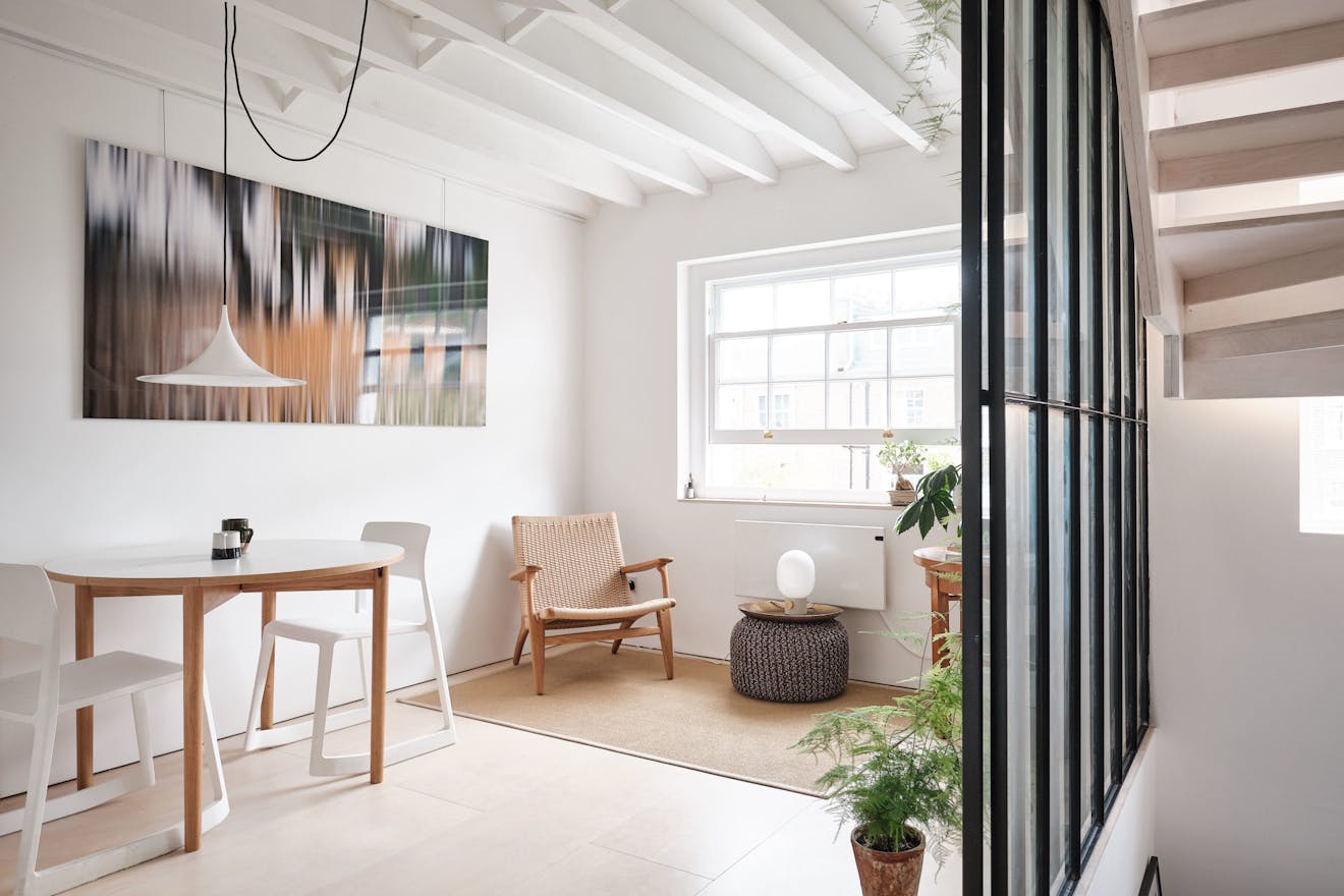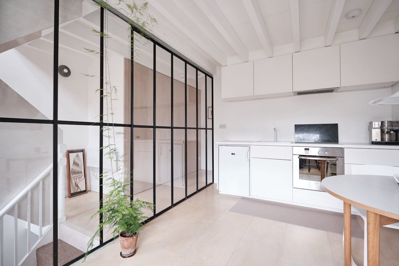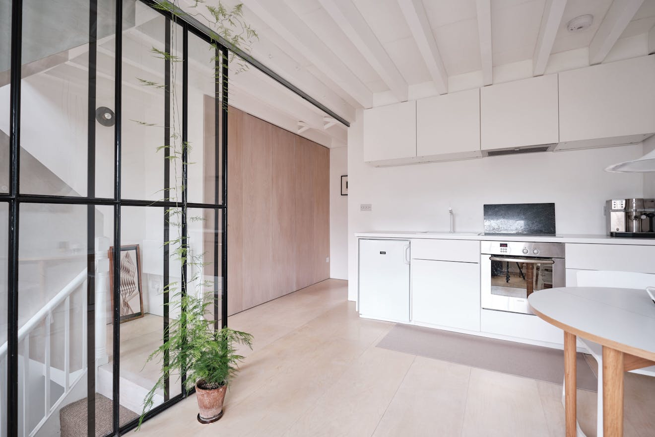 This characterful one / two-bedroom flat in the Barnsbury conservation area of Islington juxtaposes old and new to great effect after a complete renovation by its architect owner. Set on a smart residential street just 10 minutes’ walk from both Highbury and Islington and Canonbury stations, this top-floor home is an outstanding example of how to maximise light and storage in a Georgian property. The renovation opened up the individual rooms to create interesting sightlines and introduce modern, impactful elements such as a bespoke Crittall-style sliding screen across the living space.