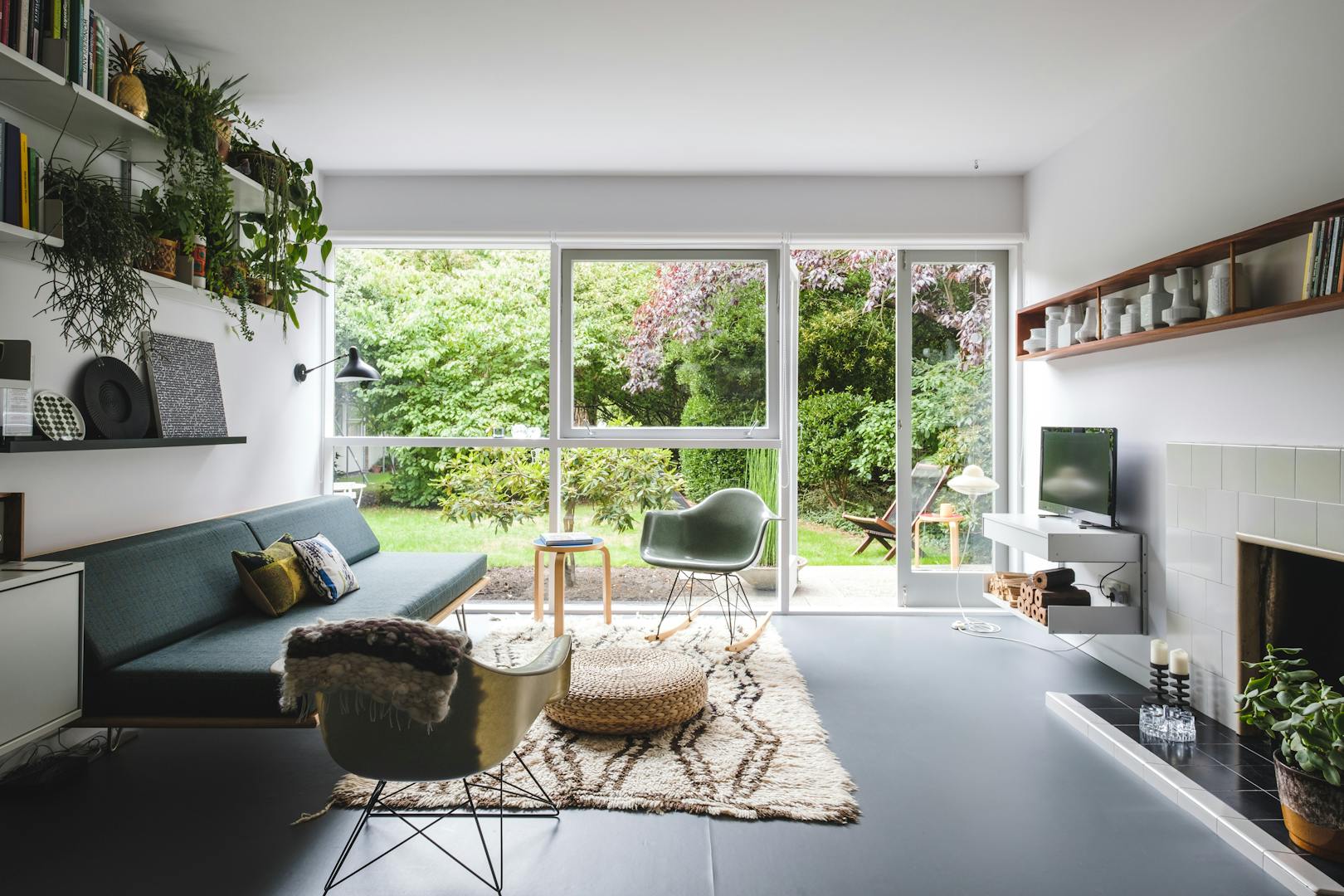 The recent sensitive refurbishment has included a complete rewiring and replastering and the installation of Webtech Elite underfloor heating (with very low running costs) and Forbo Marmoleum natural flooring throughout. The flat has been repainted with Farrow and Ball paints and original 1950s paint shades authorised by the Royal Institute of British Architects and the British Colour Council. Original fixtures have been restored - including kitchen units, the tiled (working) fire place and wooden book shelf designed by Eric Lyons himself.