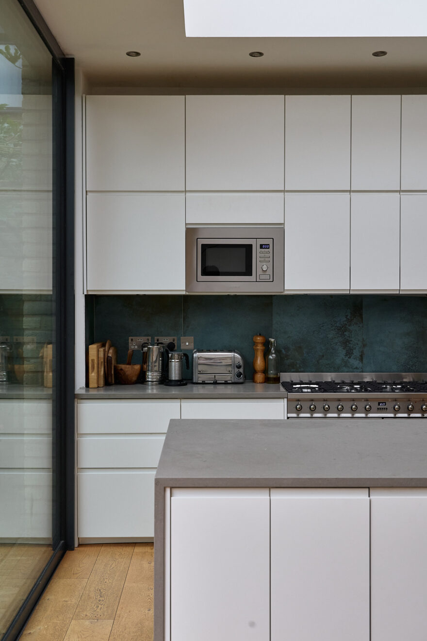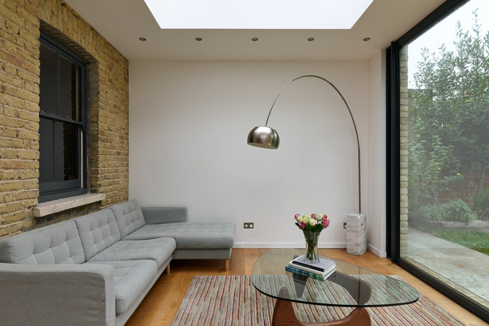Set well back from the road behind a generous front garden, the ground floor is arranged as a series of versatile reception rooms. At the front of the plan, two rooms feature wide original floorboards, four-panel doors and working fireplaces. A clear sightline from the hallway leads through an additional reception room to the modern rear extension, which runs the width of the home. This space is accessed via a subtle change in level, designed to maximise ceiling height, where a trio of skylights draws in abundant natural light. To the right, a sleek run of integrated white kitchen appliances, along with a SMEG gas oven, is complemented by a generous island, while a discreet door reveals a practical shower room, WC, and utility area. Expansive sliding glass doors retract to create a seamless connection between indoors and out, inviting effortless enjoyment of the garden. The space is wonderfully adaptable, with ample room for both relaxed seating and dining.