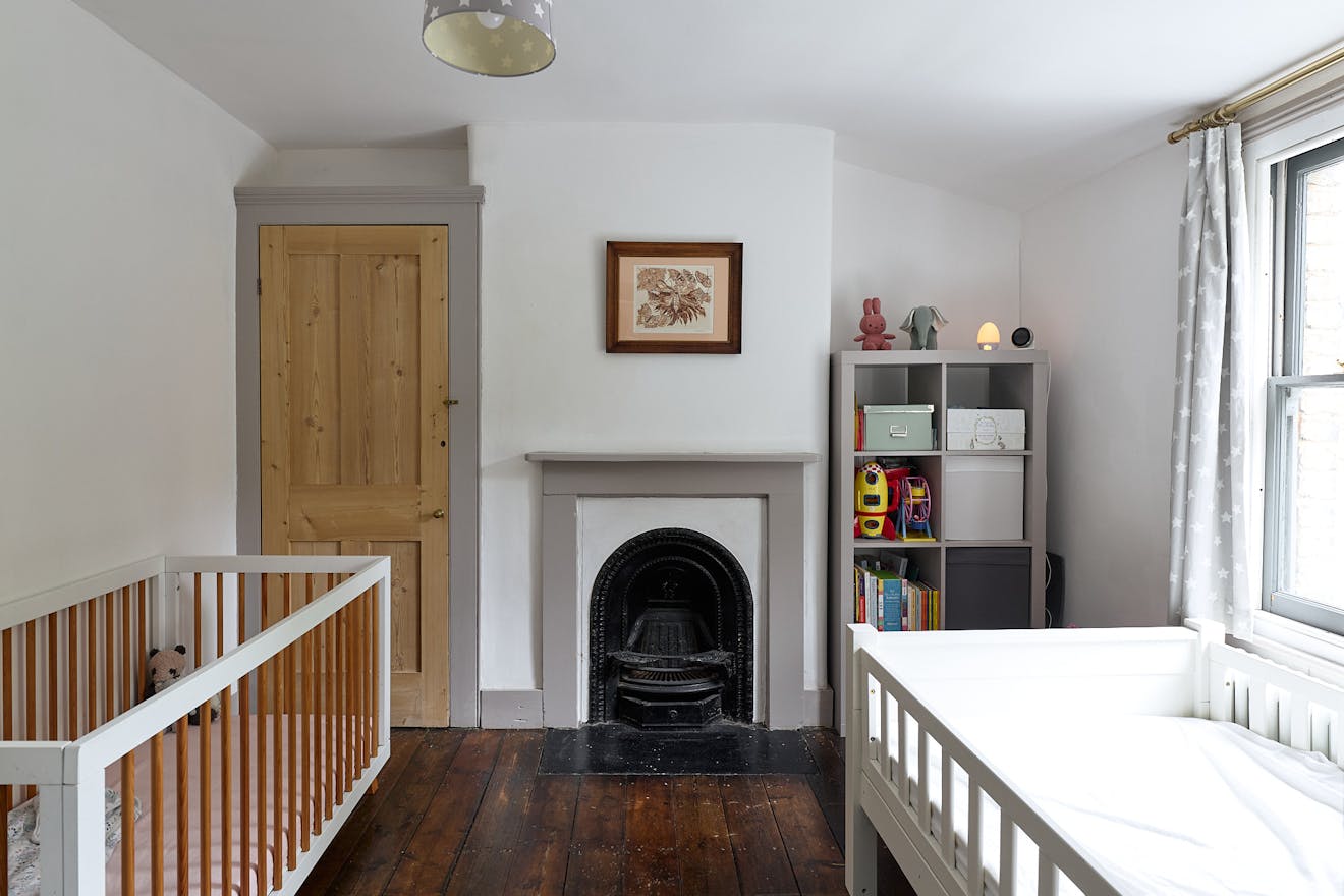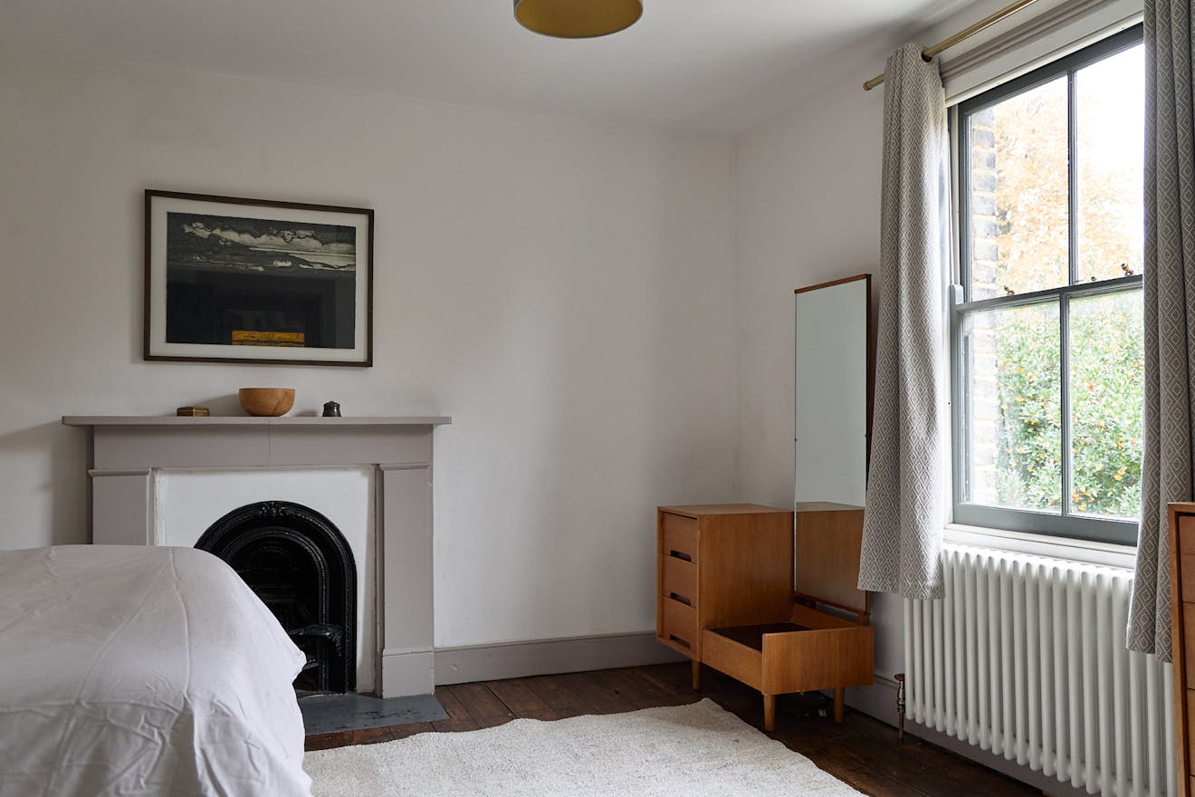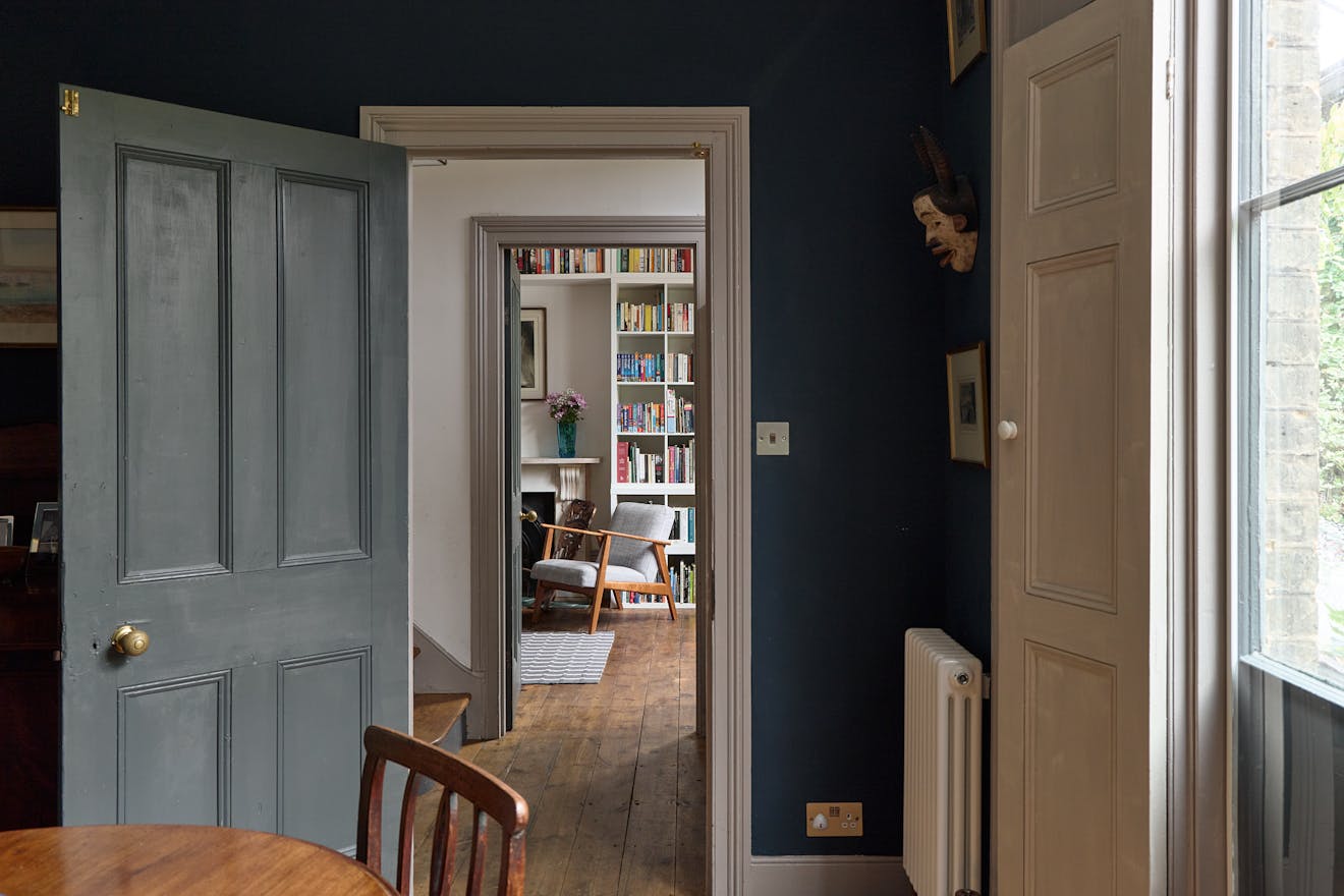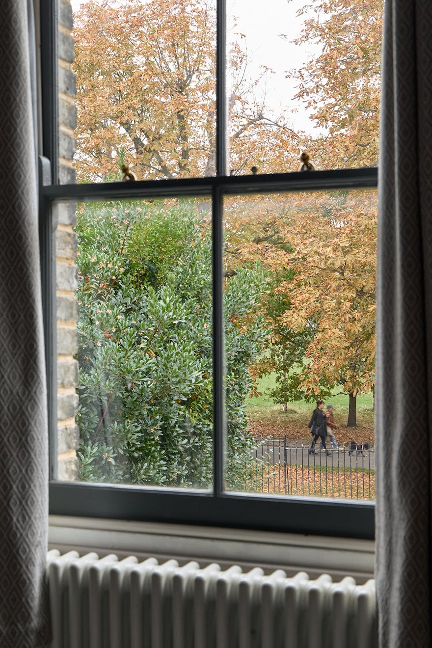 Ascending the staircase to the first floor, two of the bedrooms enjoy views of the tree-lined park through original sash windows. Subtle heritage tones are used throughout, with soft grey and navy hues highlighting the woodwork and fireplace mantels. At the rear, the main bathroom overlooks the garden and is accompanied by an additional shower room. This floor also includes a third bedroom and a separate storage room.