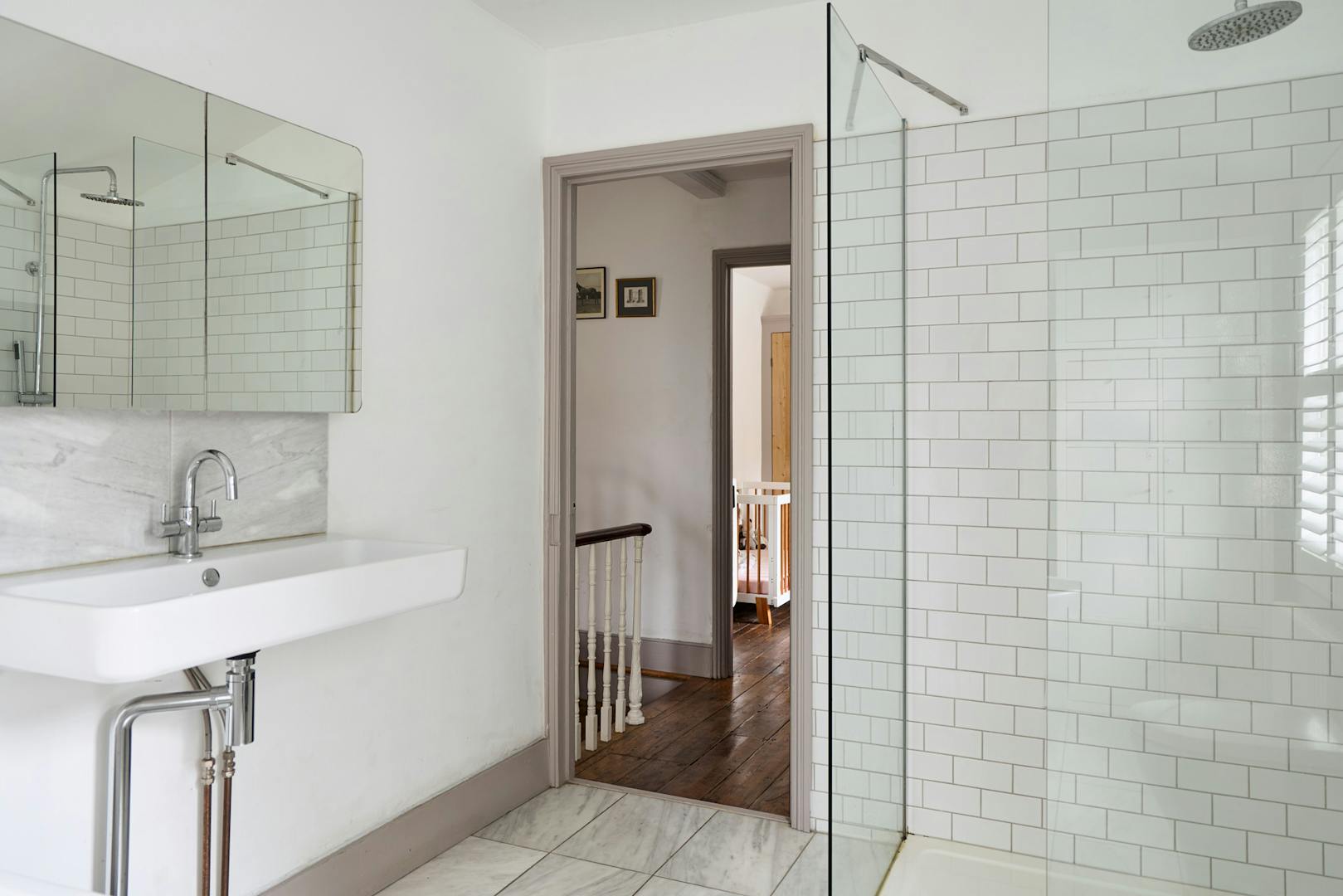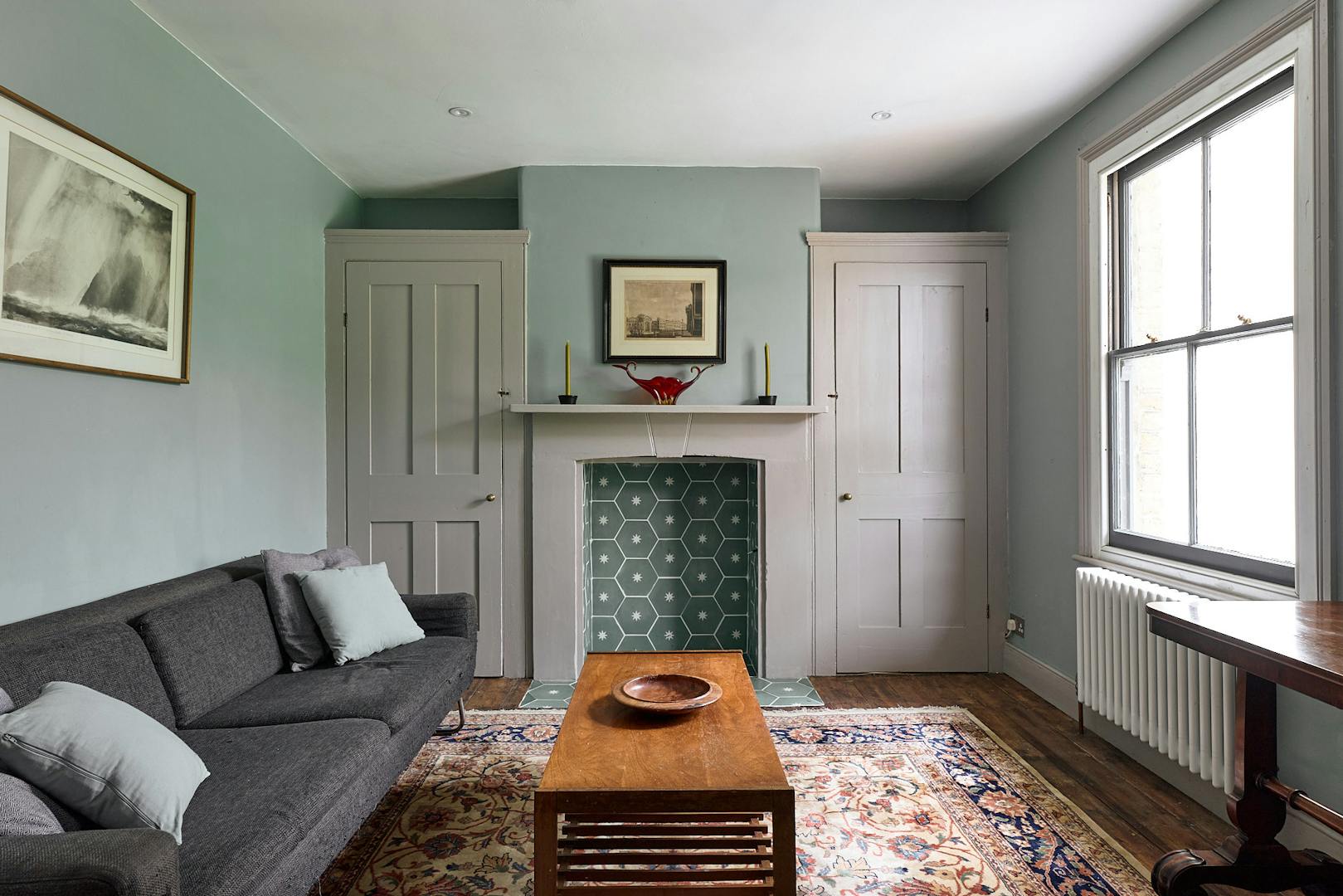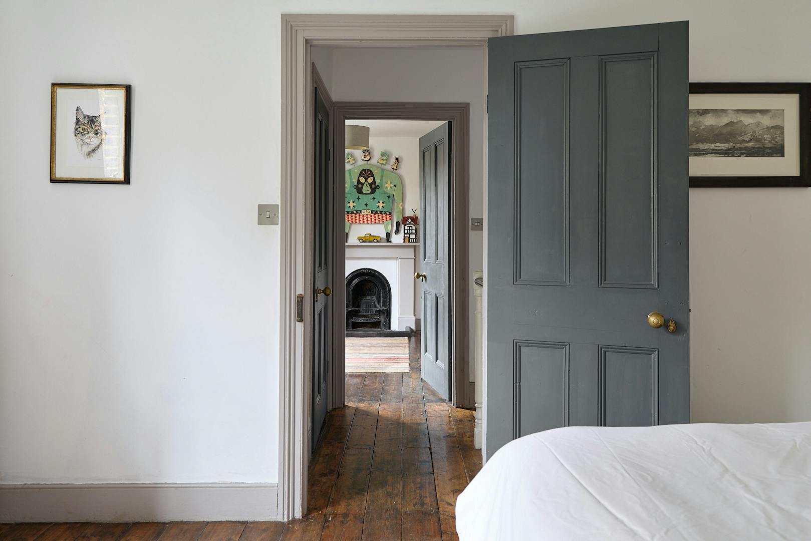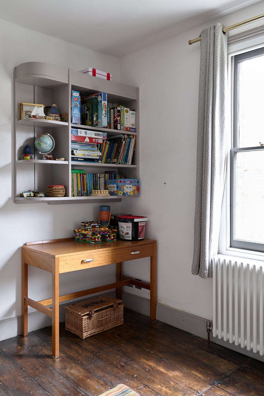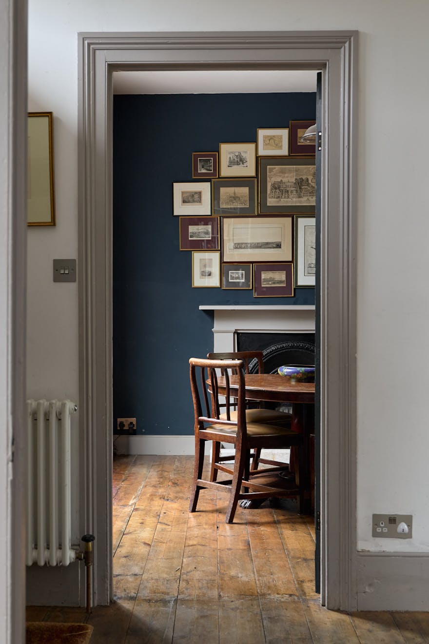 Ascending the staircase to the first floor, two of the bedrooms enjoy views of the tree-lined park through original sash windows. Subtle heritage tones are used throughout, with soft grey and navy hues highlighting the woodwork and fireplace mantels. At the rear, the main bathroom overlooks the garden and is accompanied by an additional shower room. This floor also includes a third bedroom and a separate storage room.