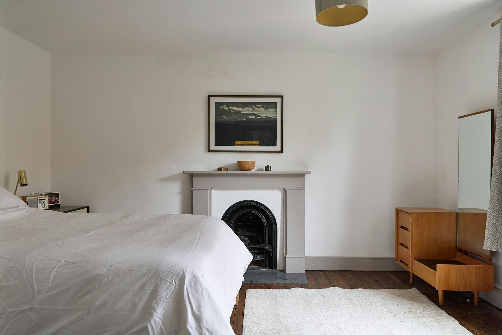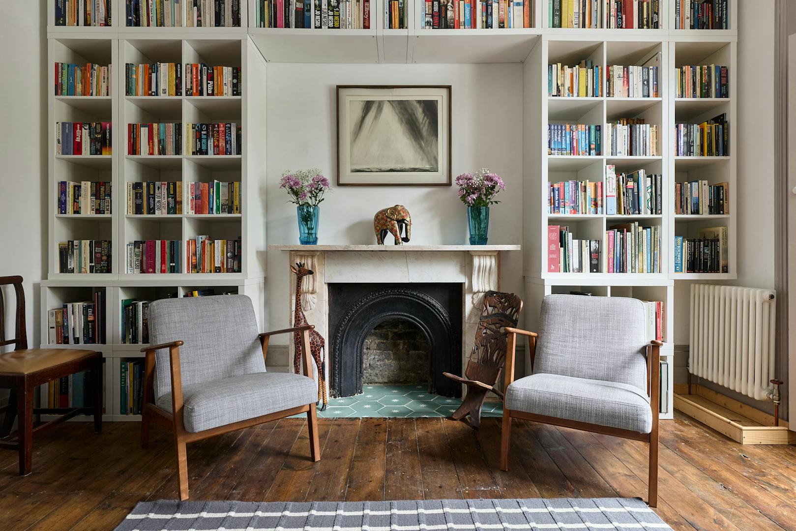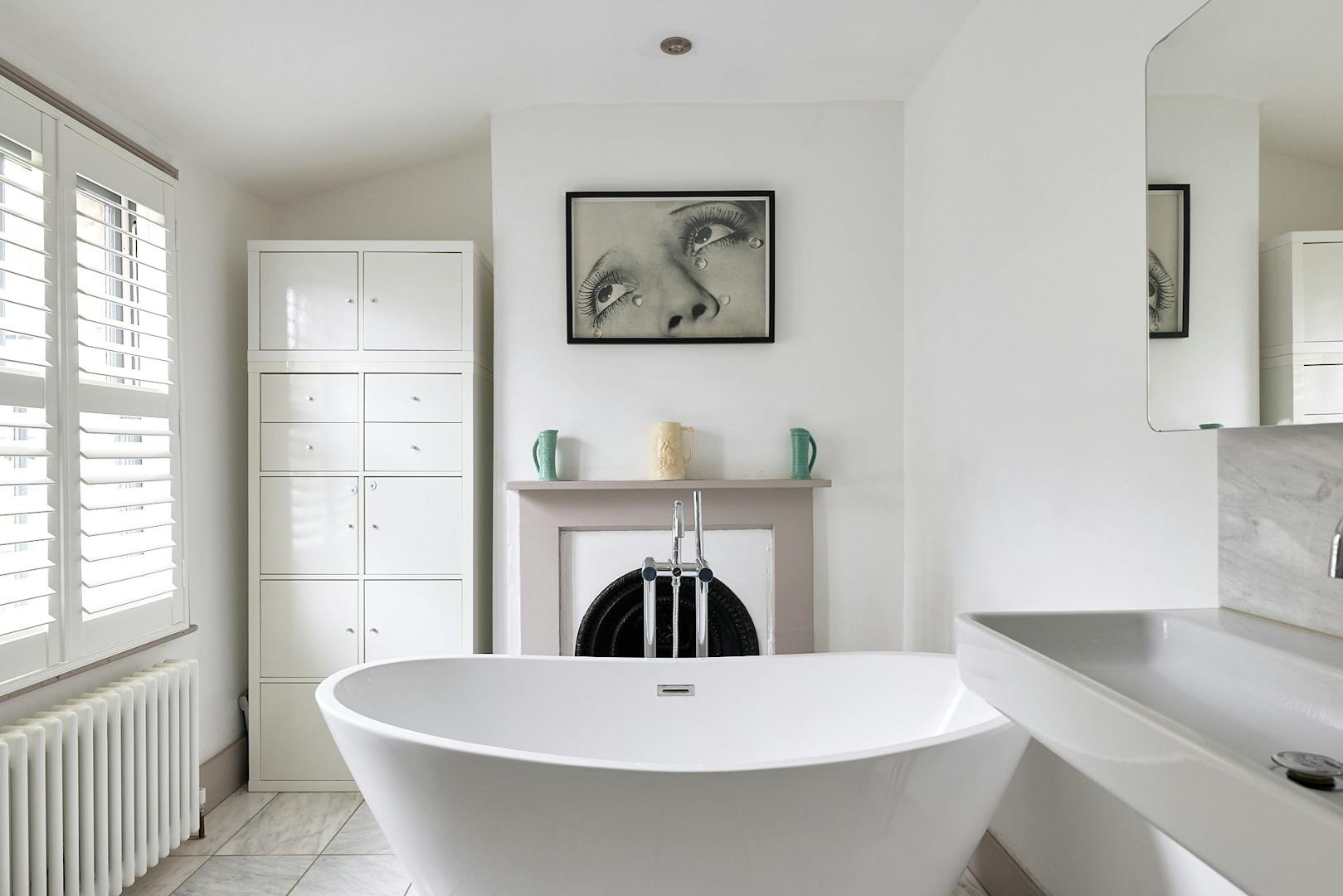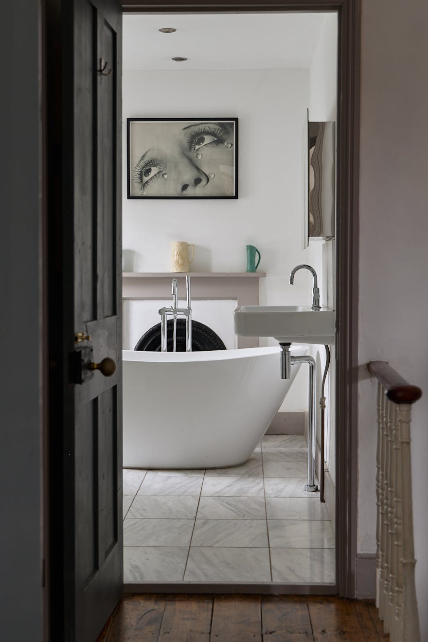 Ascending the staircase to the first floor, two of the bedrooms enjoy views of the tree-lined park through original sash windows. Subtle heritage tones are used throughout, with soft grey and navy hues highlighting the woodwork and fireplace mantels. At the rear, the main bathroom overlooks the garden and is accompanied by an additional shower room. This floor also includes a third bedroom and a separate storage room.