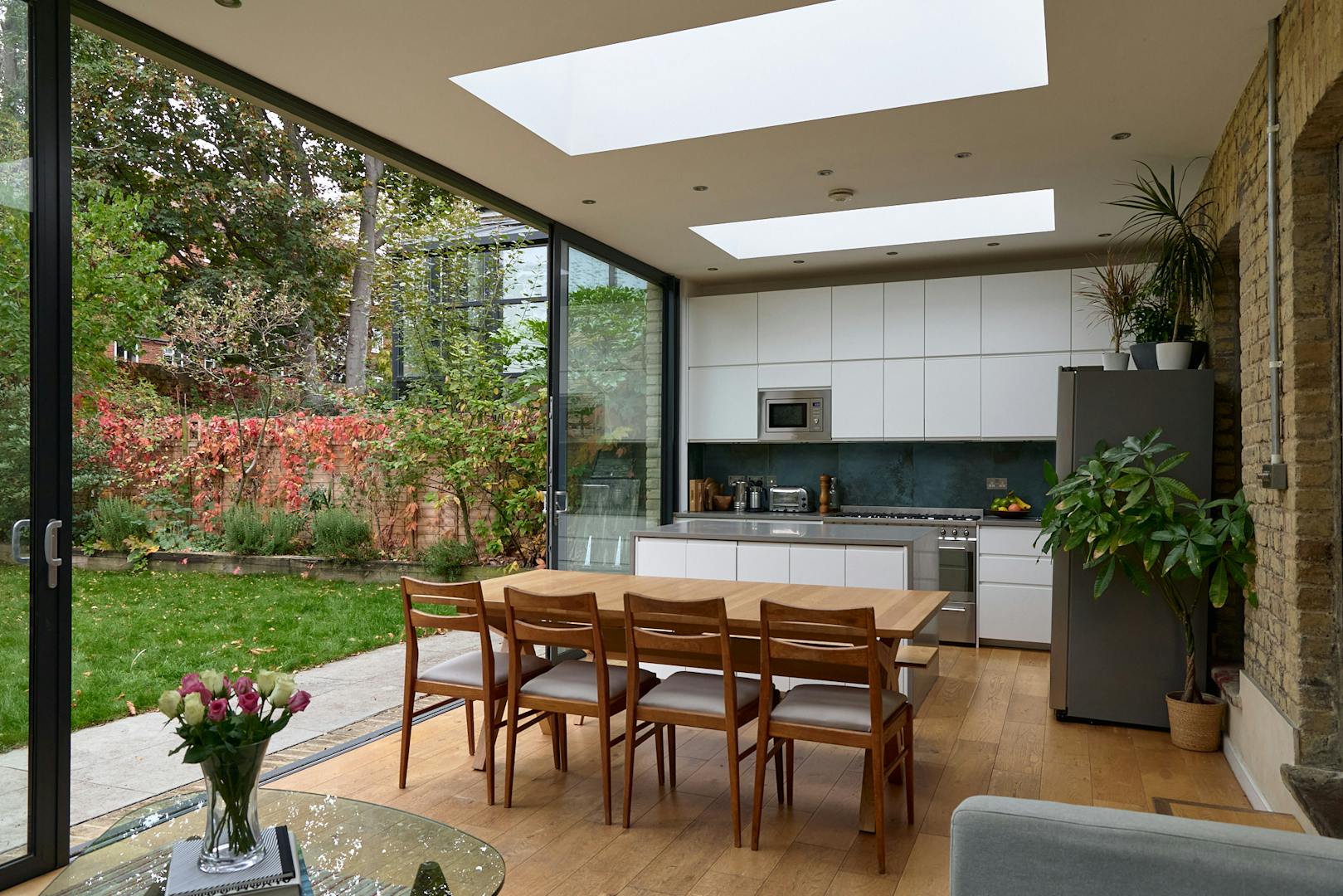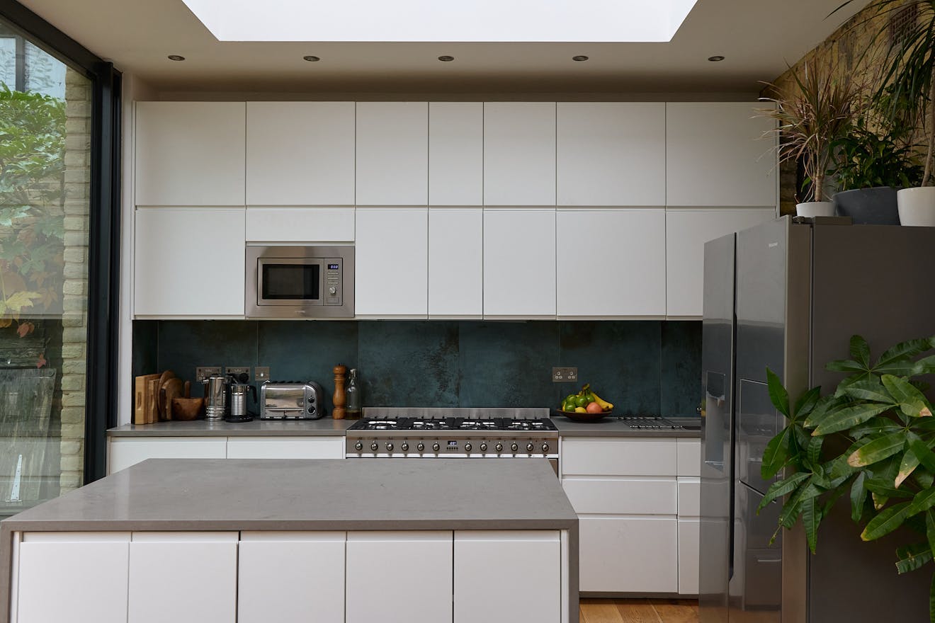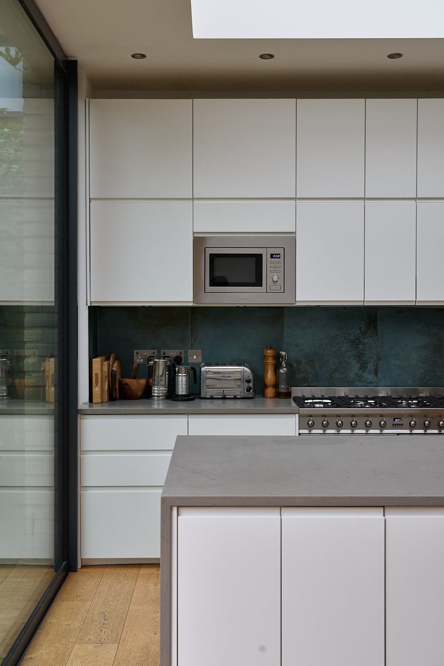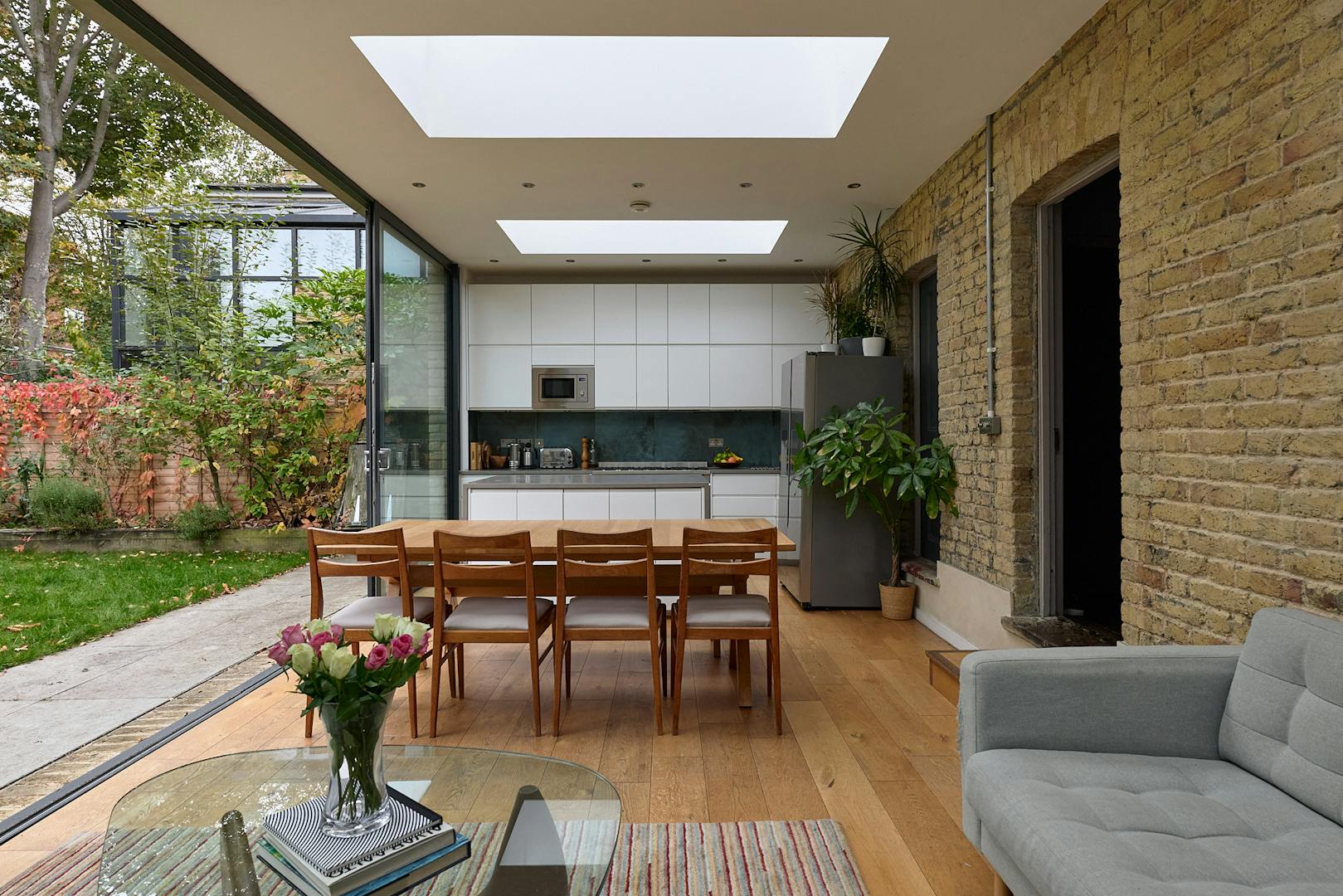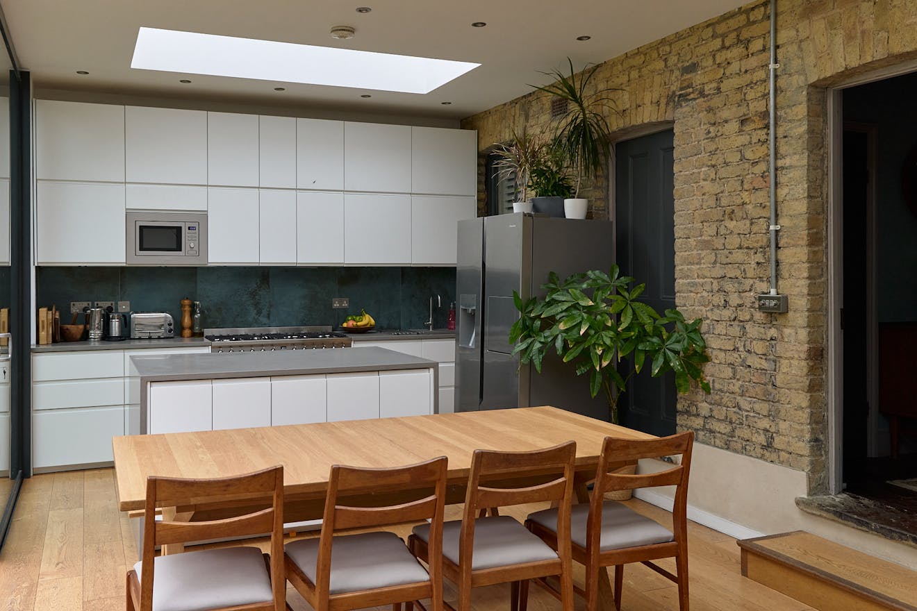 Set well back from the road behind a generous front garden, the ground floor is arranged as a series of versatile reception rooms. At the front of the plan, two rooms feature wide original floorboards, four-panel doors and working fireplaces. A clear sightline from the hallway leads through an additional reception room to the modern rear extension, which runs the width of the home. This space is accessed via a subtle change in level, designed to maximise ceiling height, where a trio of skylights draws in abundant natural light. To the right, a sleek run of integrated white kitchen appliances, along with a SMEG gas oven, is complemented by a generous island, while a discreet door reveals a practical shower room, WC, and utility area. Expansive sliding glass doors retract to create a seamless connection between indoors and out, inviting effortless enjoyment of the garden. The space is wonderfully adaptable, with ample room for both relaxed seating and dining.