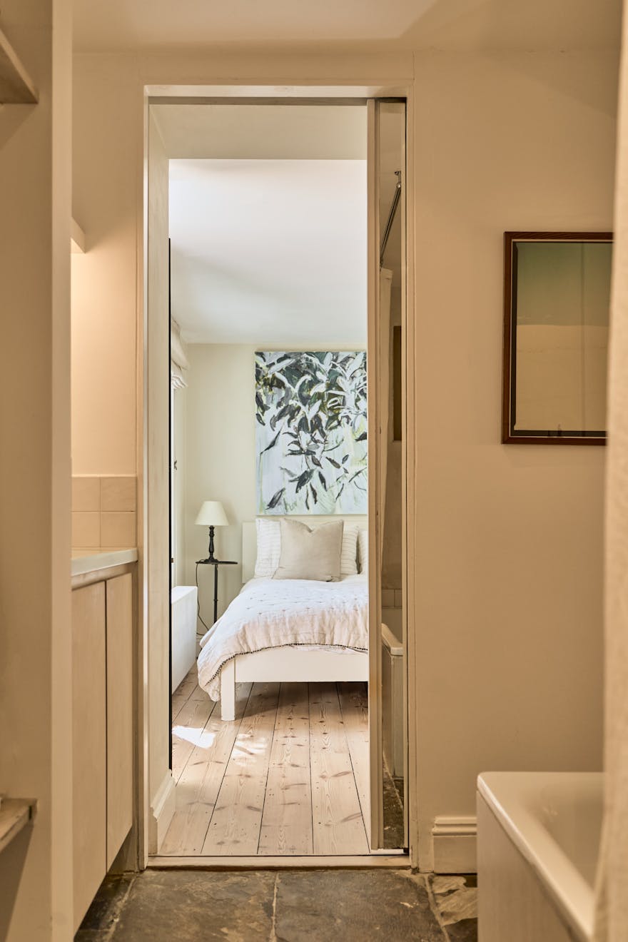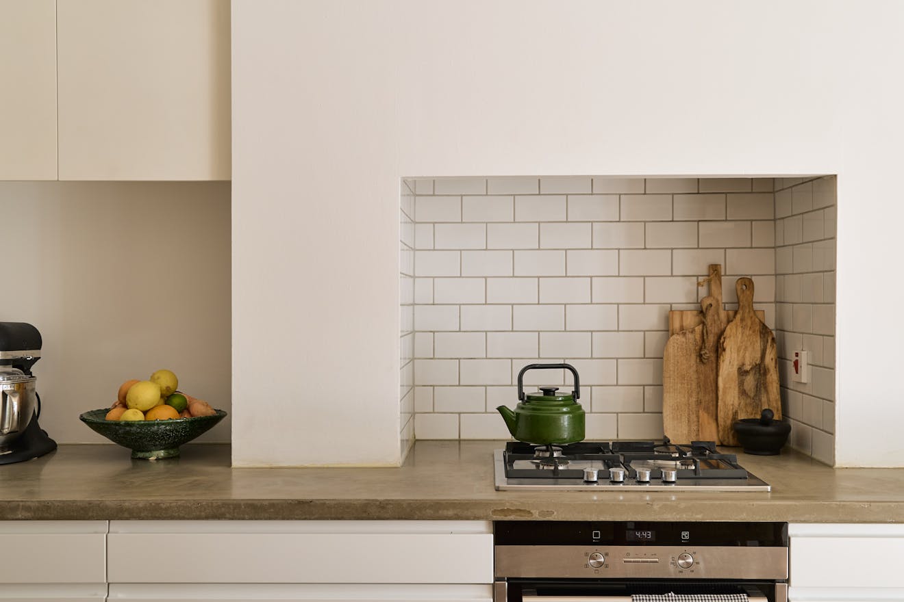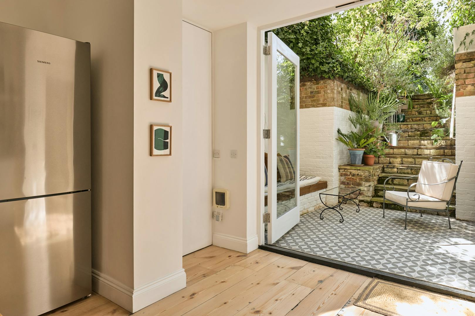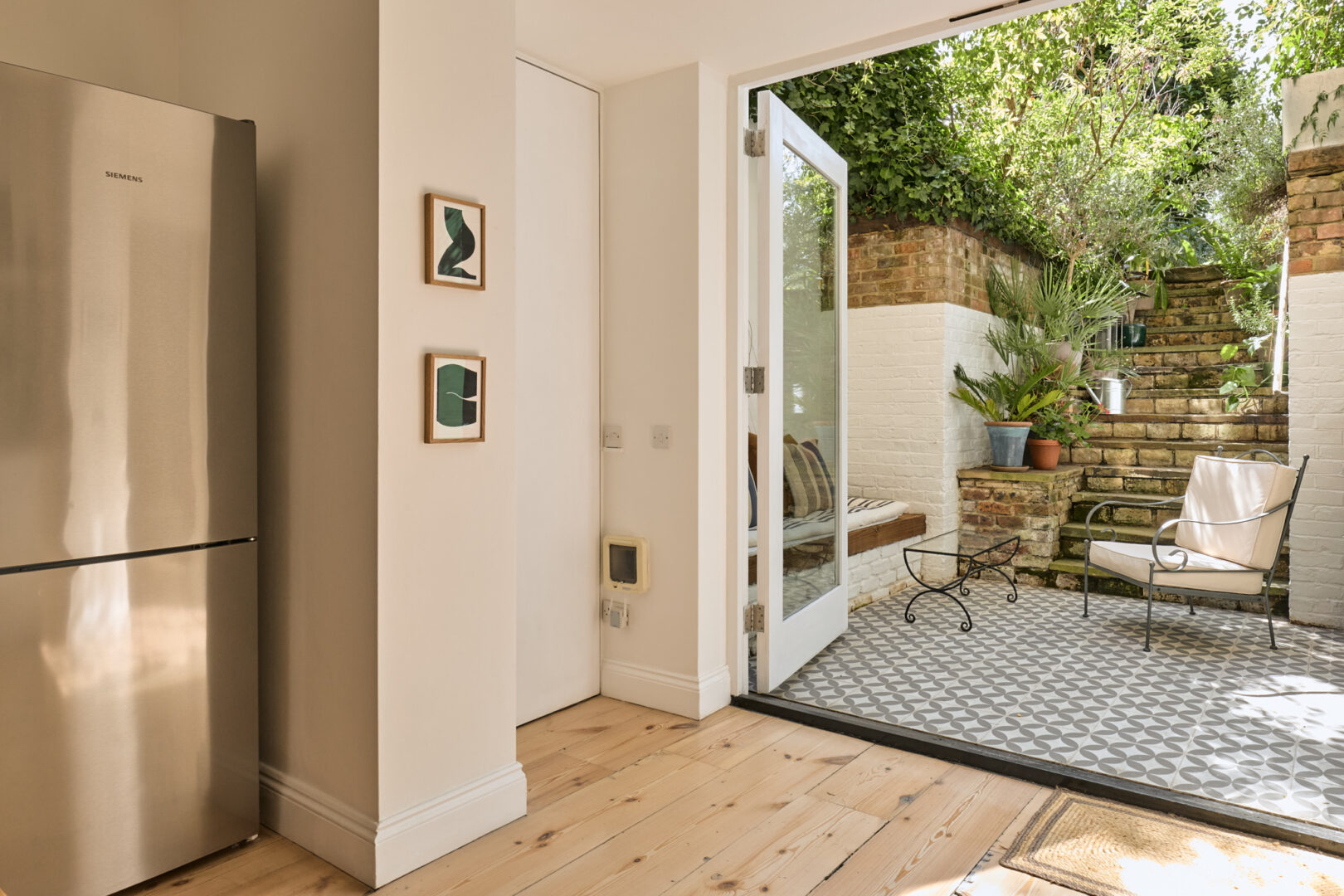 South-facing and bathed in natural light, the kitchen opens via double glass doors to a walled patio garden. Statement floor tiles, built-in seating and space for outdoor dining make this a private and serene spot for morning coffee or summer evenings with friends.