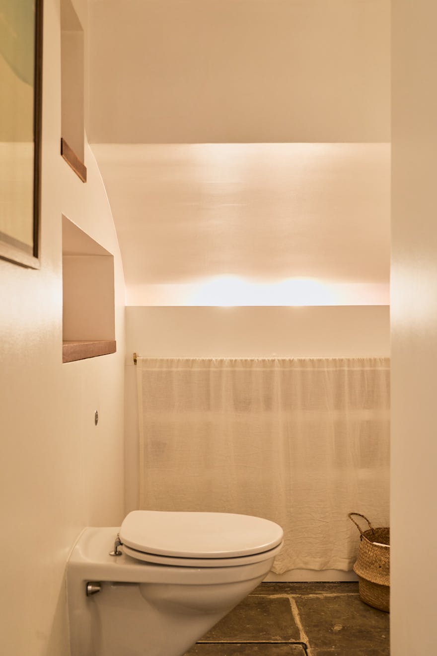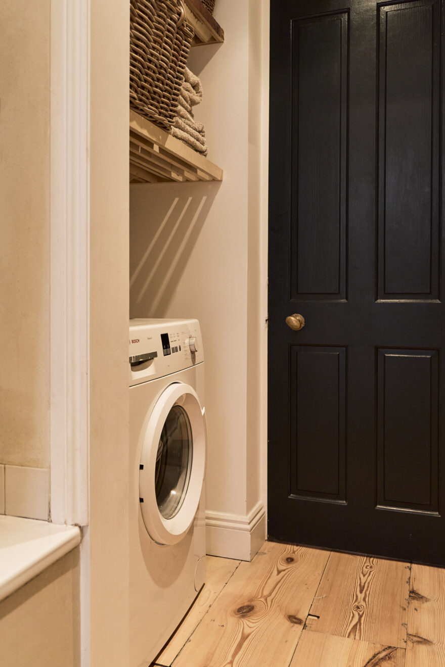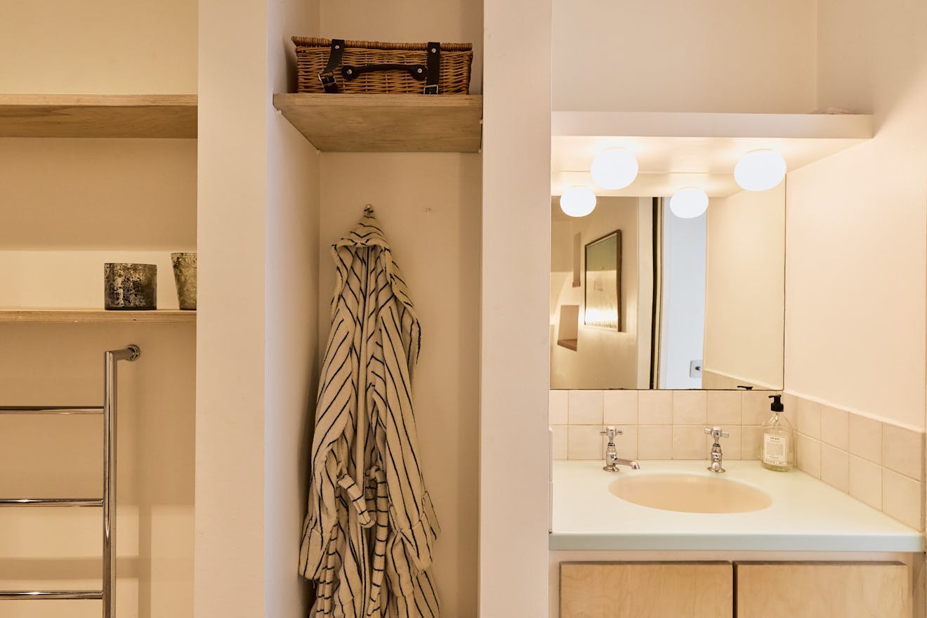 The double bedroom is a bright, restful retreat, with full-height modern wardrobes maximising storage. The adjoining en-suite bathroom has a clean, neutral palette - a combination bath and shower, stone flooring, plywood cabinetry and rendered walls lend a quietly contemporary feel. A discreet utility area sits just beyond, adding to the home’s practicality.