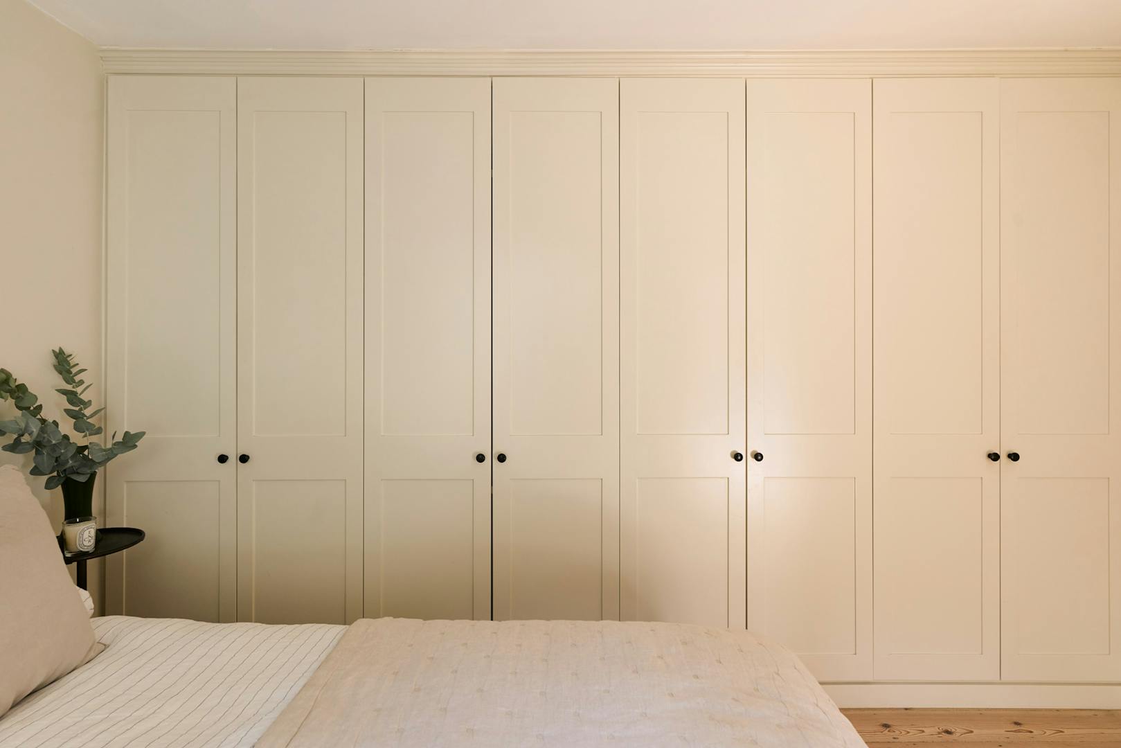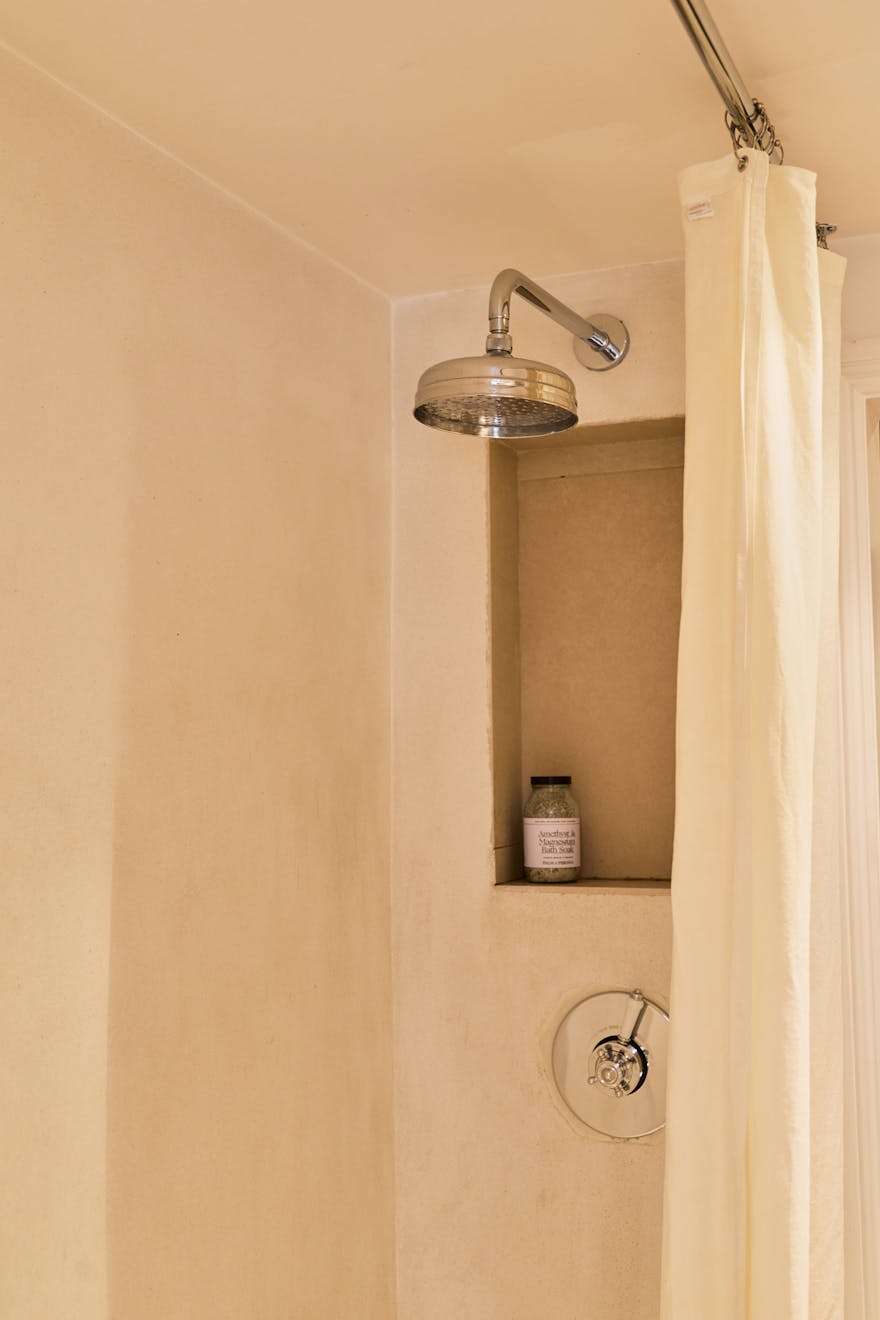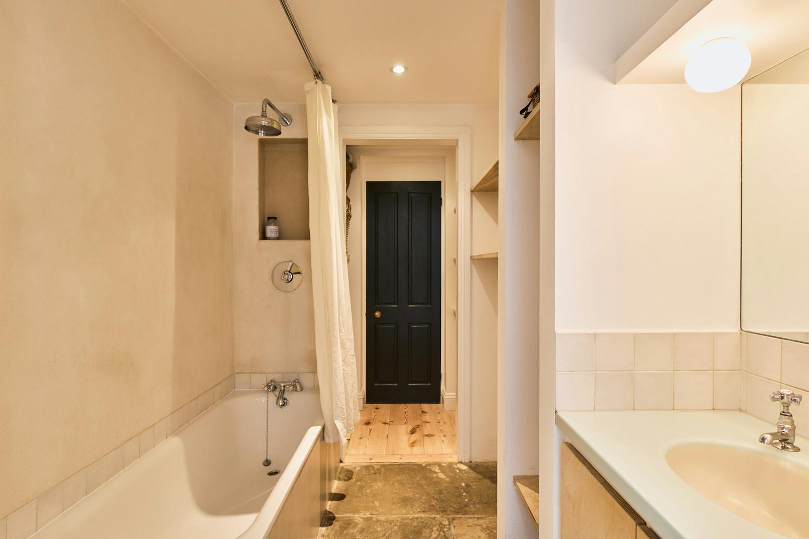 The double bedroom is a bright, restful retreat, with full-height modern wardrobes maximising storage. The adjoining en-suite bathroom has a clean, neutral palette - a combination bath and shower, stone flooring, plywood cabinetry and rendered walls lend a quietly contemporary feel. A discreet utility area sits just beyond, adding to the home’s practicality.