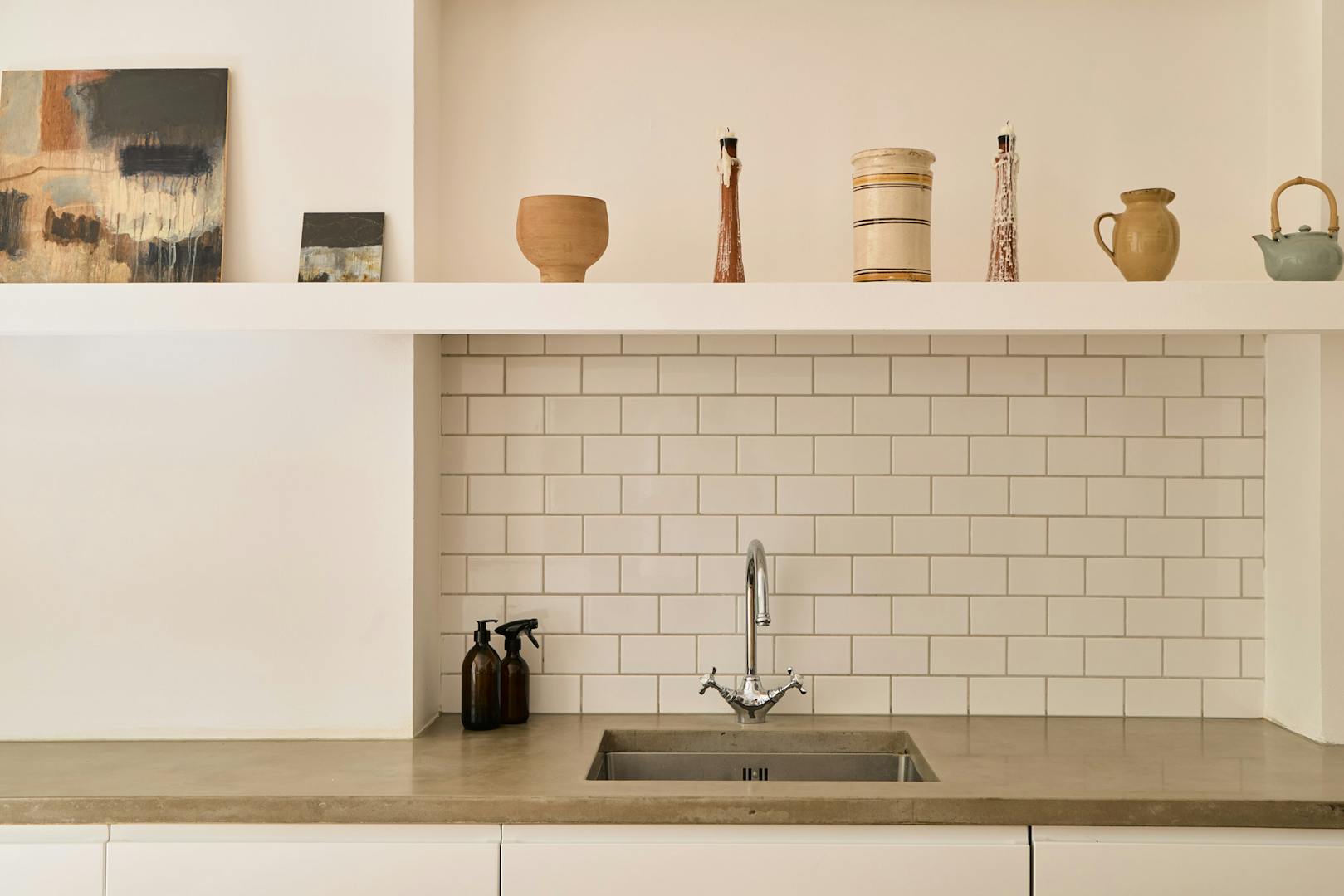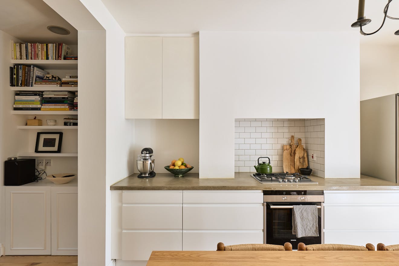 The layout has been carefully considered, each room feels distinct, yet the spaces flow effortlessly together. The pared-back kitchen extends from the lounge, its white cabinetry and polished concrete counters creating a clean, contemporary aesthetic.