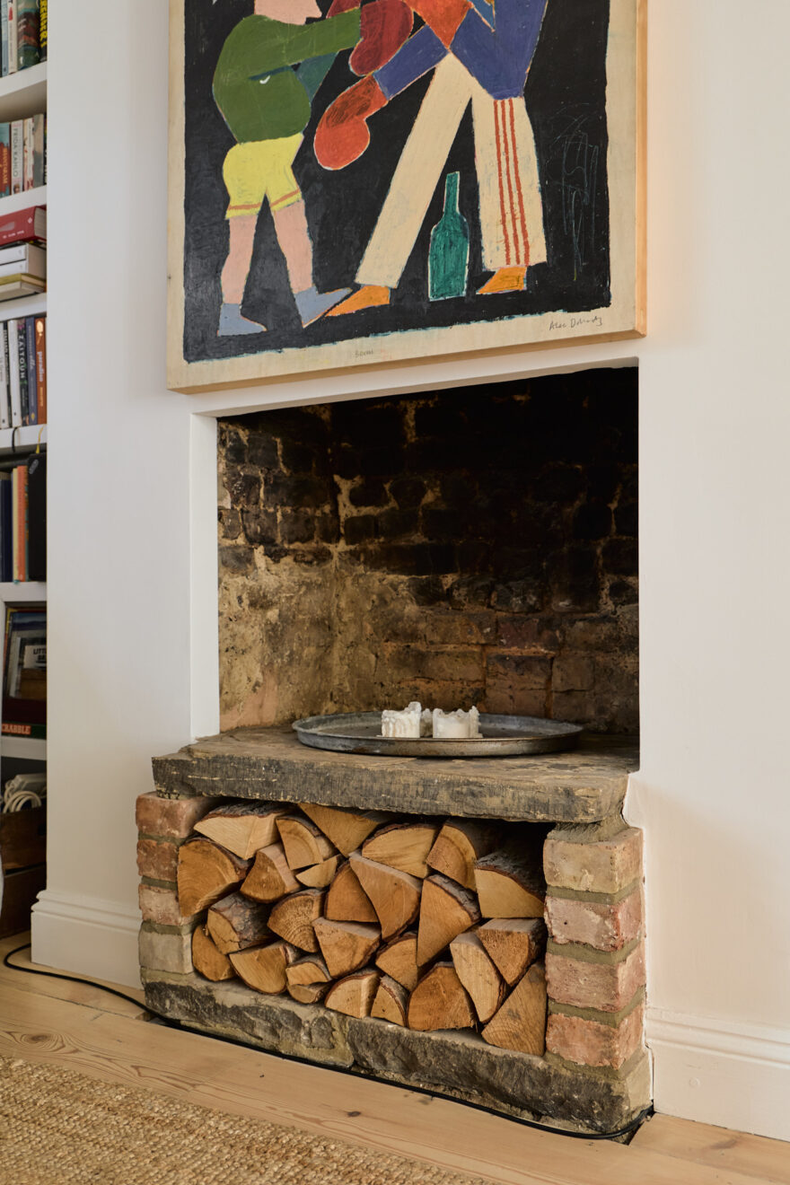 Inside, the generous living room is defined by wide, white-oiled floorboards and lofty ceilings that heighten the sense of space. At its heart, an exposed-brick fireplace with wood storage brings texture and character, equally suited to open fires or a log burner.