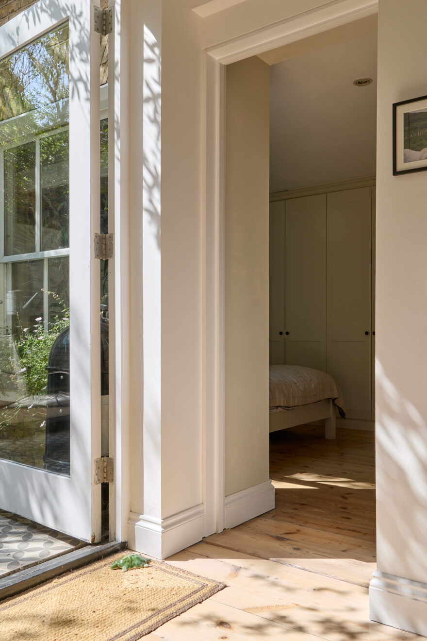 Dual aspect glazing, pale floorboards and a calm white palette bounces natural light throughout the space