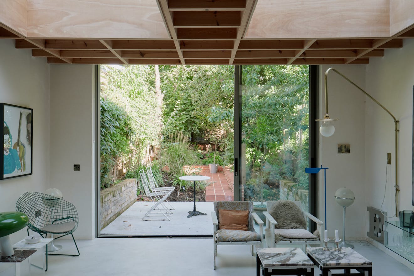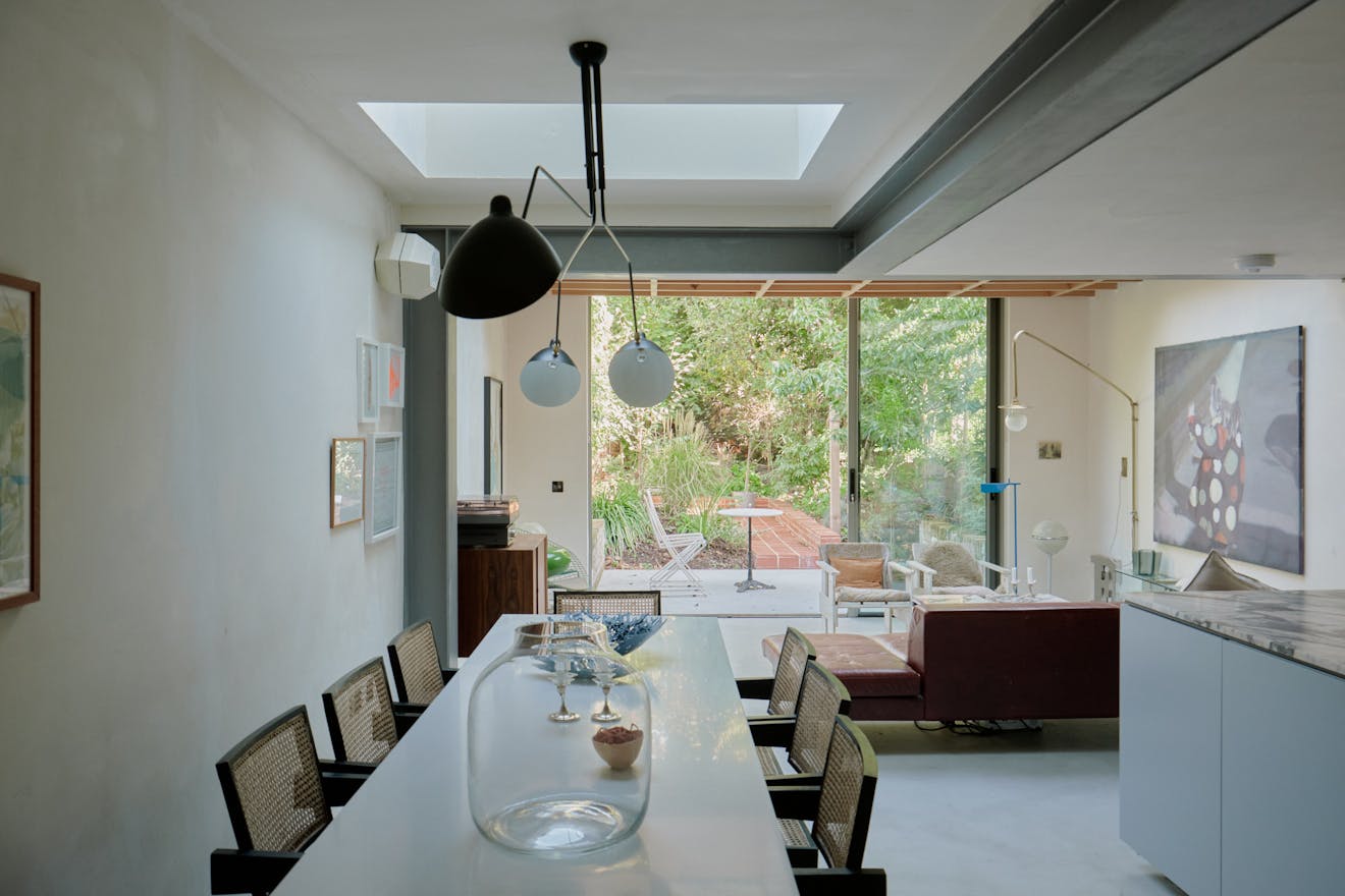 A transitional zone complete with built-in joinery and a convenient utility, creates a natural pause before the main living space unfolds. Here, architecture and atmosphere meet. Exposed timber beams play off against a steel joist and limewashed walls, while a run of skylights invites daylight to spill across the interiors throughout the day. At the rear, full-height sliding doors open onto the garden, blurring the line between house and nature.