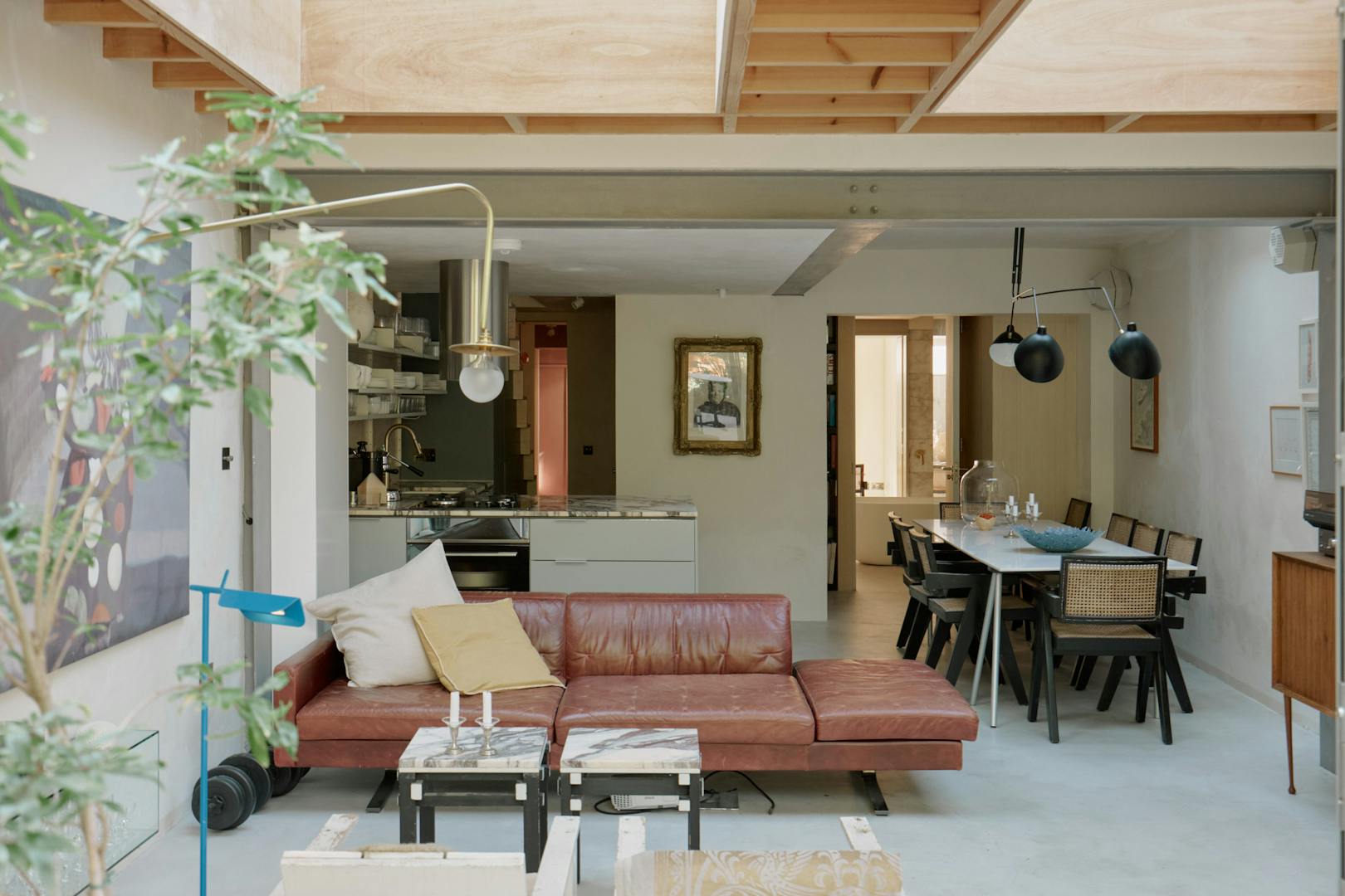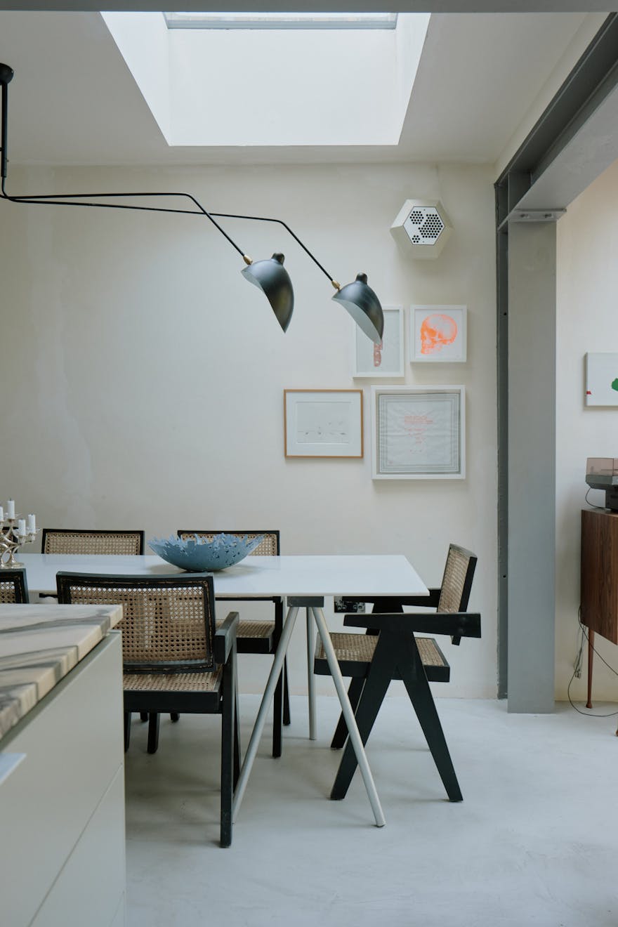 At the heart of the space, a marble-wrapped kitchen island invites easy conversation and communal cooking. A skylit dining area completes the scene, as suited to slow mornings as it is to evening gatherings.
